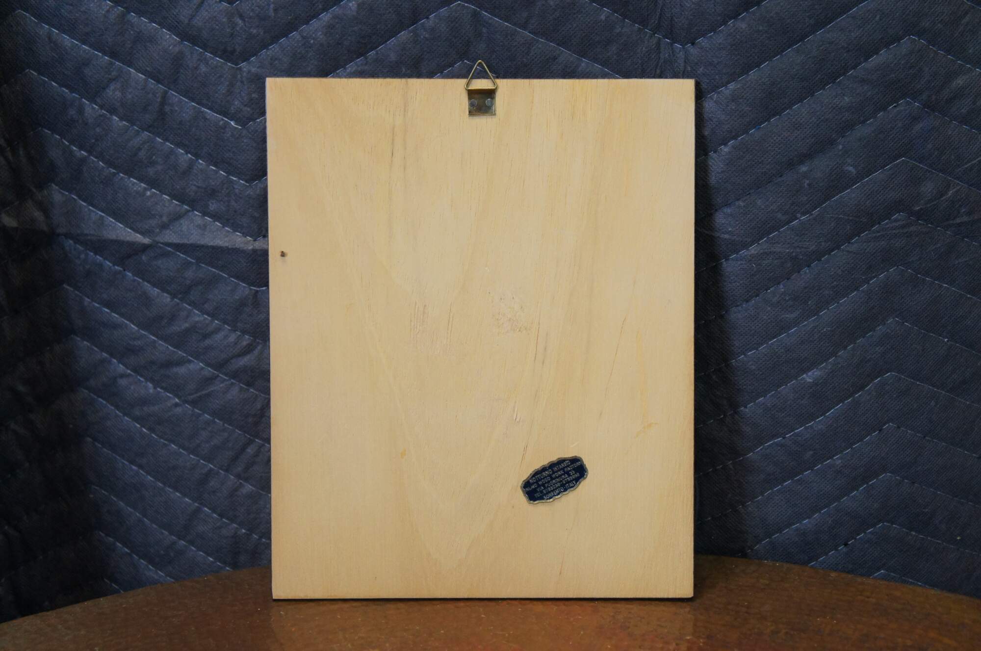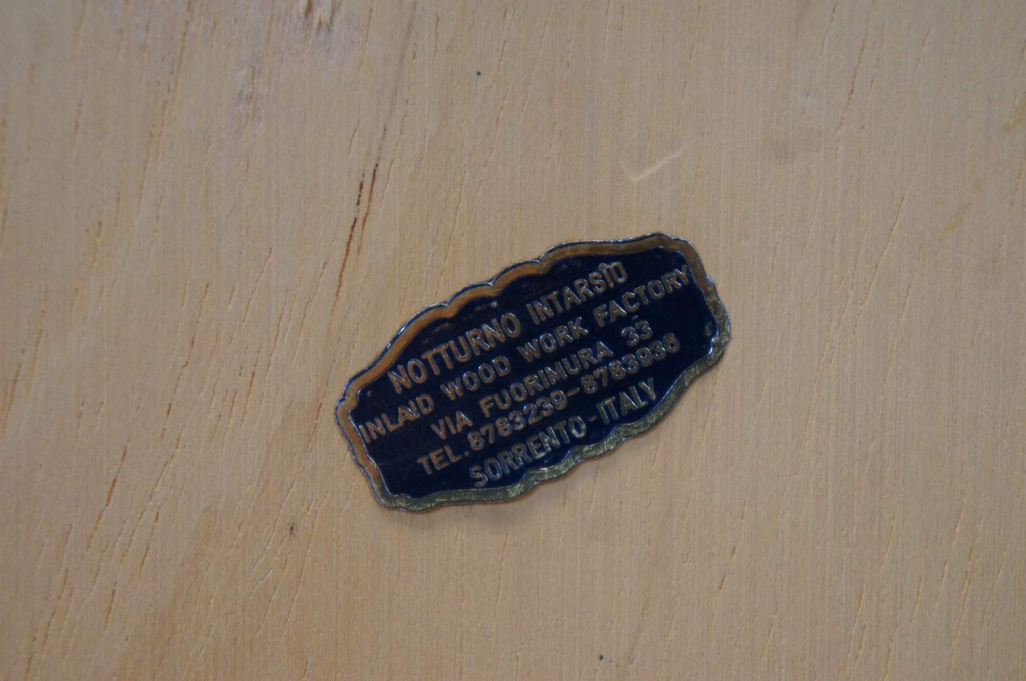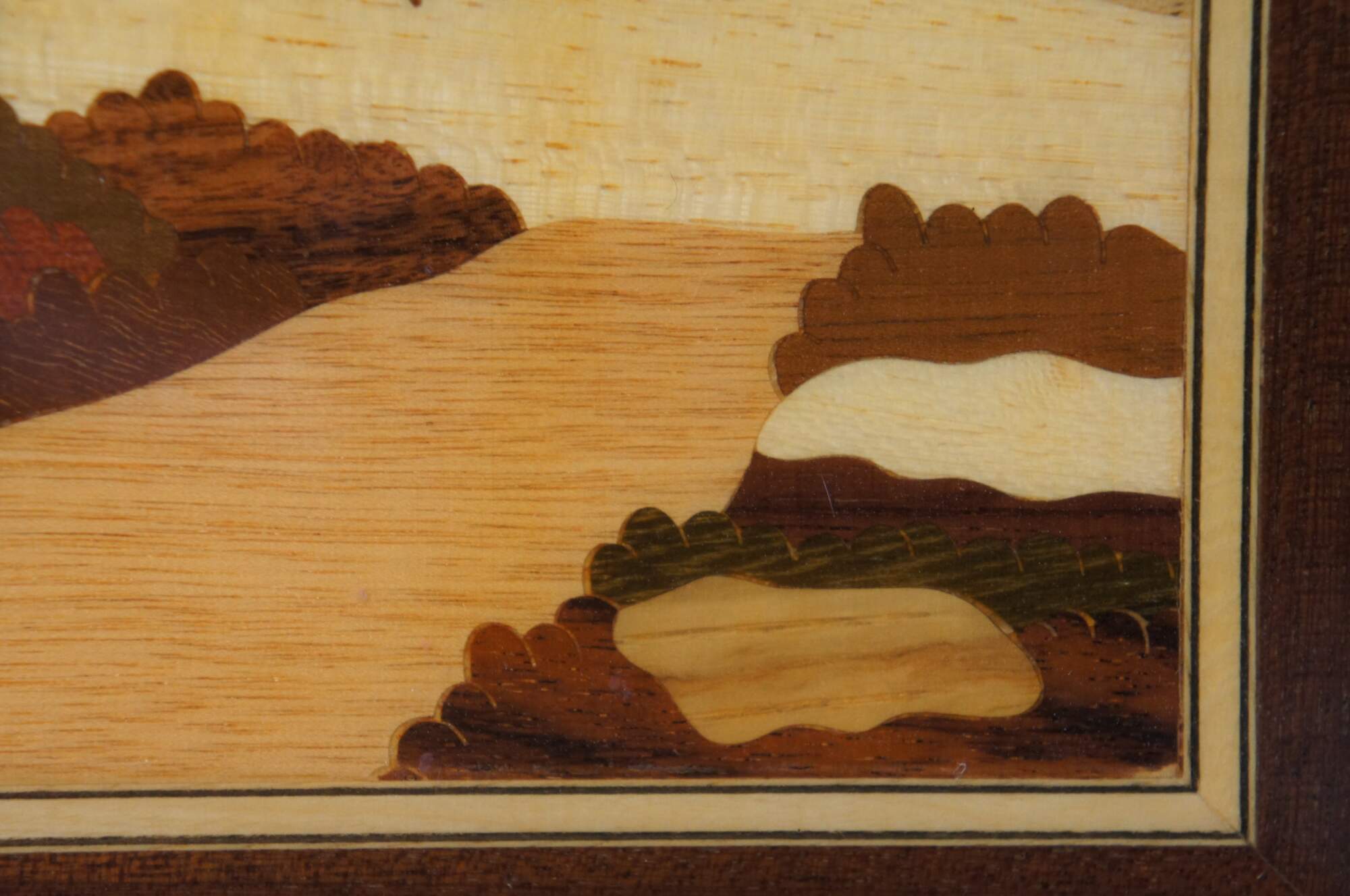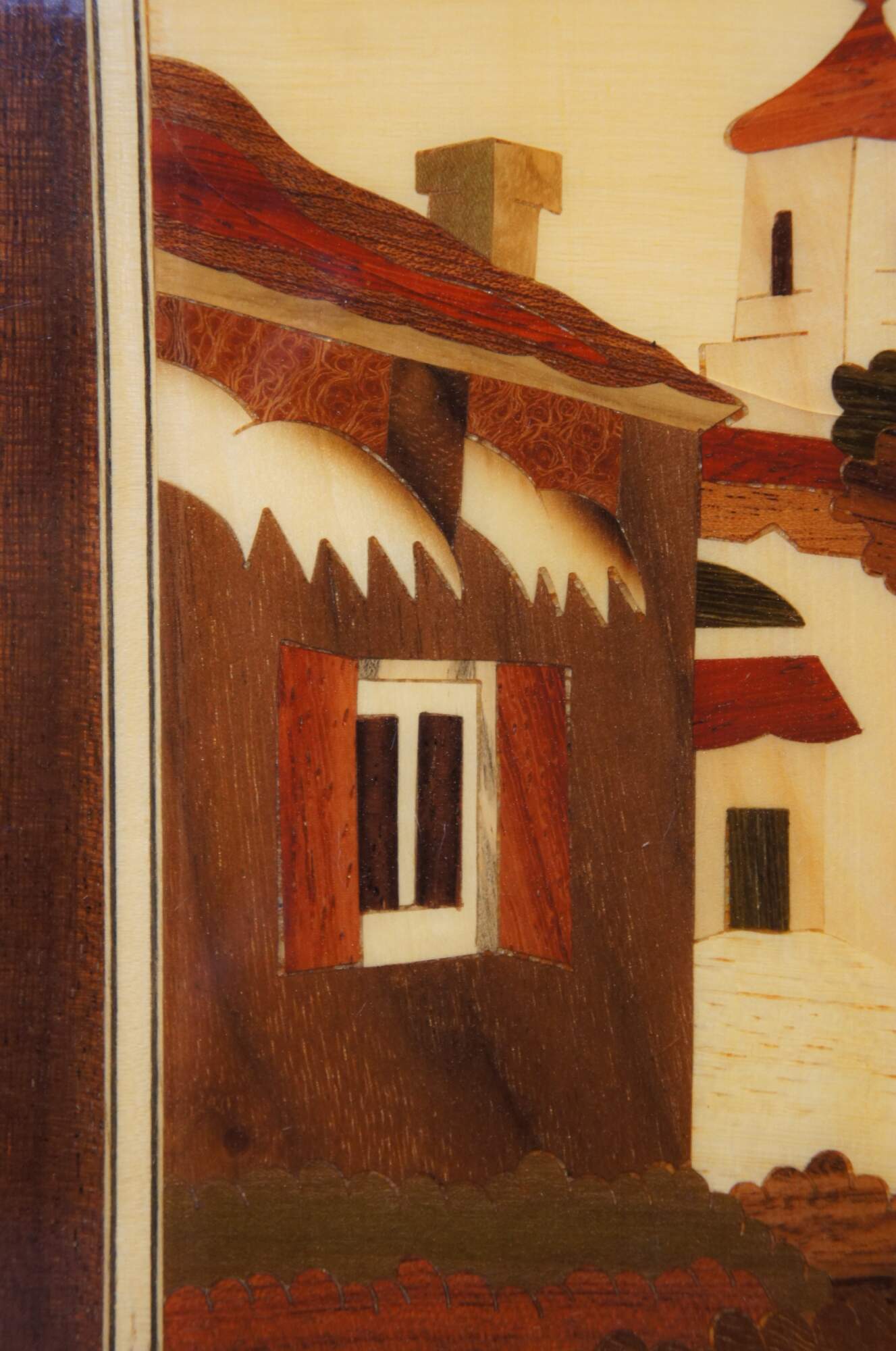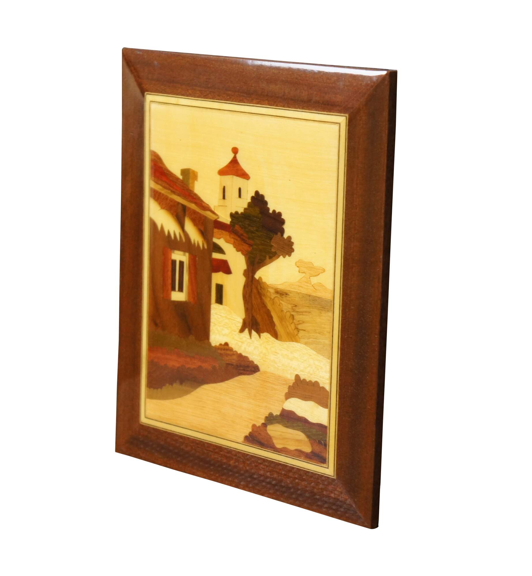 Mid to late 20th century Notturno Intarsio Inlaid Wood Work Factory wall plaque depicting a charming village landscape with a hightly polished finish. Made in Sorrento, Italy.