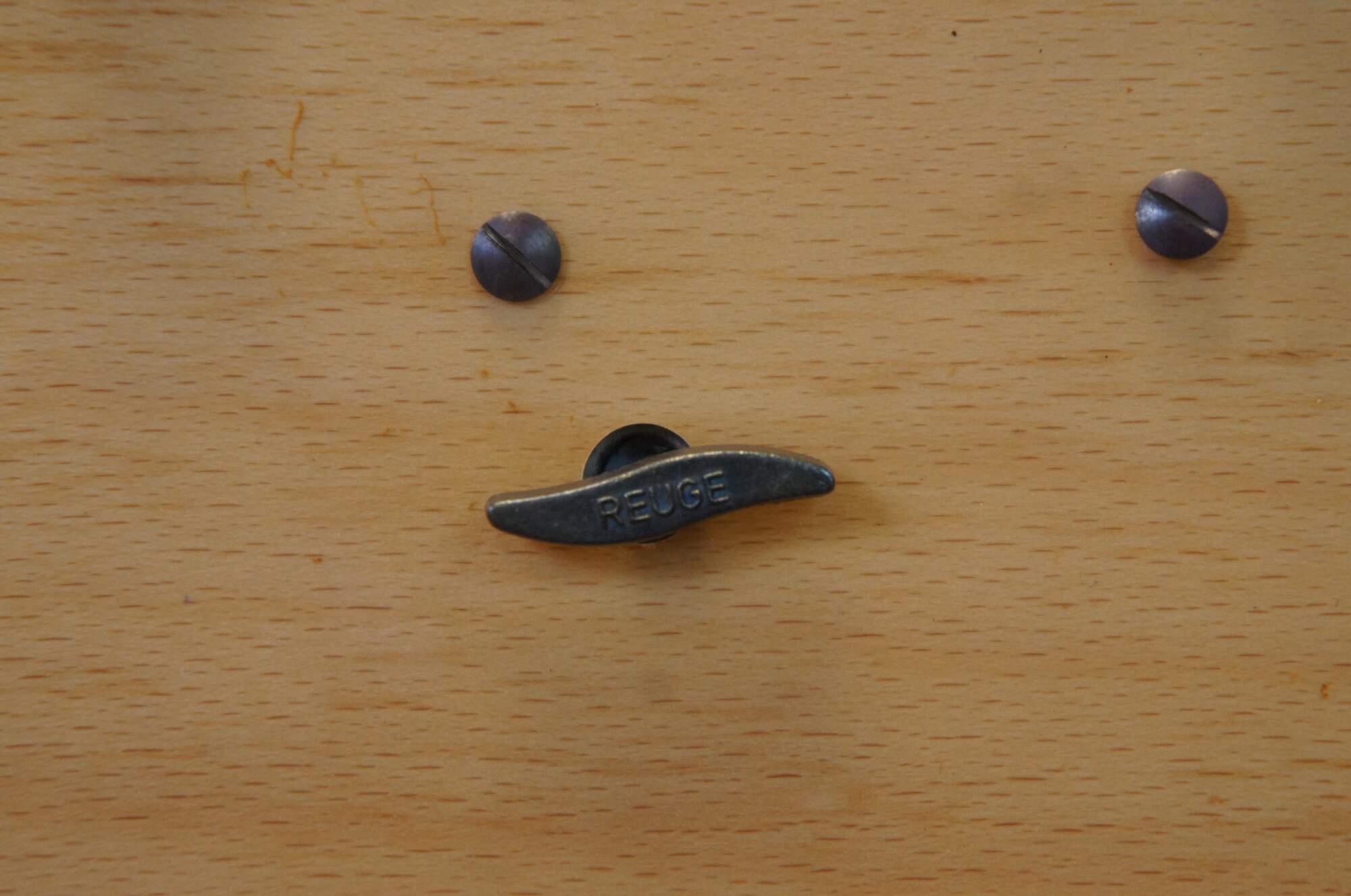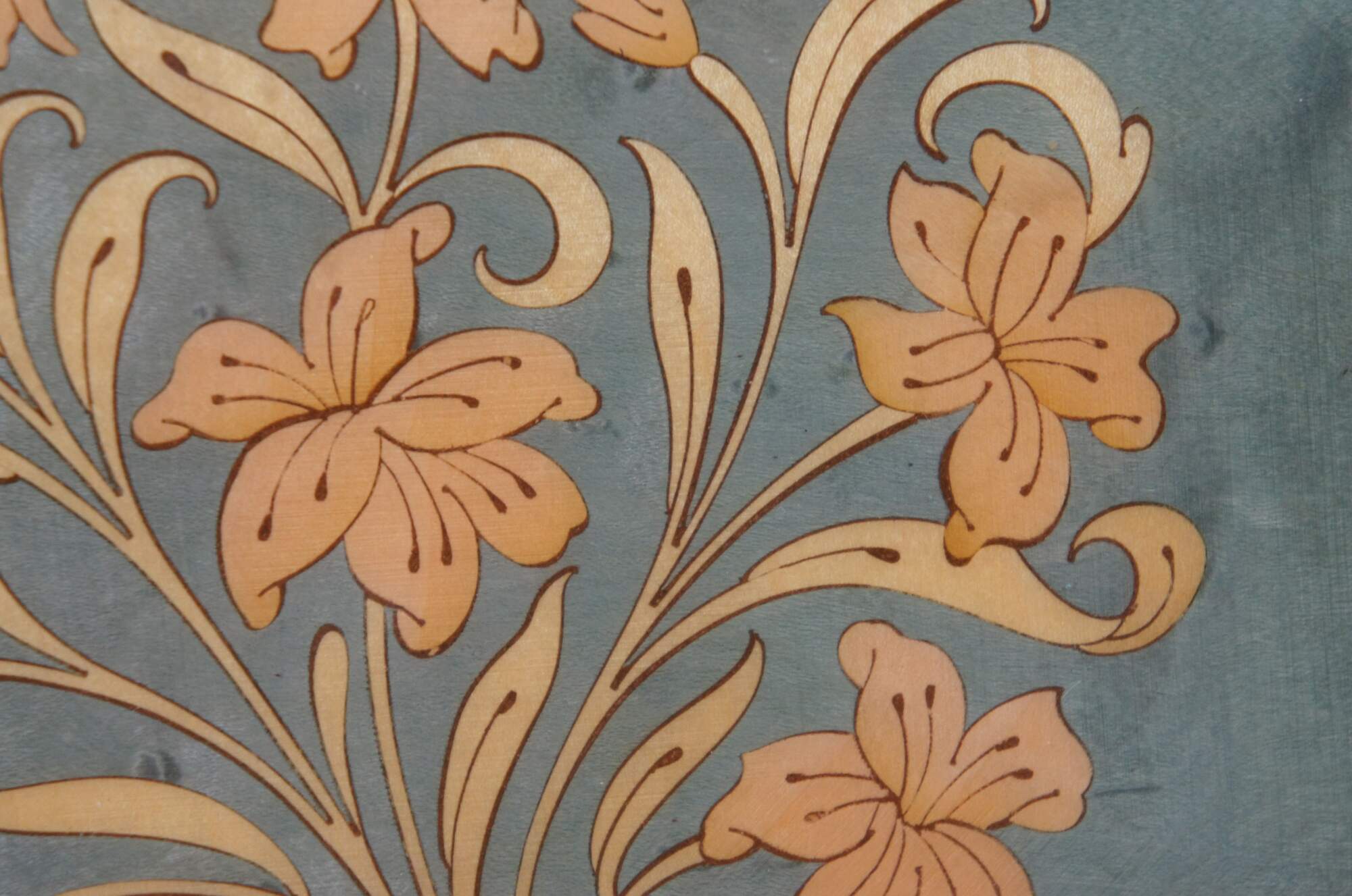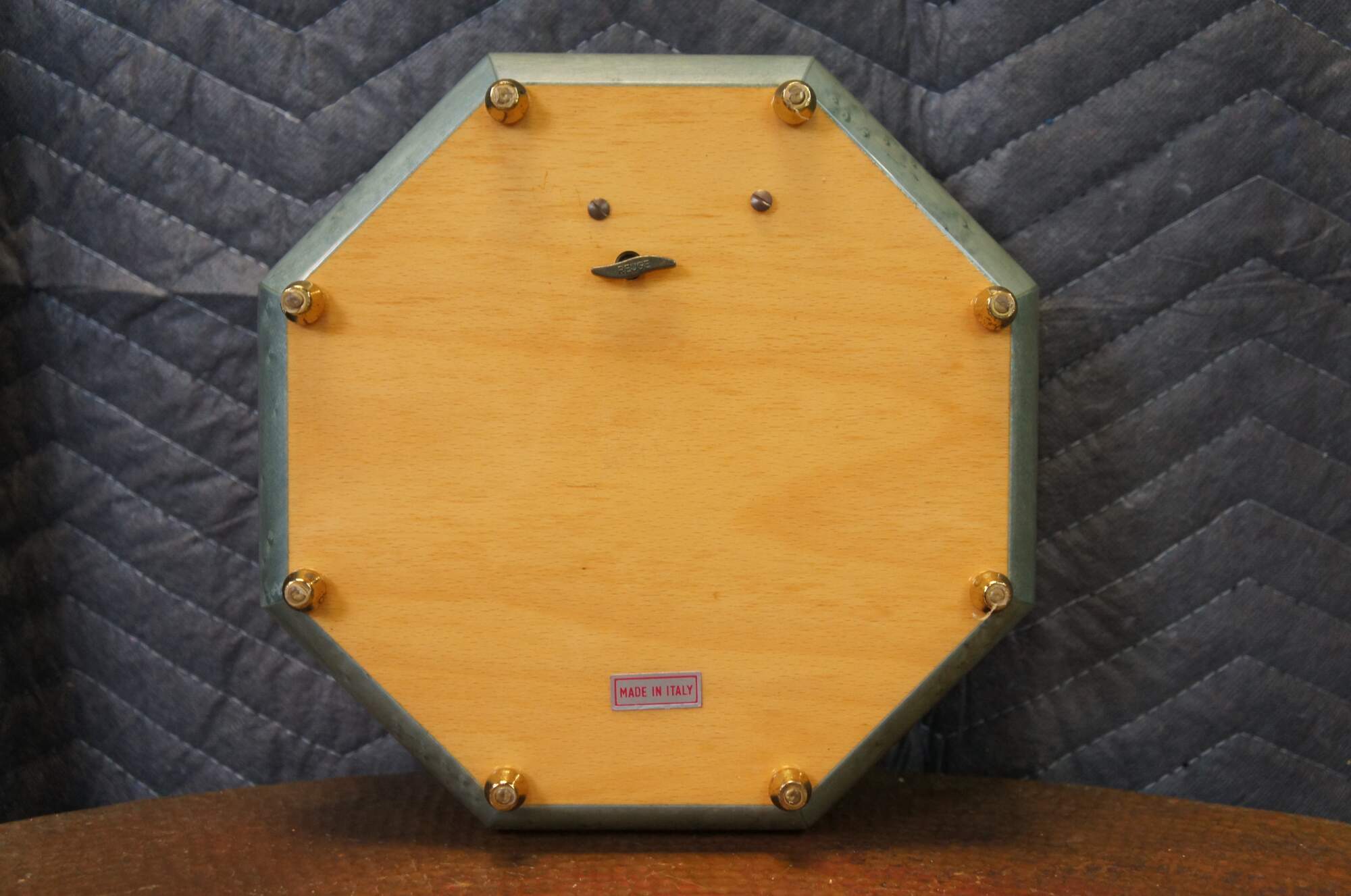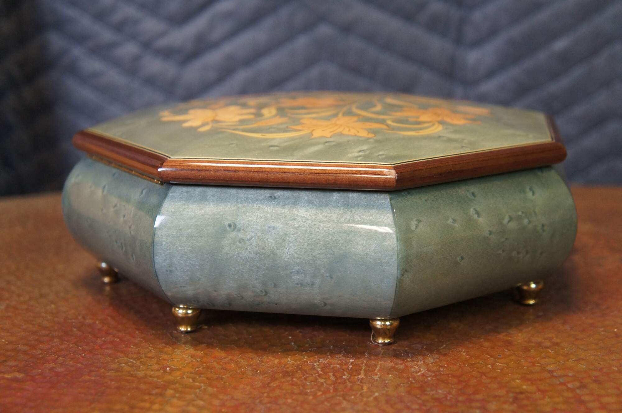 Late 20th century octagonal musical jewelry box crafted from birdseye maple with a pale green-blue color inlaid with a design of lilies and natural tone trim. Pink velvet interior. Includes key. Reuge music box works, plays "Somewhere Out There." Made in Italy.