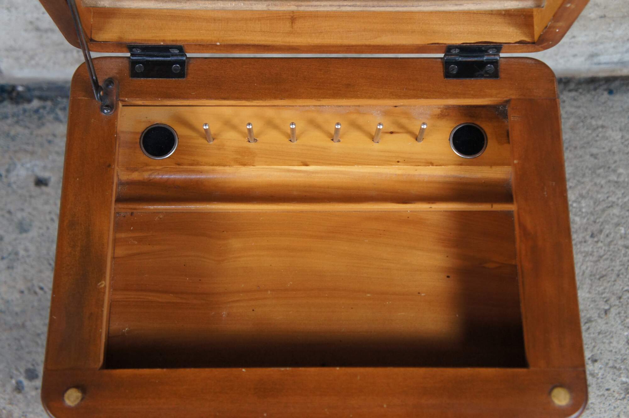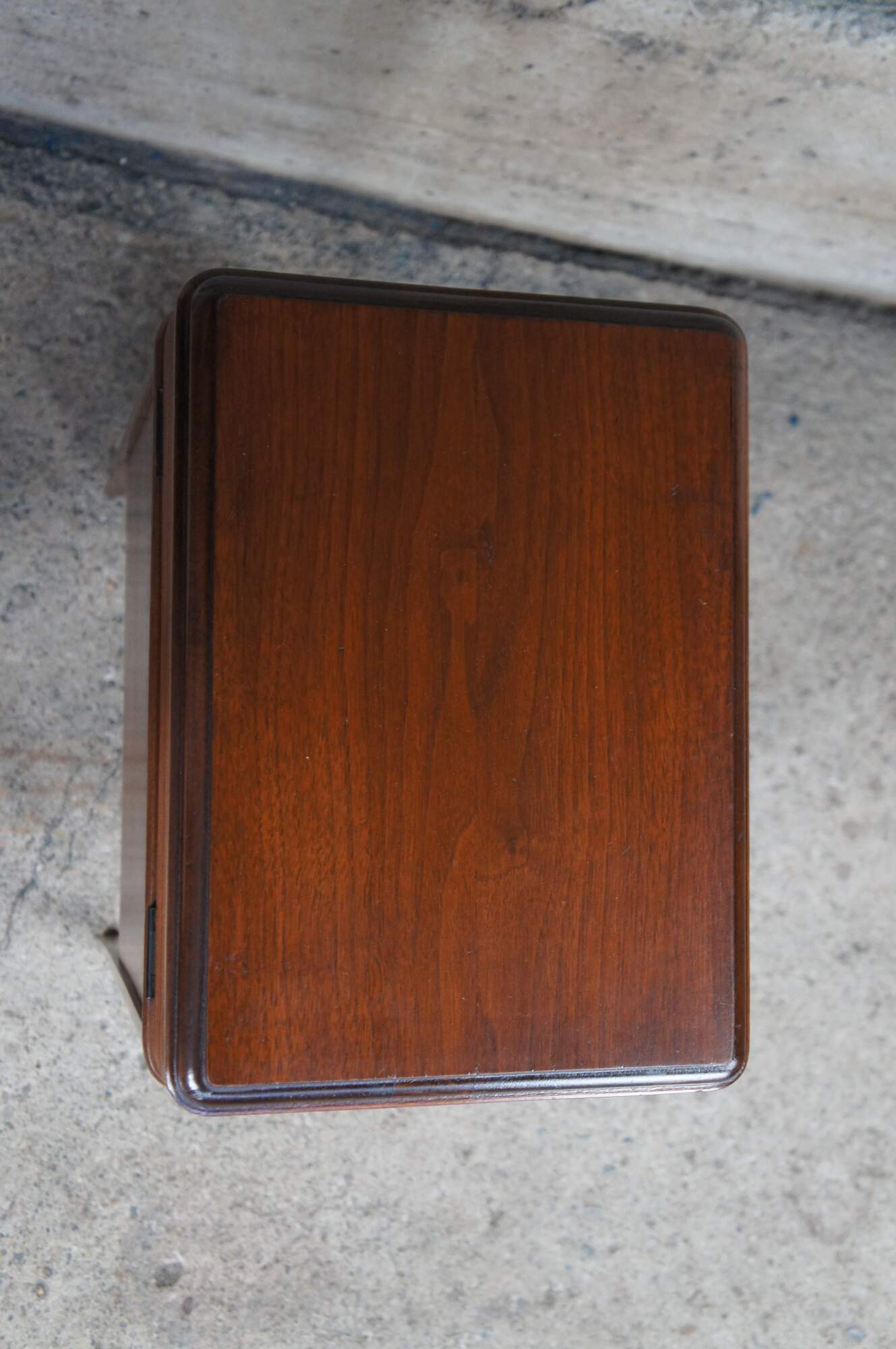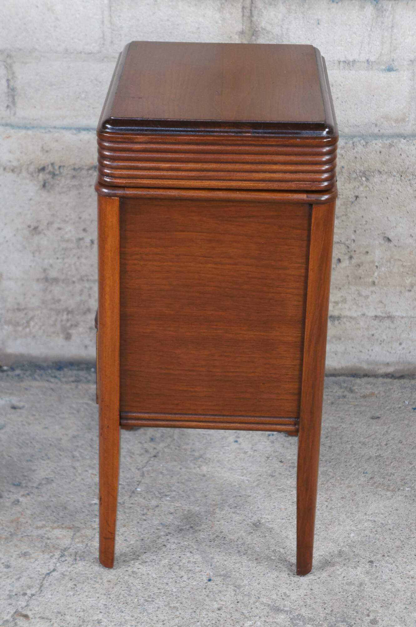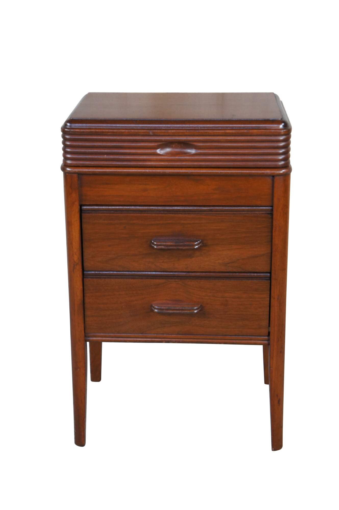 Circa 1940s spool cabinet by White Sewing of Toronto, Canada. Features a walnut frame with ribbed lid top opening to spool organizer. Lower case has two drawers over tapered legs. A fun piece that would also work well as a nightstand or side table in any mid century modern / Minimalist space.