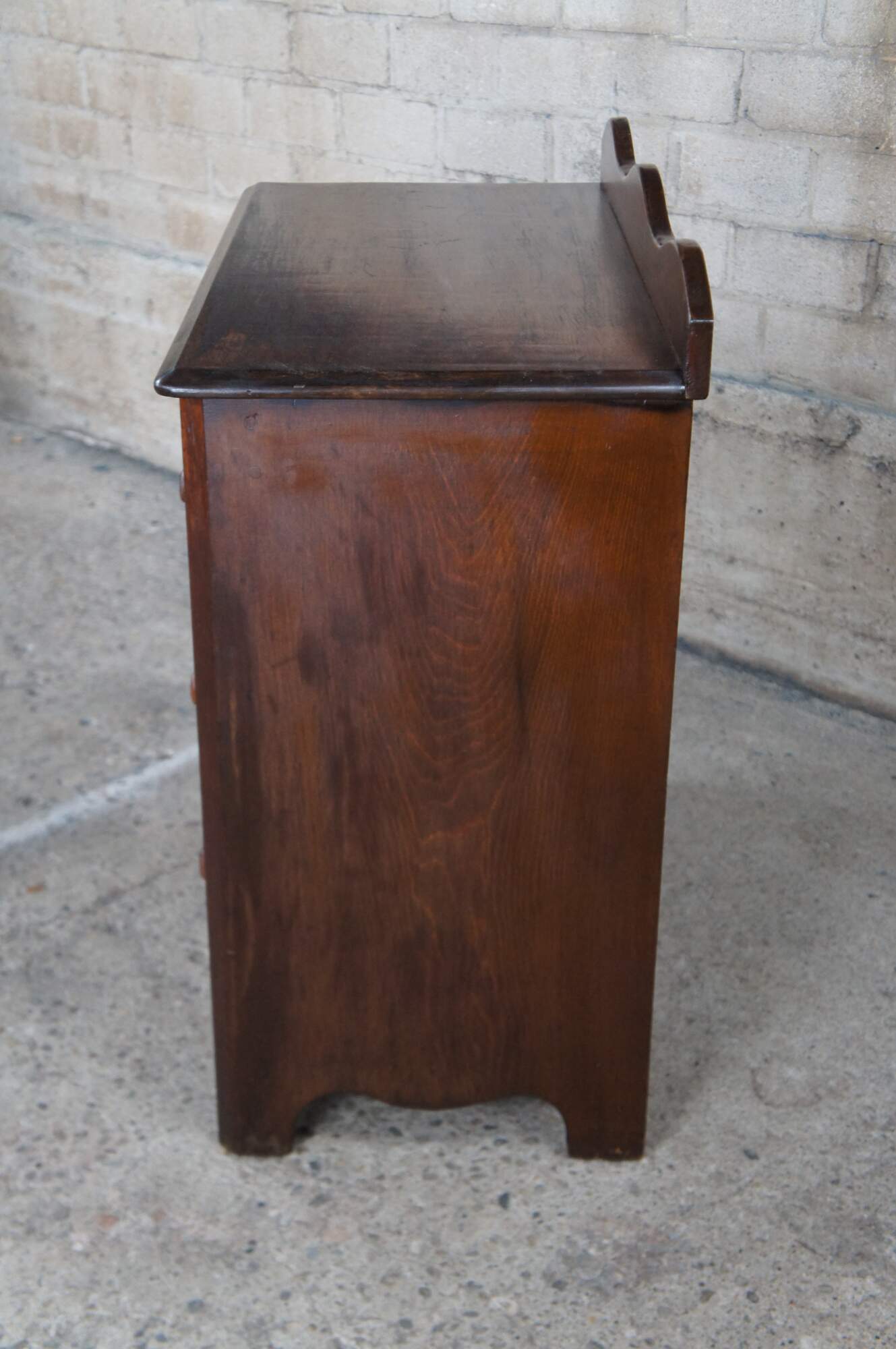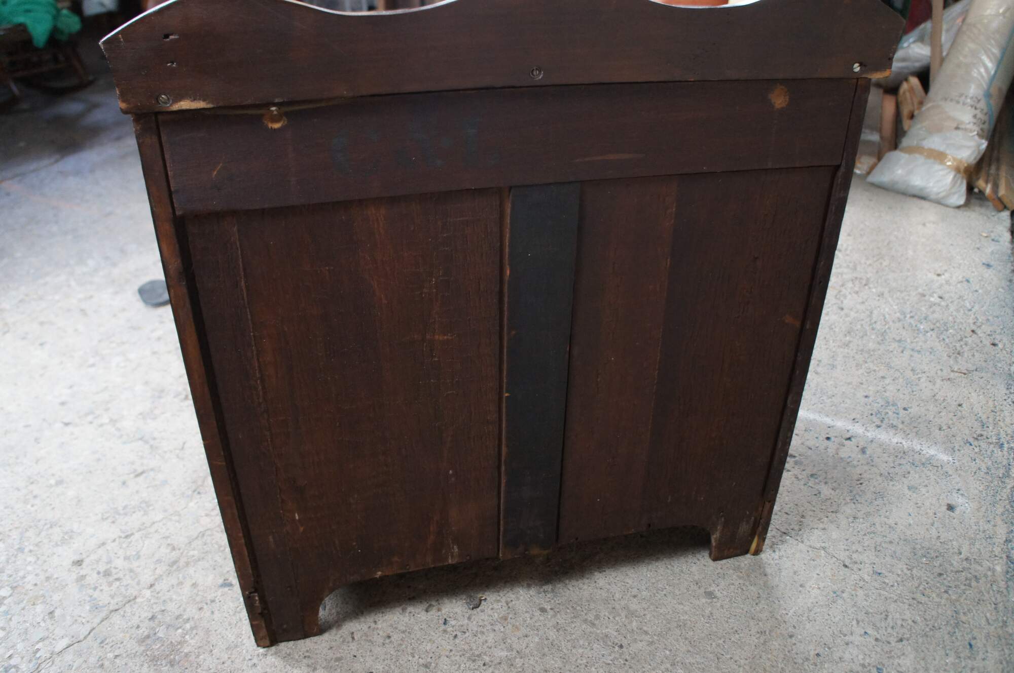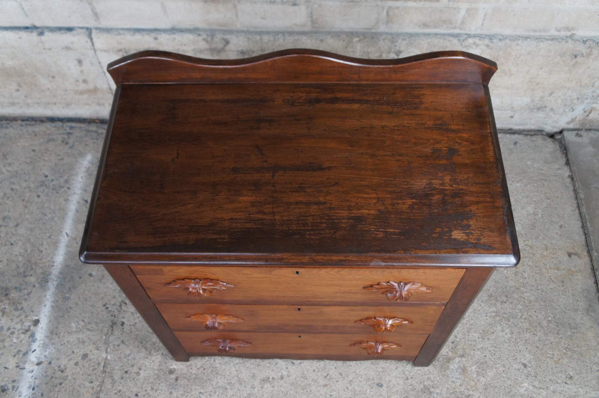 Antique Victorian chest of drawers, circa 1870s. Features a rectangular form made from walnut with a serpentine backsplash and three lower drawers. Drawers are hand dovetailed and include escutcheons and carved druit and nut pulls.