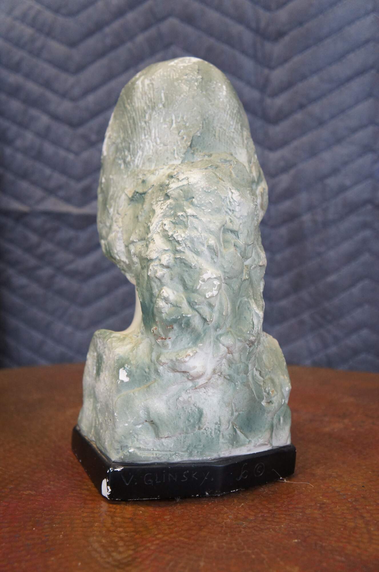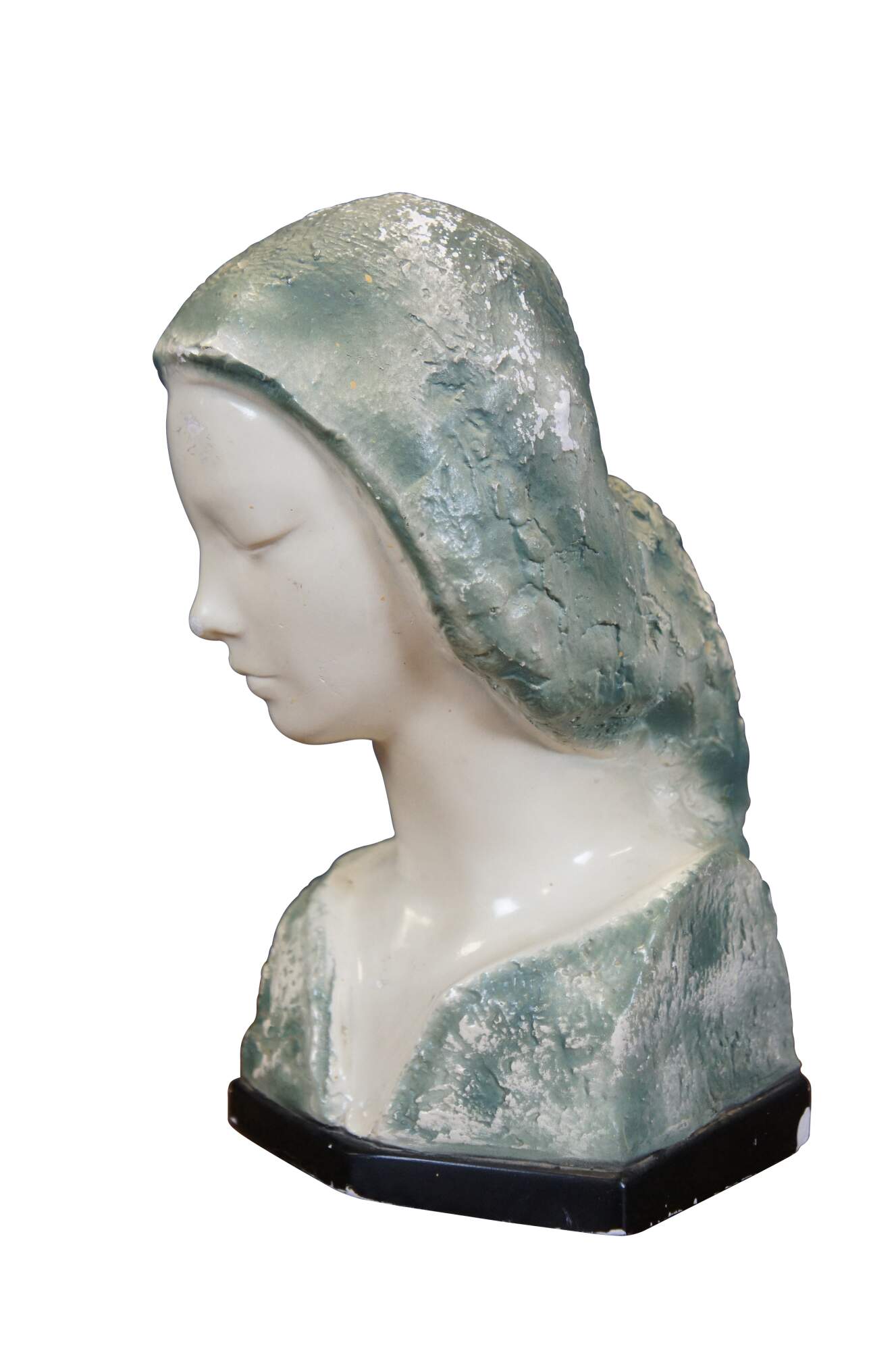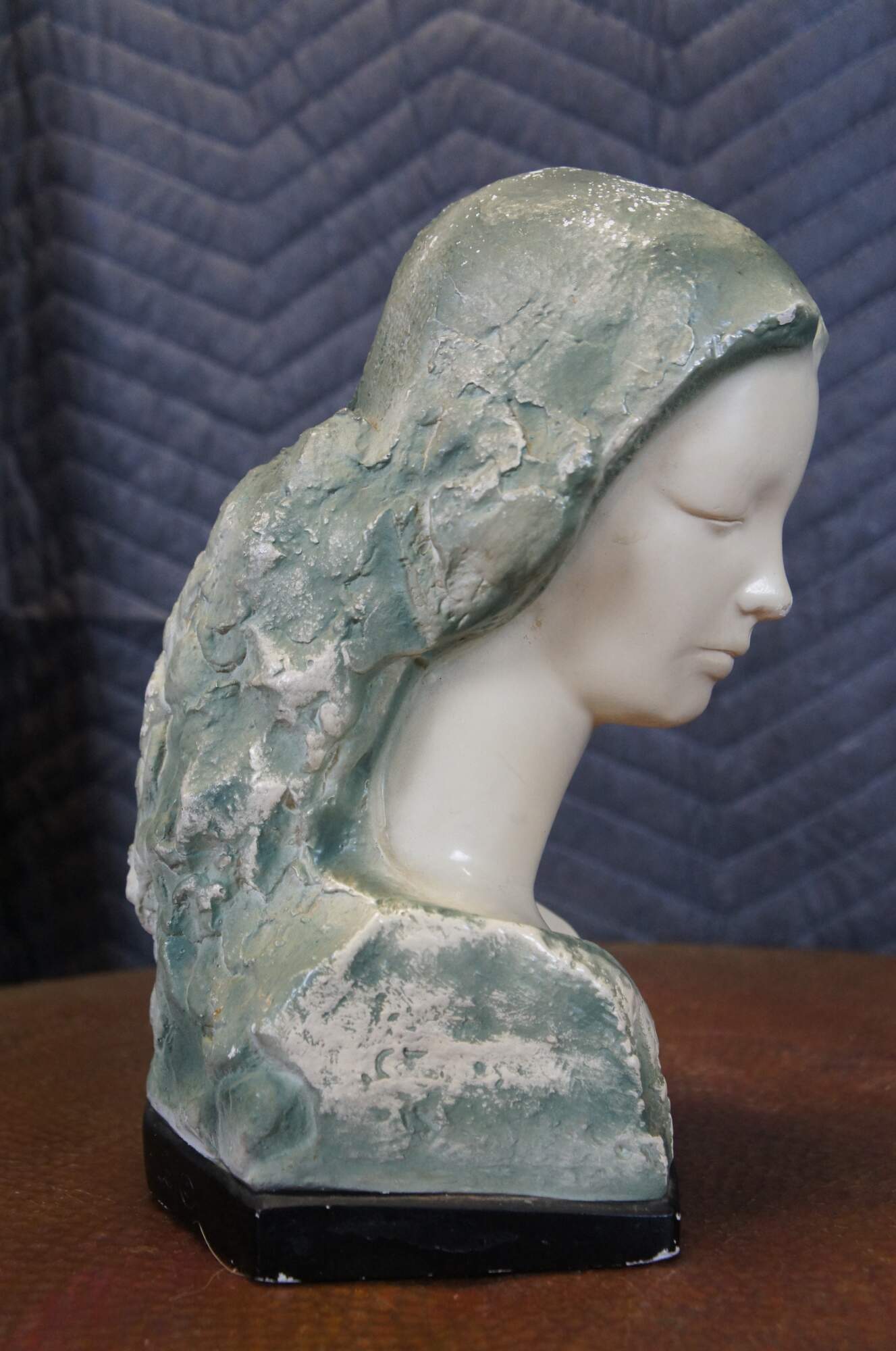 Mid 20th century cast foundry stone sculpture titled "Face of Love" by Vincent Glinsky. Depicts a representation of the Virgin Mary / Madonna with a glossy off white face, mottled green hair/veil, and black painted base. Marked alond back edge of base.