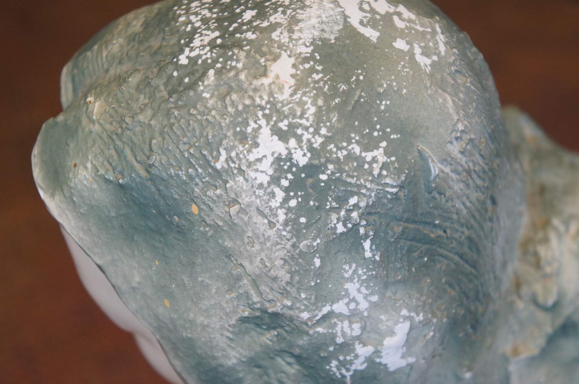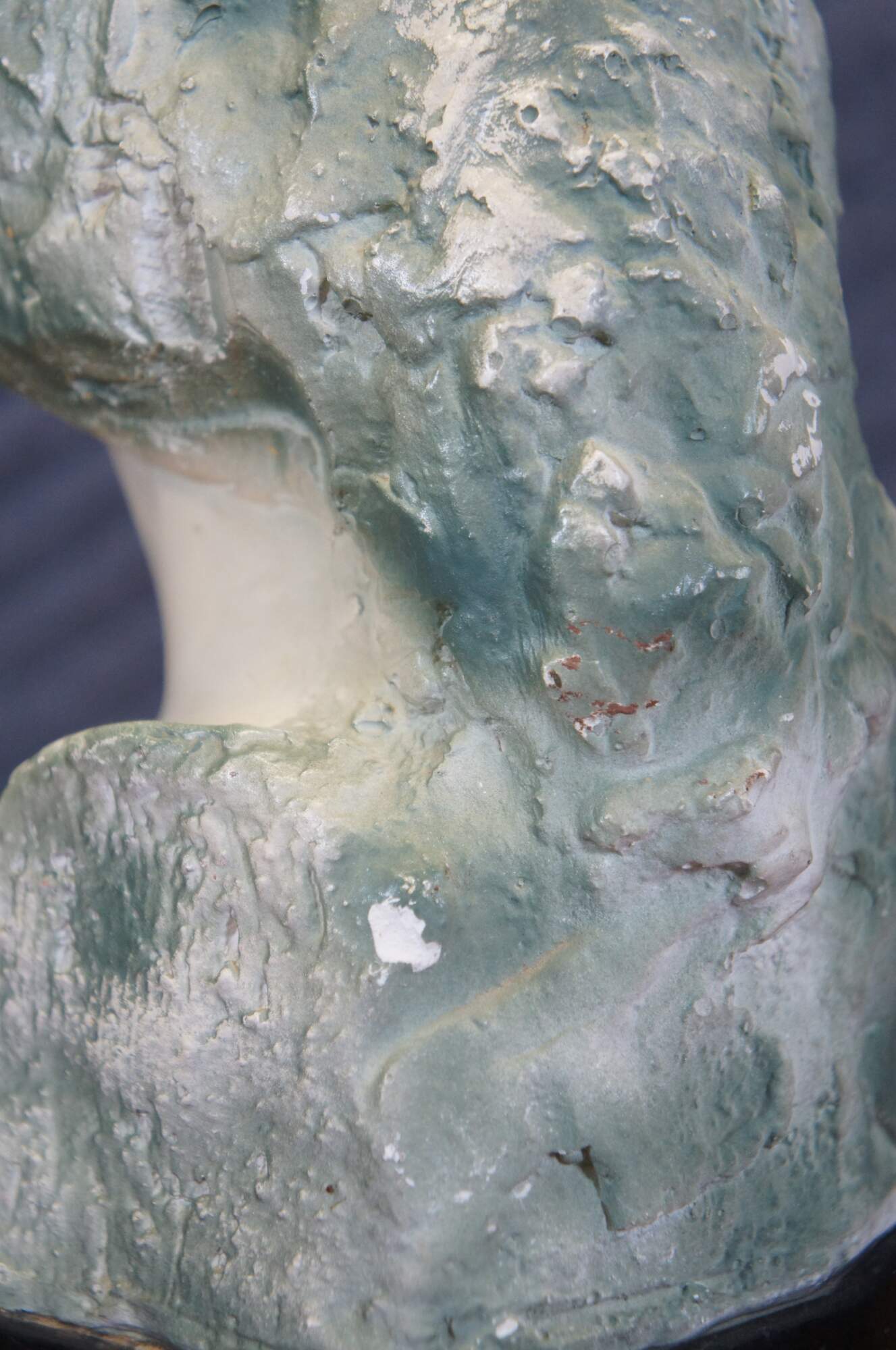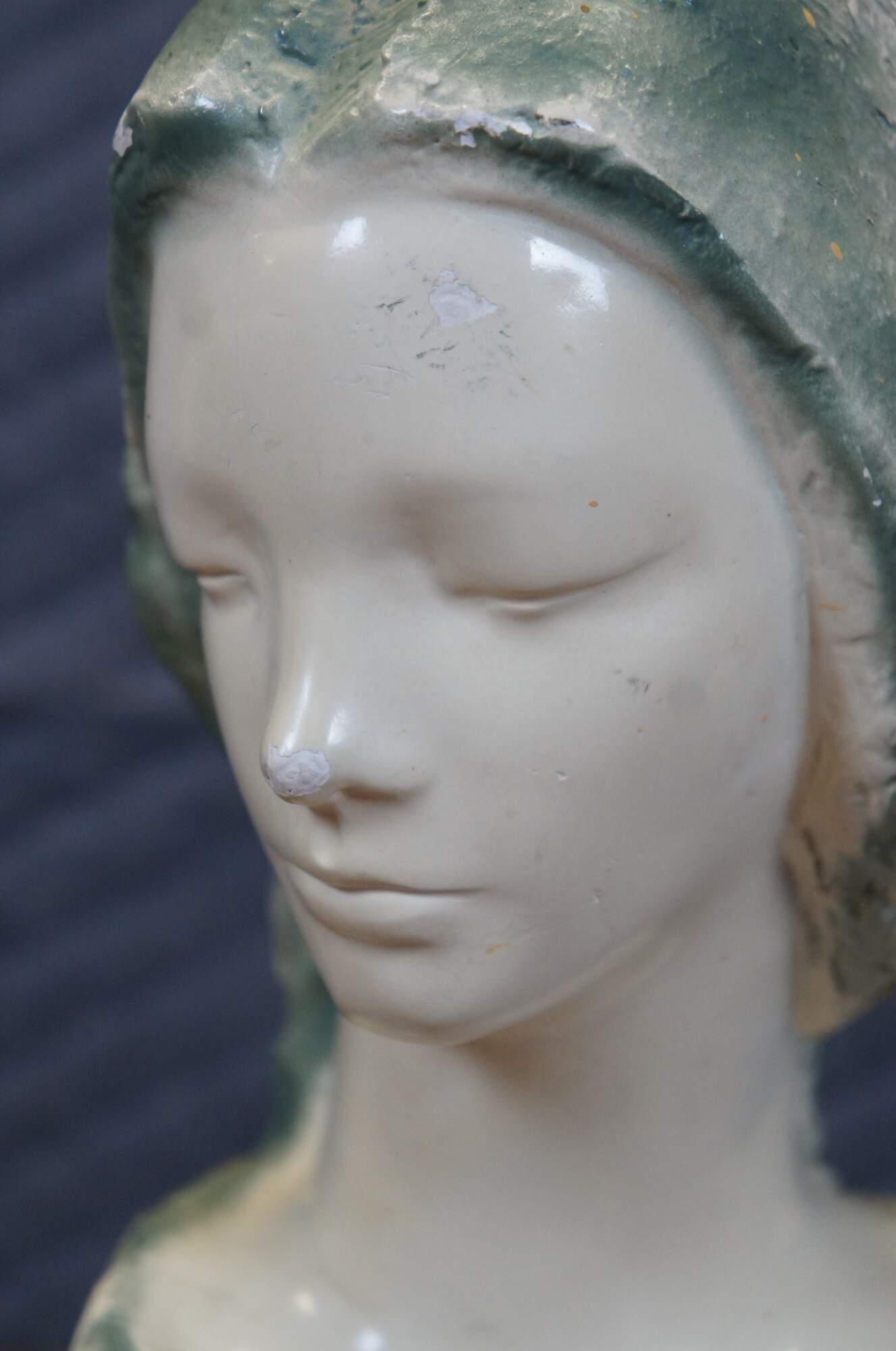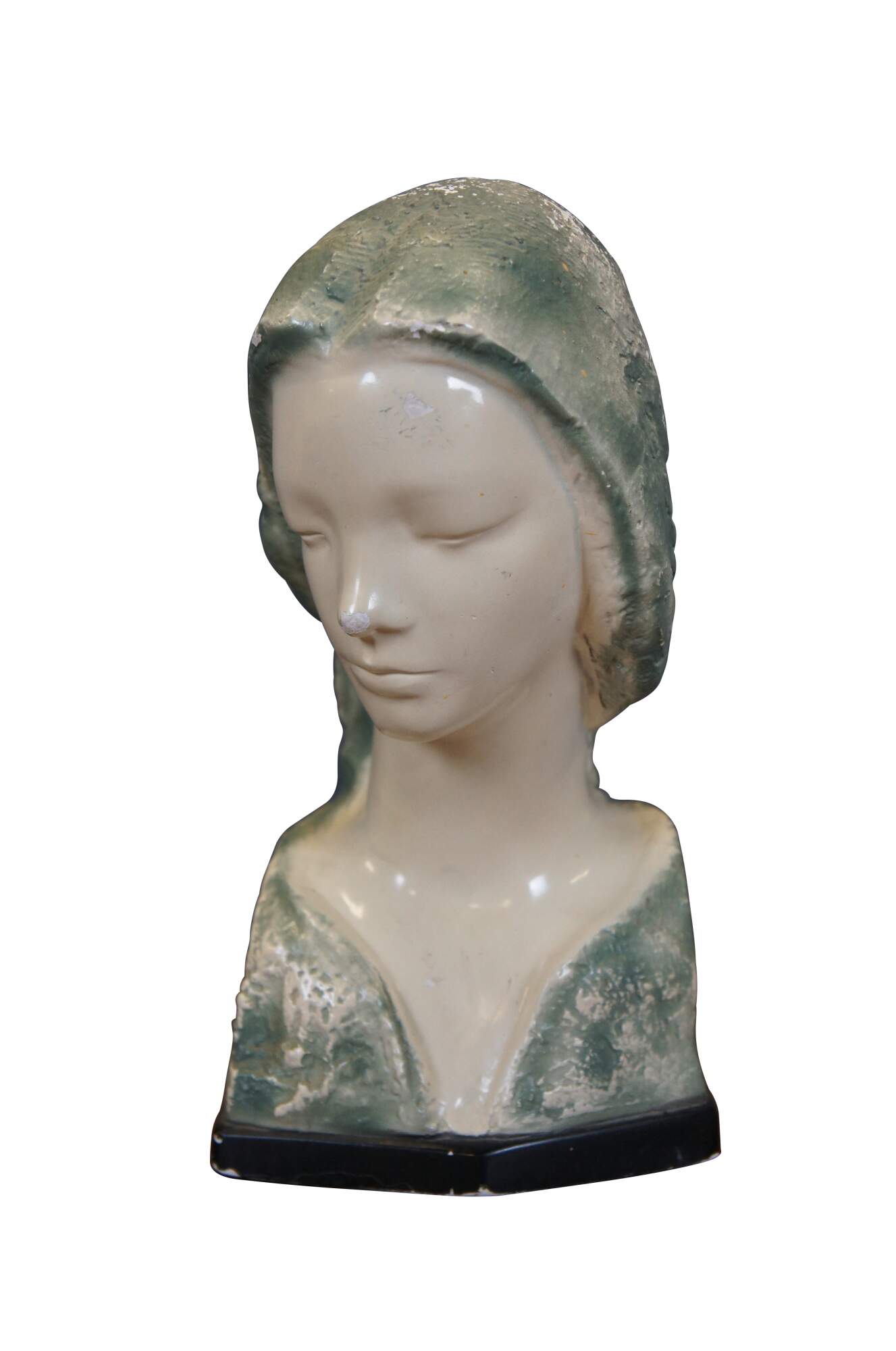 Mid 20th century cast foundry stone sculpture titled "Face of Love" by Vincent Glinsky. Depicts a representation of the Virgin Mary / Madonna with a glossy off white face, mottled green hair/veil, and black painted base. Marked alond back edge of base.