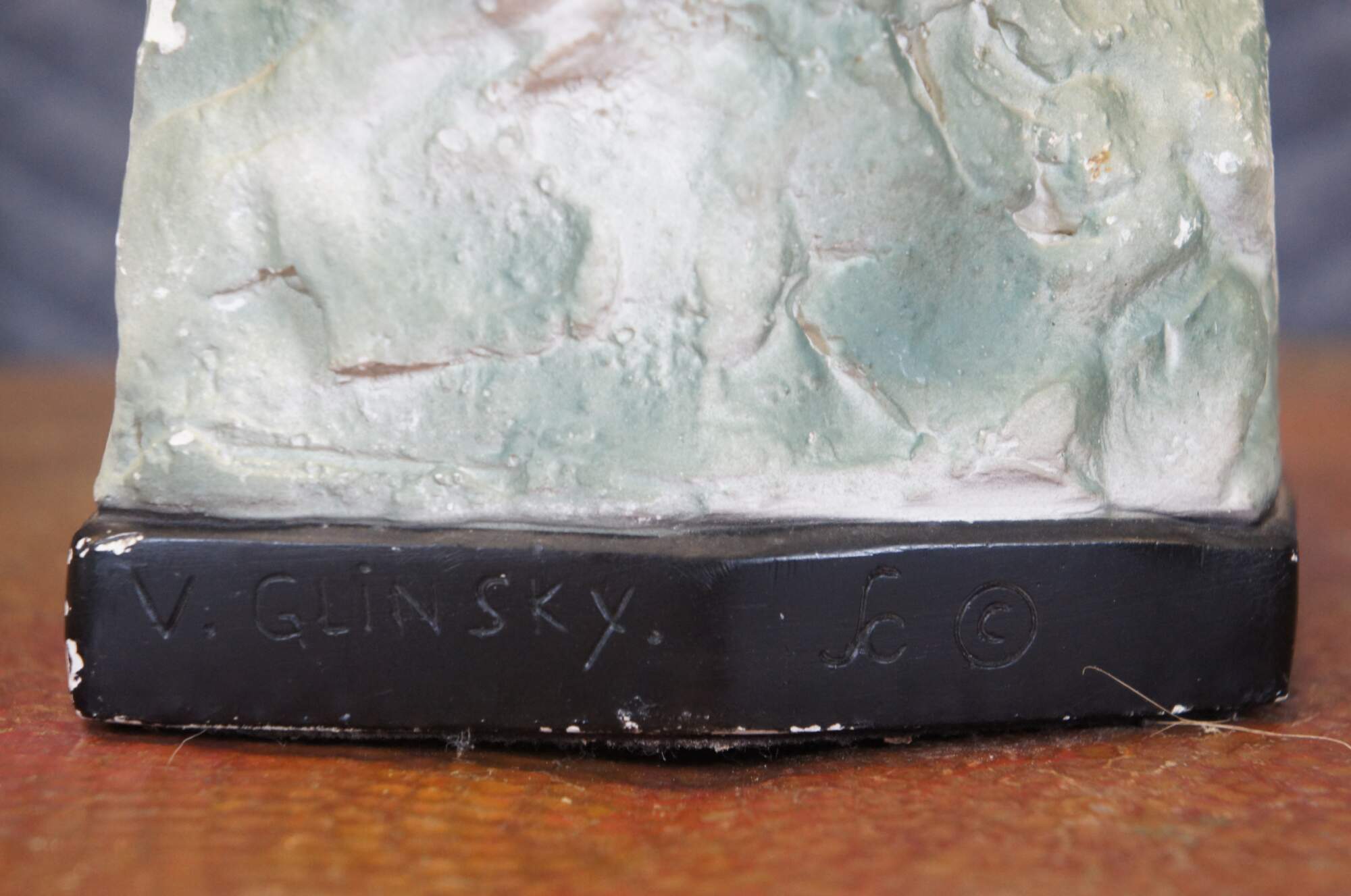 "Vincent Glinsky (December 18, 1895 – March 19, 1975) was an American sculptor. He is especially noted for his architectural decorations. Vincent Glinsky was born in Russia on December 18, 1895 and emigrated to America just before World War I, settling in Syracuse, NY, with his family. In 1916 he moved to New York City, joining the inaugural class of the Beaux Arts Institute of Design, where he later taught (1931–32; 1940–41). During 1925–26 Glinsky studied at Columbia University's School of Architecture and moved into the field of architectural sculpture, working with Albert Kahn ("the architect of Detroit"), on the Maccabees Building, among other projects. In 1927 Glinsky went to live in Europe for approximately two years, settling first in Rome. He later moved to Paris, where he was acknowledged as part of L'Ecole de Paris. On his return to New York, Glinsky began to exhibit widely. In 1937 Glinsky joined with 56 other artists as a Founding Member of the Sculptors Guild in New York. Over the years he took on active roles in other arts organizations, including Vice-President of the Architectural League of New York (1956–58), Fellow of the National Sculpture Society, Academician of the National Academy of Design, and a member of the Audubon Artists' Society. He was married to the American sculptor Cleo Hartwig (1907–1988). His son is composer and author Albert Glinsky." (Source: Wikipedia)