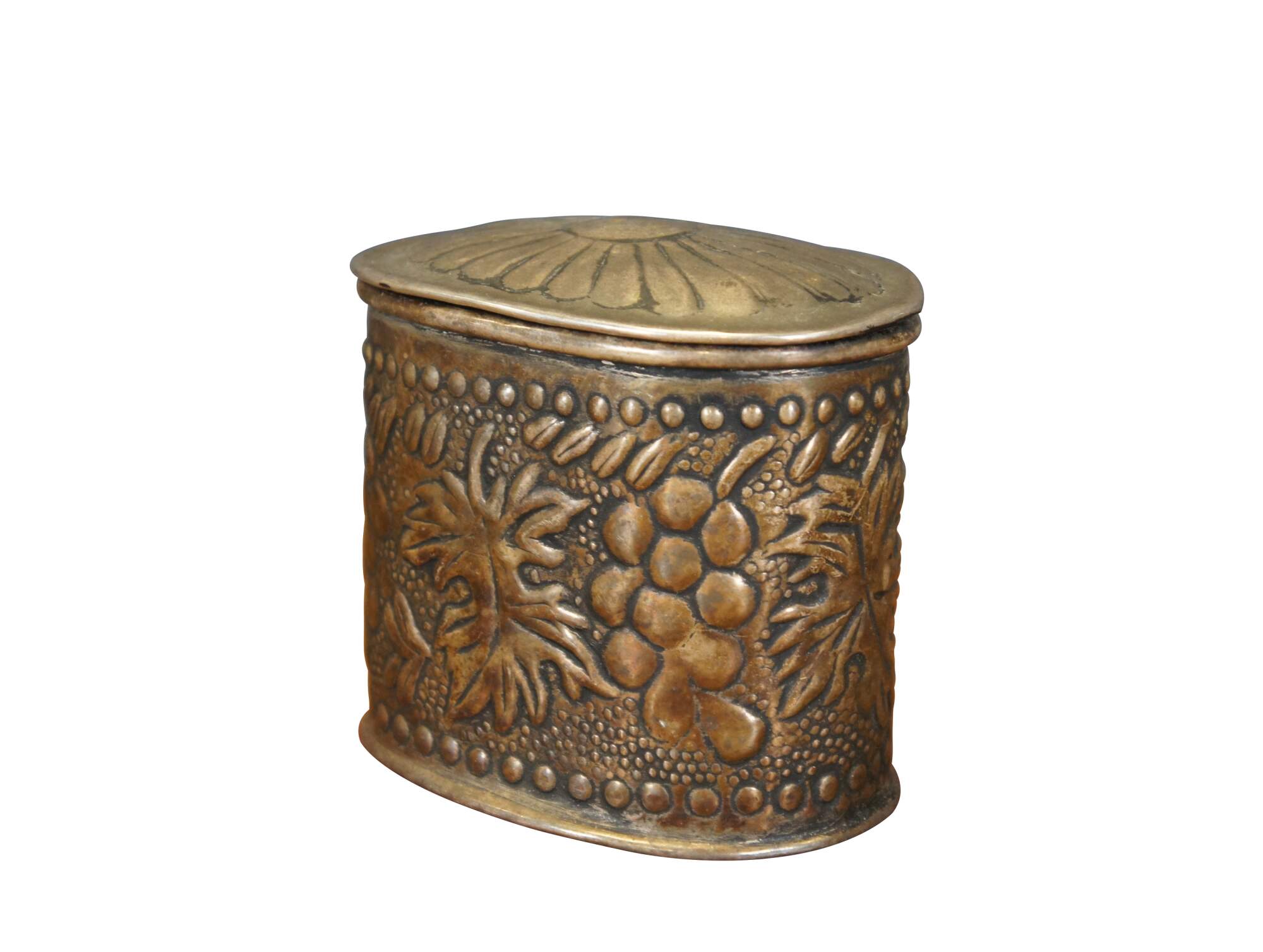 Vintage repousse silver plate or tin small tea caddy / canister / trinket box. Oval form embossed with bunches of grapes, leaves and beaded trim, with a flower / daisy on the lid. No makers mark.