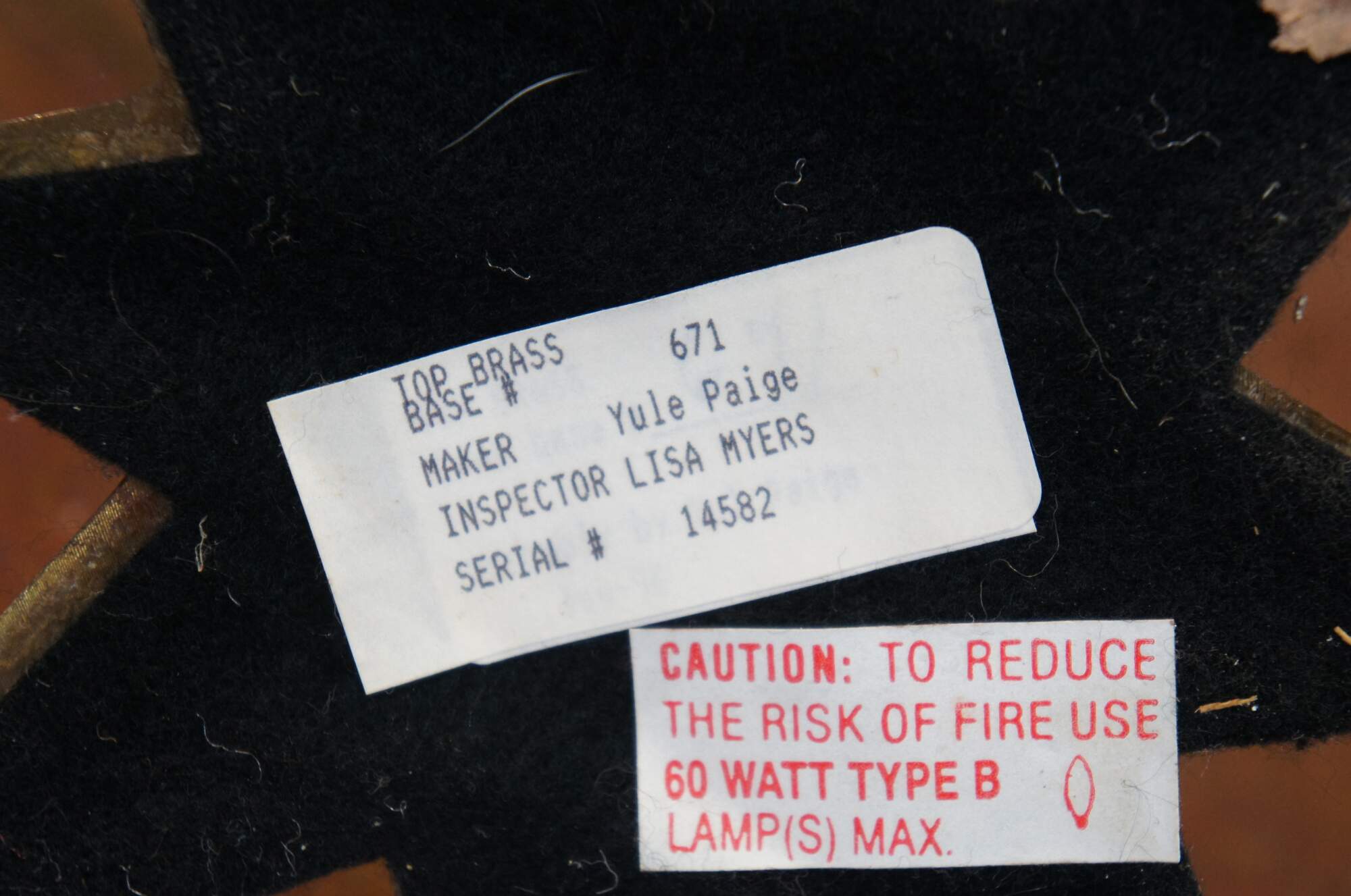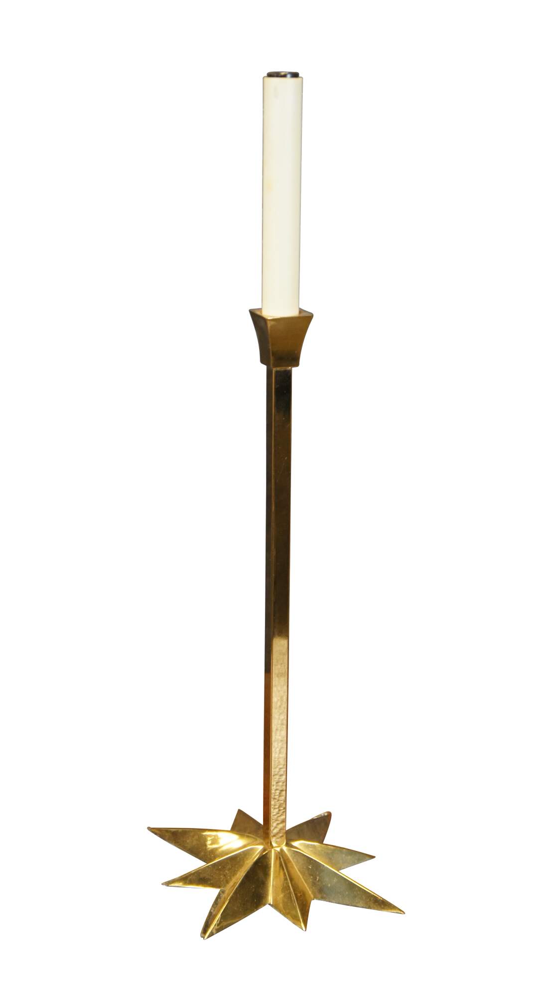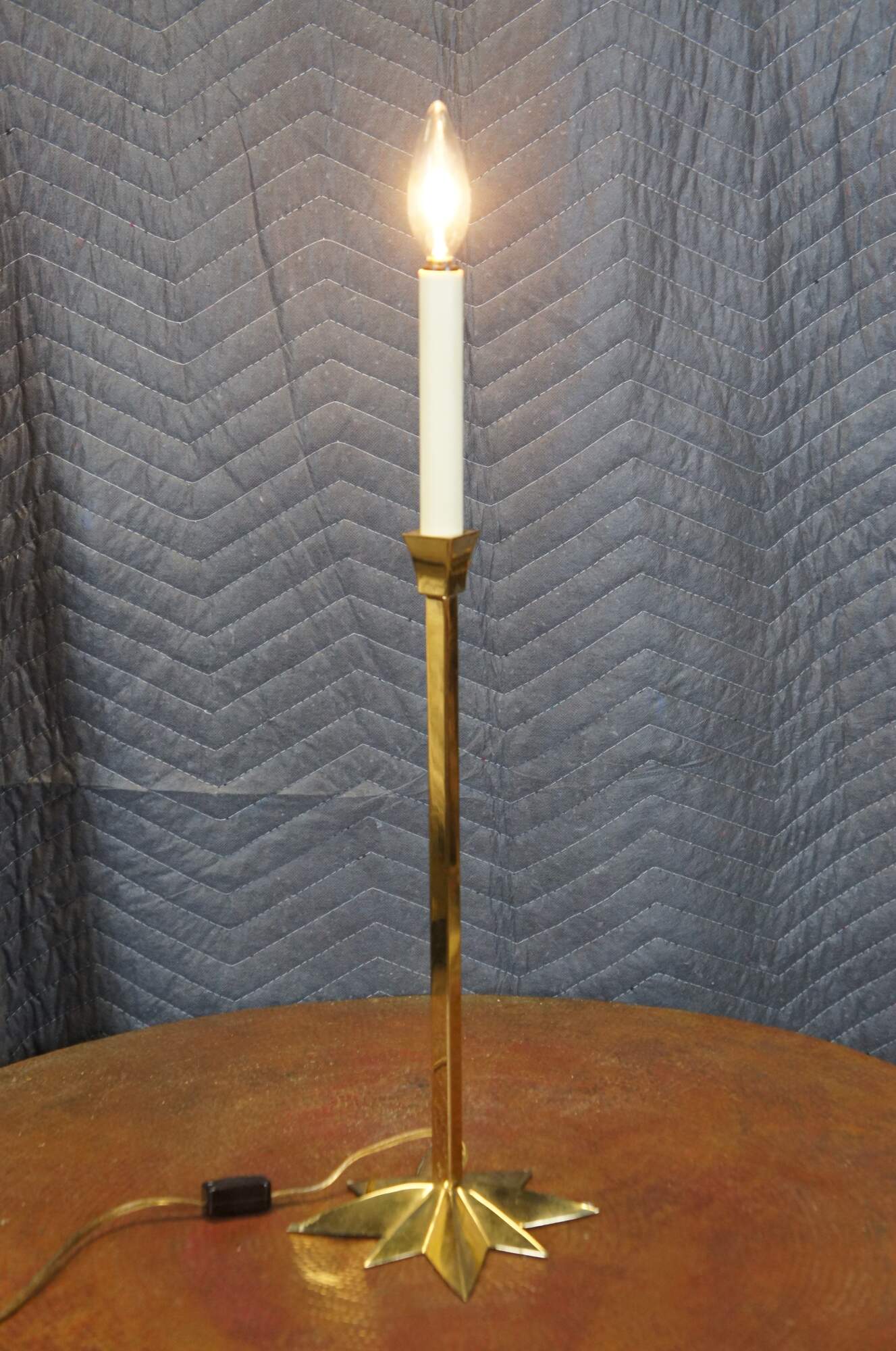 Rare vintage Yule Paige bright lacqured brass buffet altar lamp featuring a square candlestick shaped body on a three dimensional North star base, topped with a faux candle socket. Top Brass / Base # 671 / Maker Yule Paige / Inspector Lisa Myers / Serial # 14582.