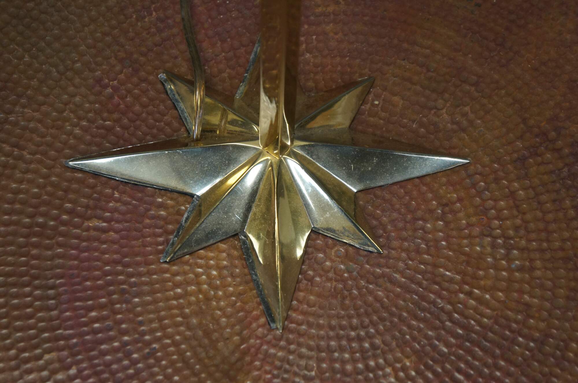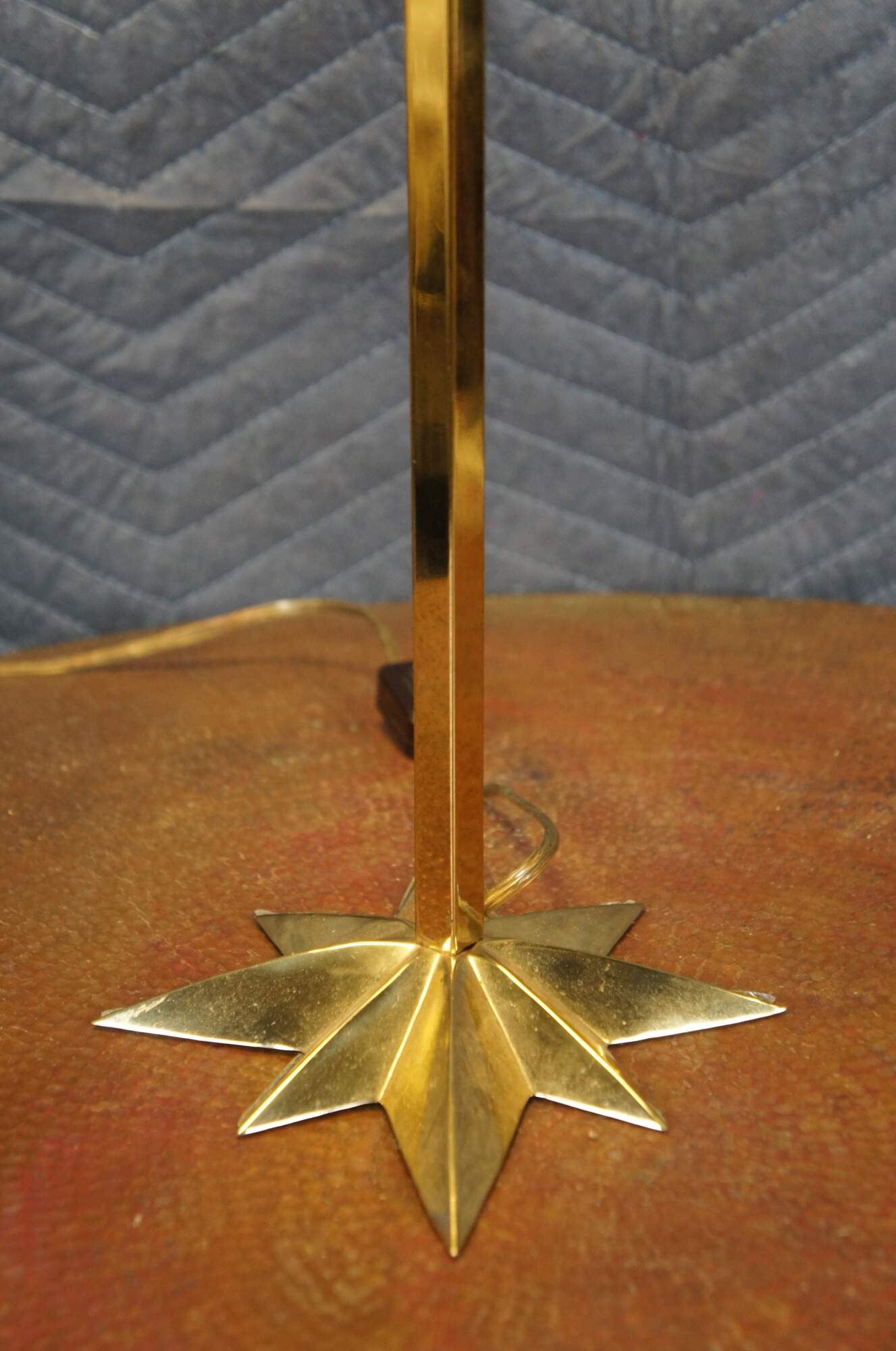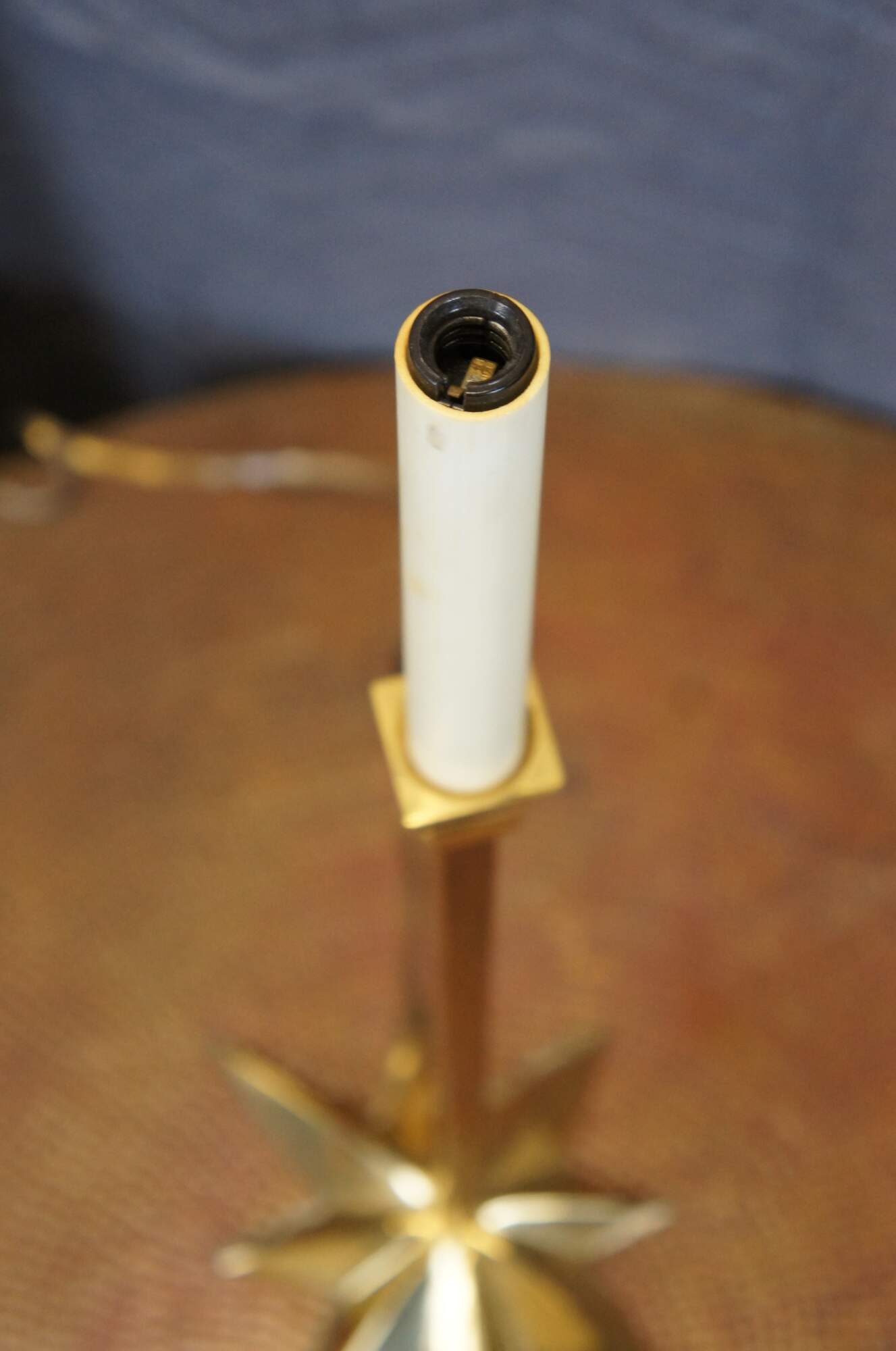 Rare vintage Yule Paige bright lacqured brass buffet altar lamp featuring a square candlestick shaped body on a three dimensional North star base, topped with a faux candle socket. Top Brass / Base # 671 / Maker Yule Paige / Inspector Lisa Myers / Serial # 14582.