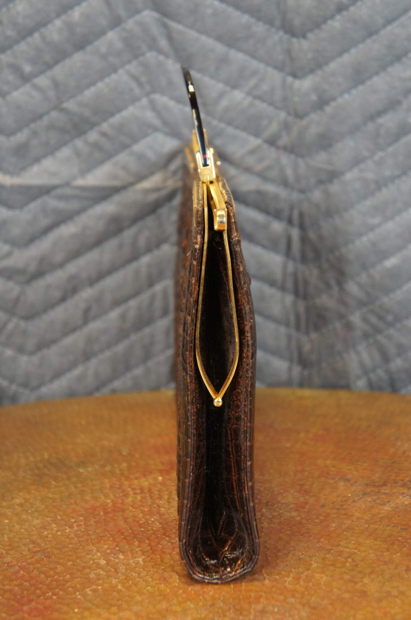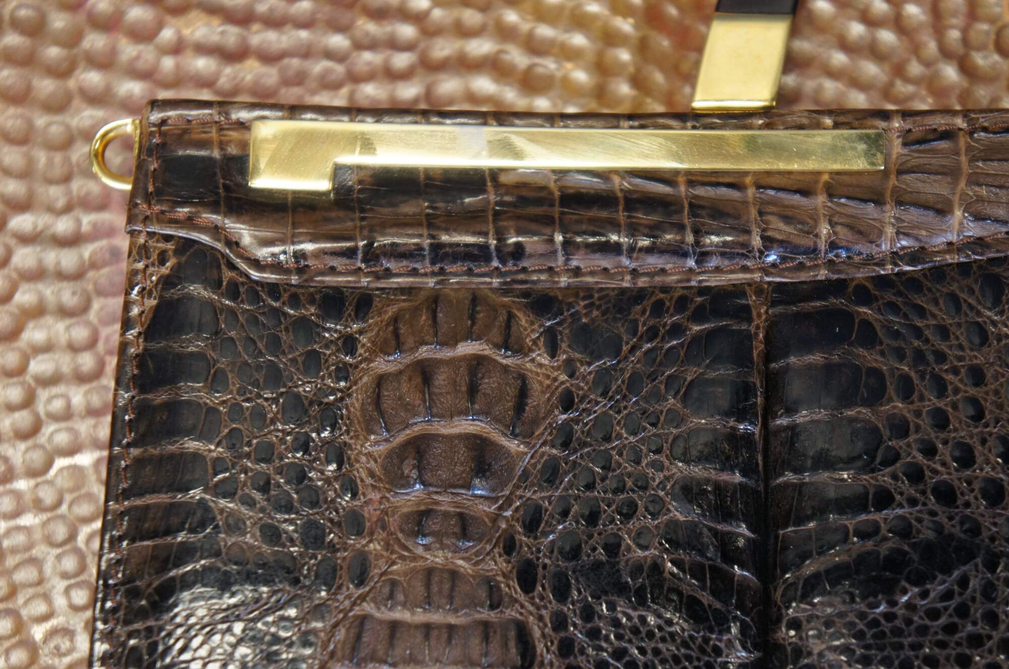 Mid century triple hornback brown alligator / crocodile skin / leather purse / hand bag. Rectangular form; gold tone hardware; single tortoiseshell bakelite / acrylic handle. Snap closure. Two interior compartments divided by zippered pocket; one interior slip pocket. Brown pleather interior. Matching brown pleather coin purse.