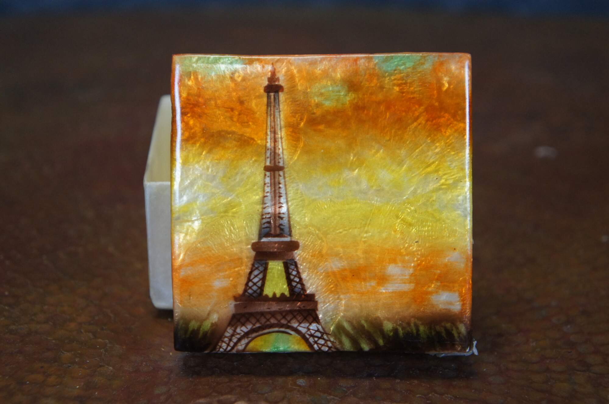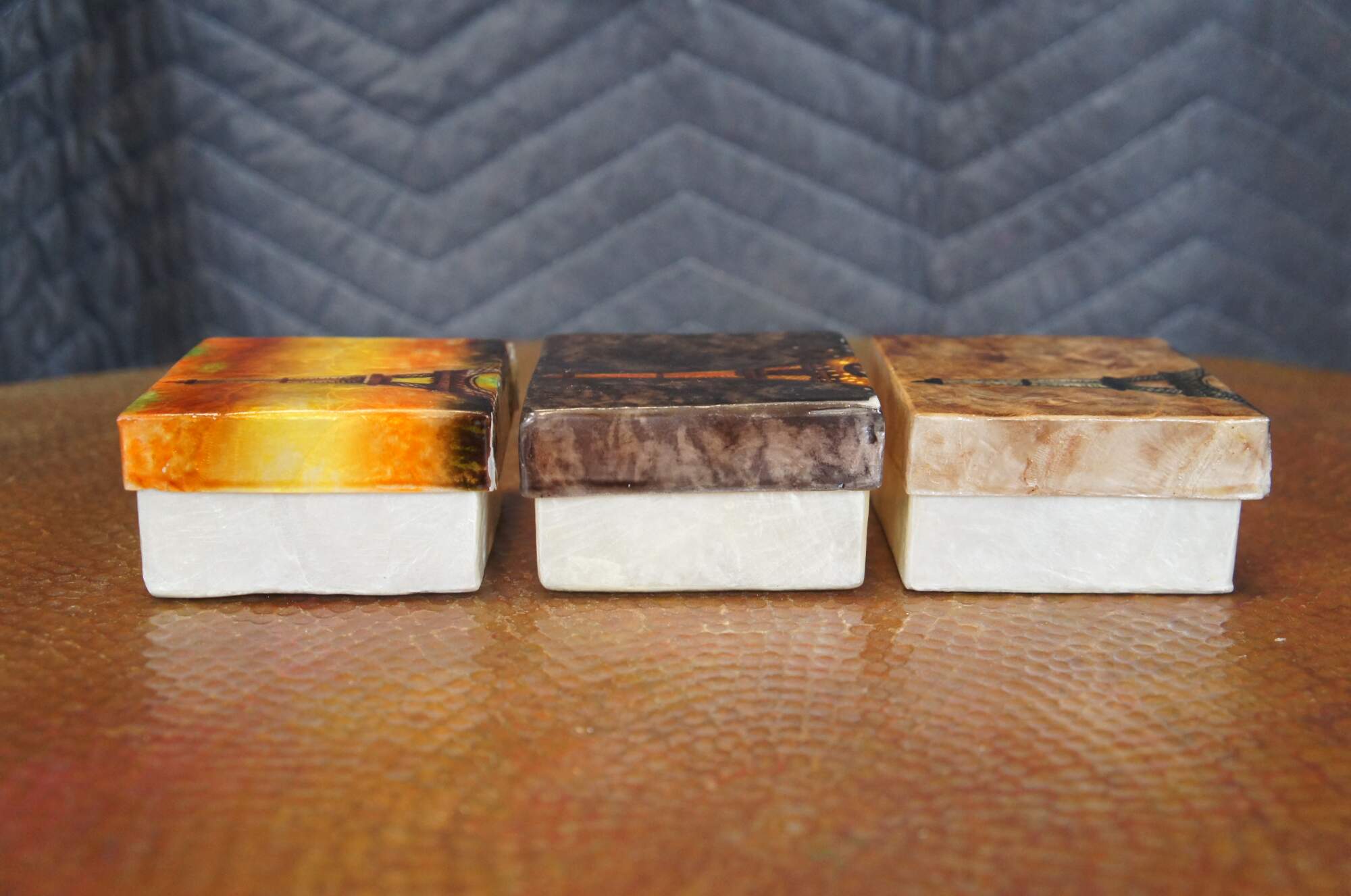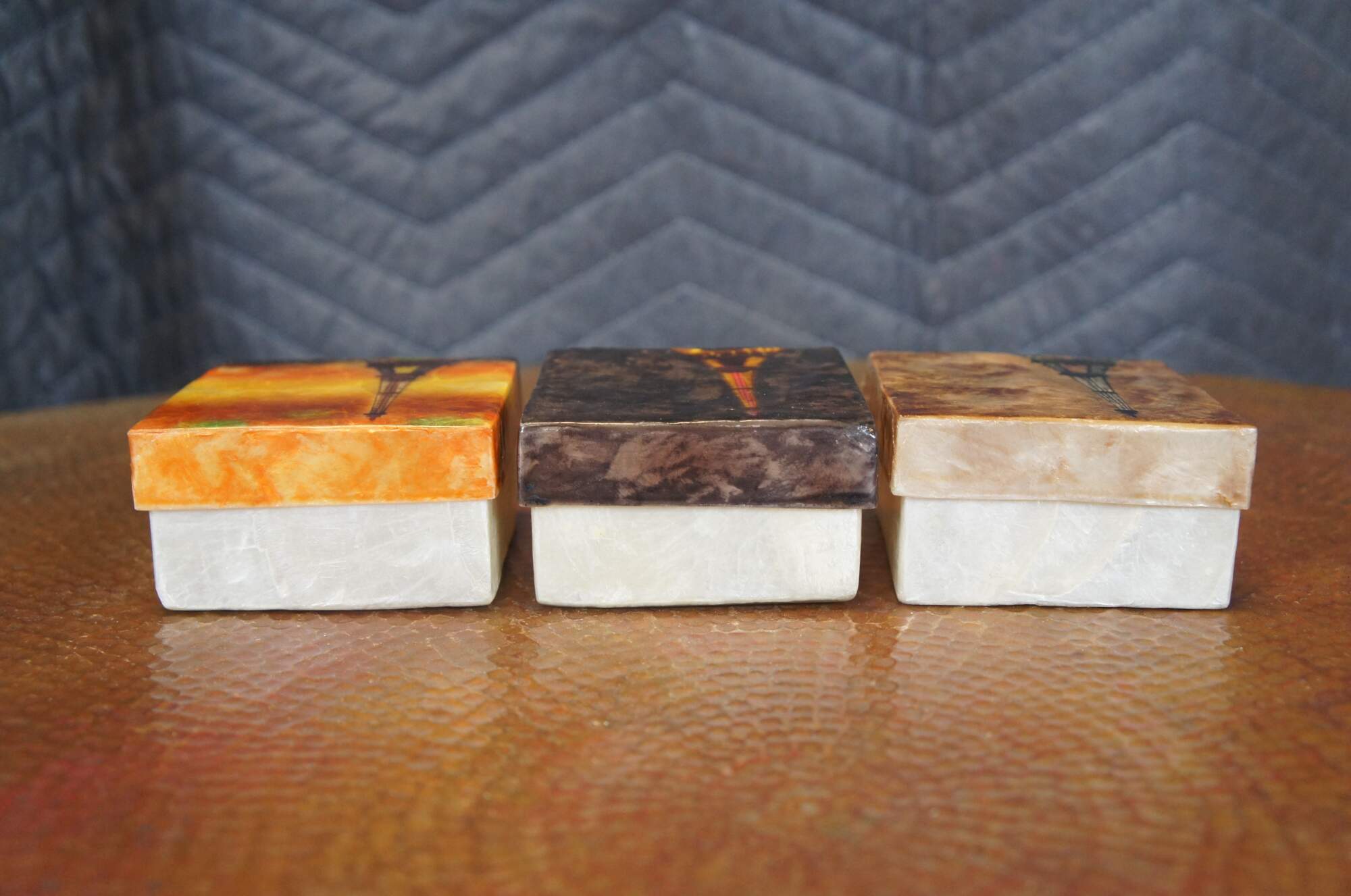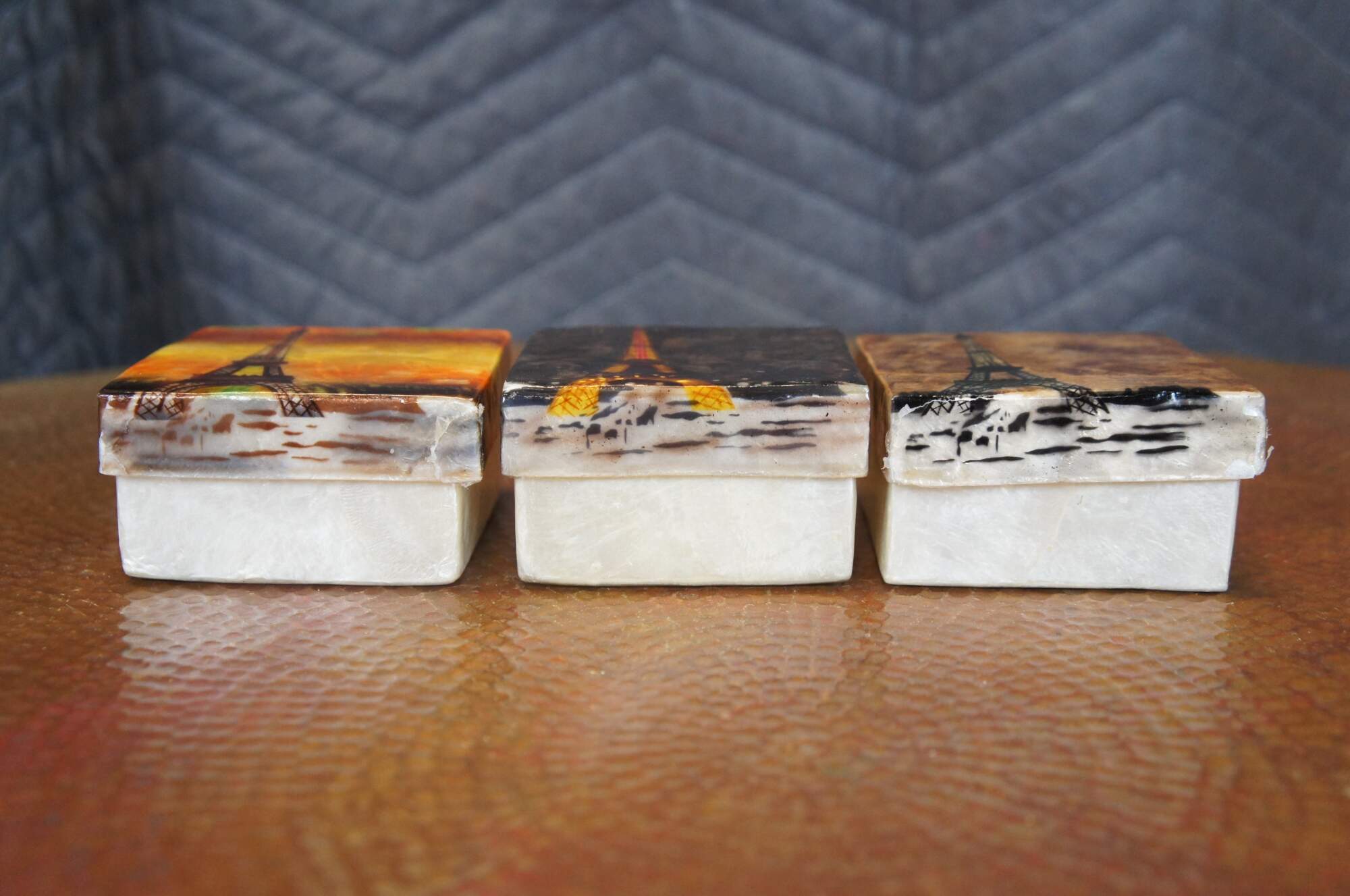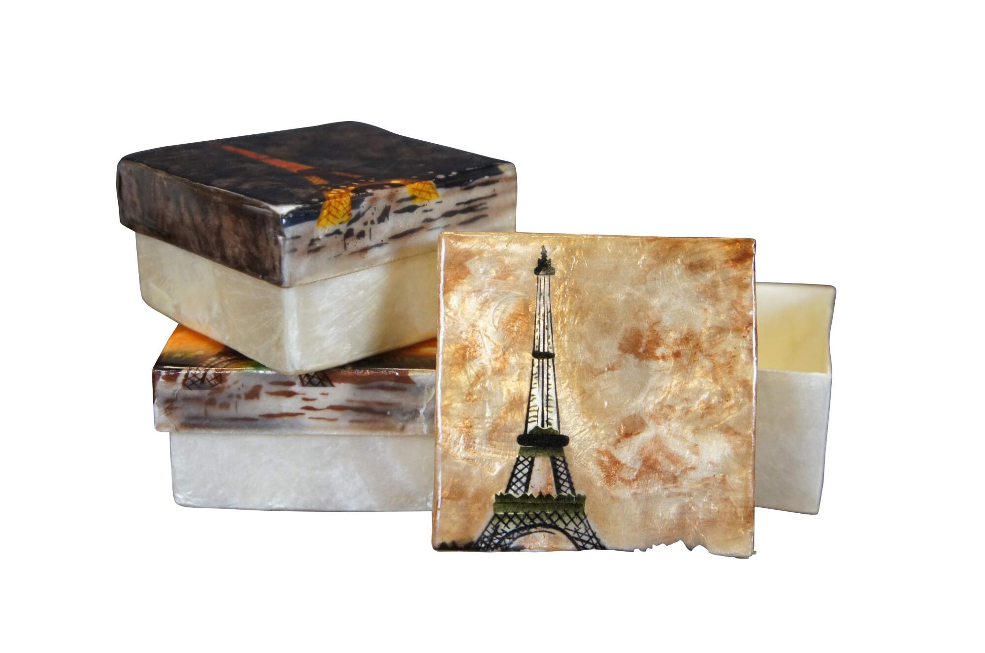 Set of three late 20th century square, lidded trinket boxes made of Capiz / Windowpane Oyster shell, lids hand painted with the Eiffel Tower in various combinations of browns and oranges. Made in Philippines.