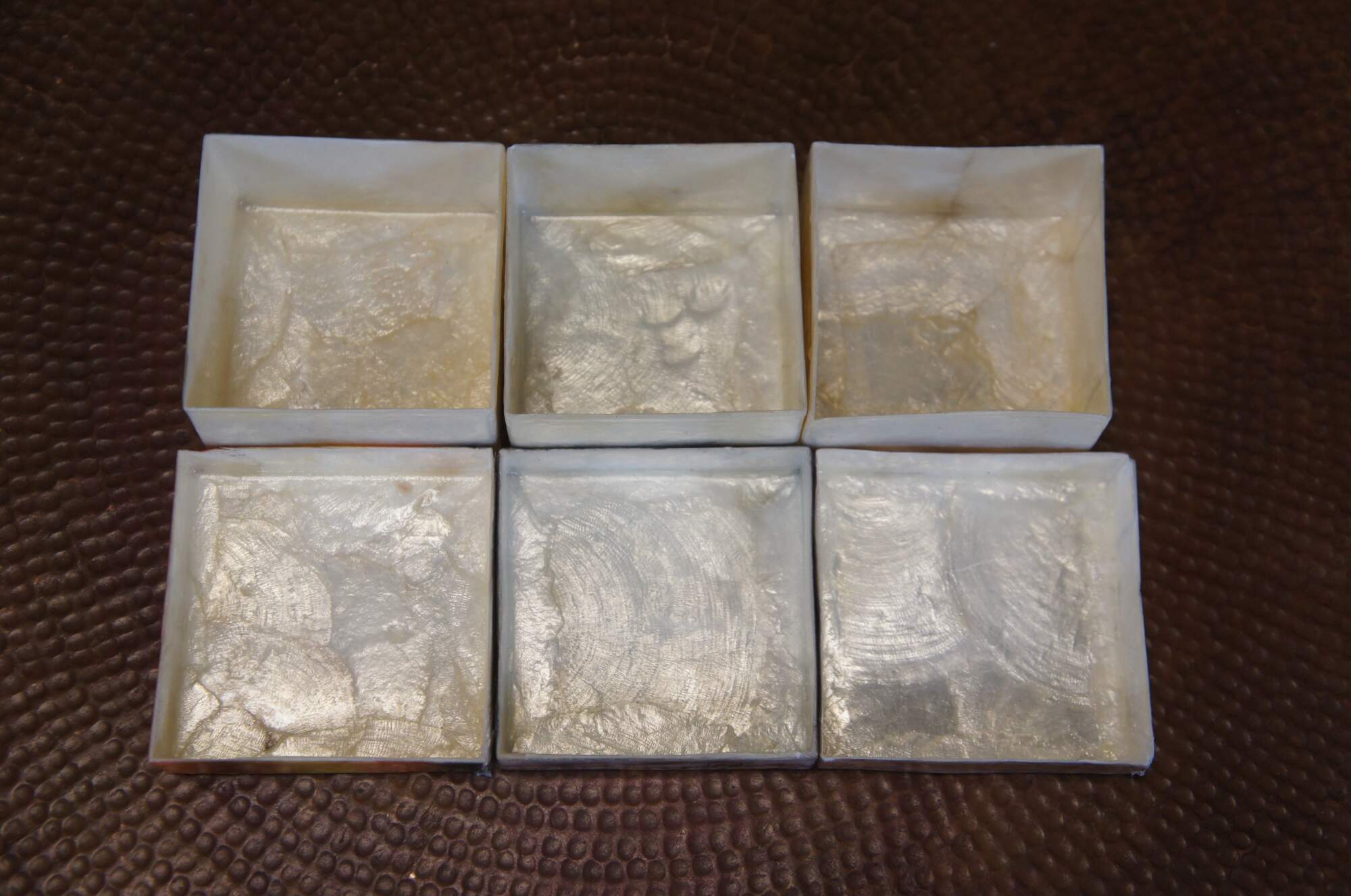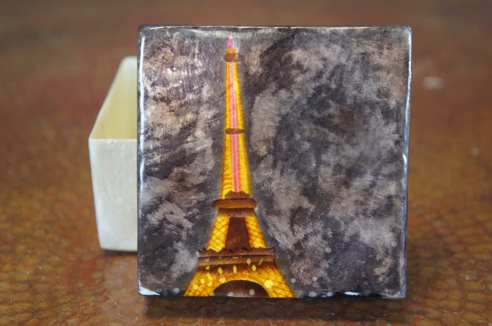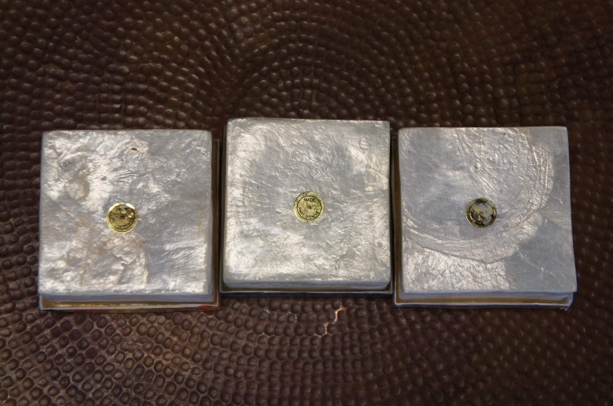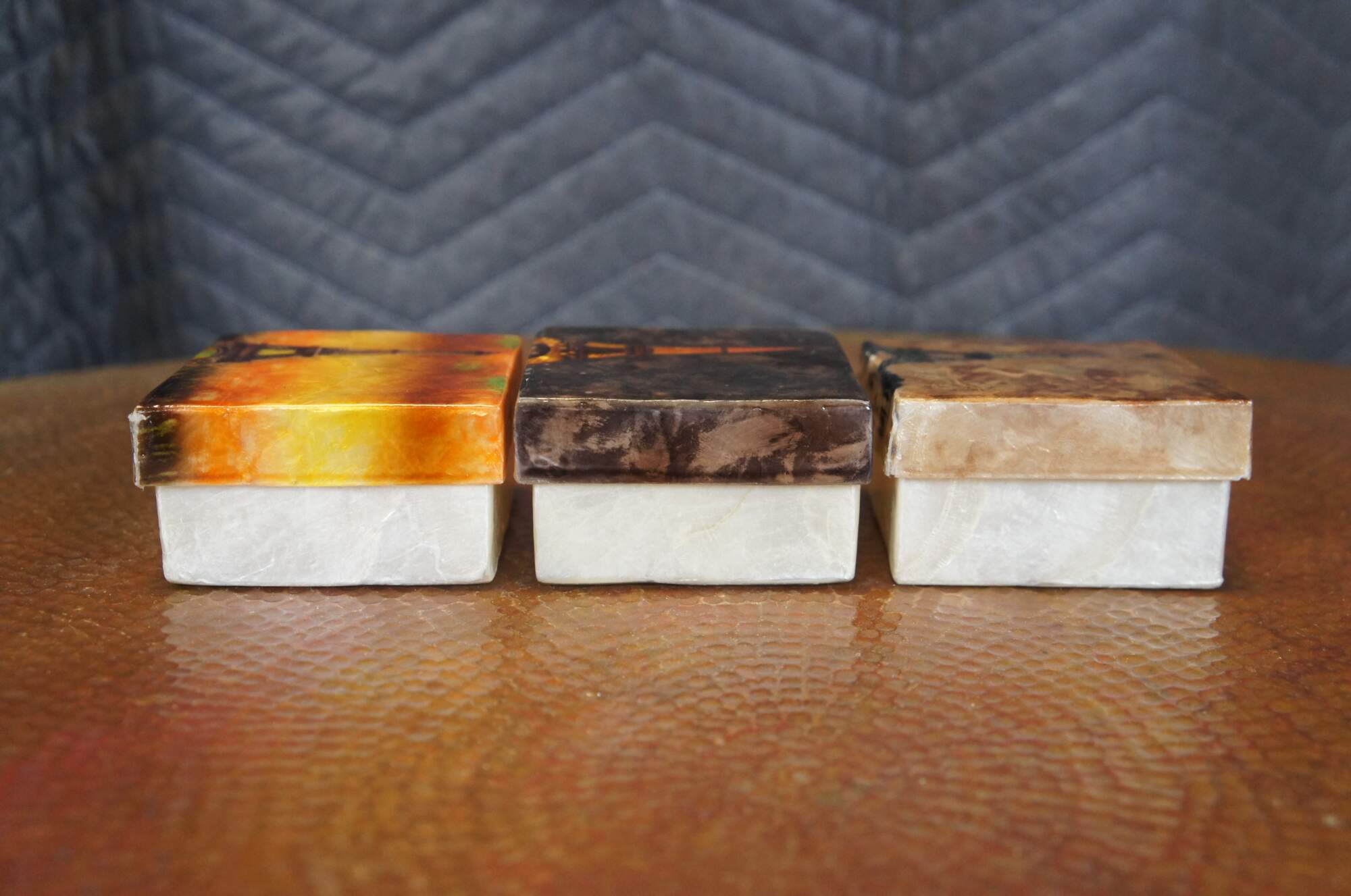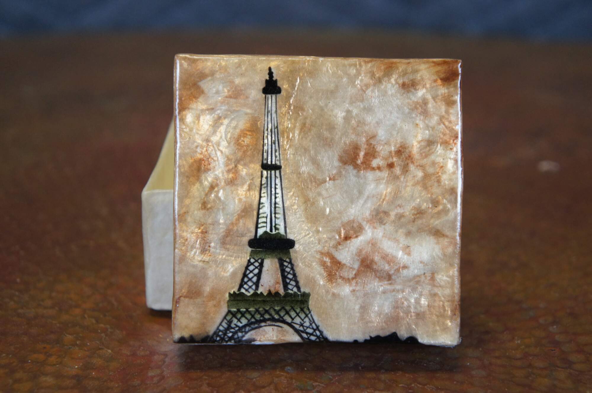 Set of three late 20th century square, lidded trinket boxes made of Capiz / Windowpane Oyster shell, lids hand painted with the Eiffel Tower in various combinations of browns and oranges. Made in Philippines.
