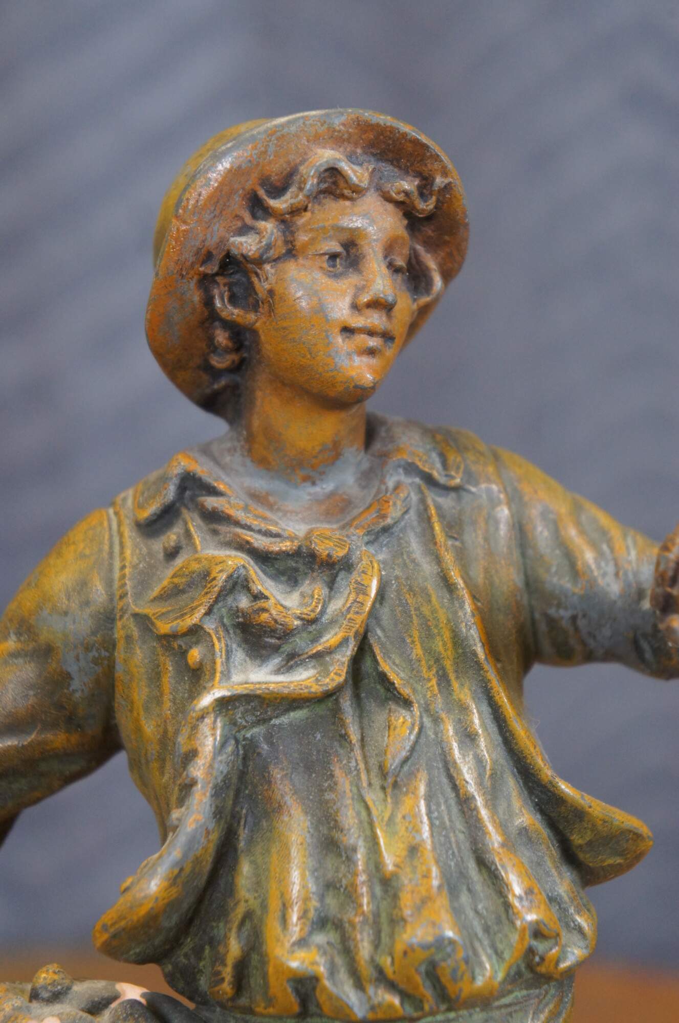 Early 20th century spelter bronze figurine / sculpture titled "La Bonne Recolte" (The Good Harvest) by Georges Maxim (1885-1940). Depicts a young male figure in the dress of a French Provincial peasant, walking on a rocky plinth, carrying a basket of potatoes. Brass plaque reading "La Bonne Recolte Par Geo. Maxim" on base. Marked Made in France on back.