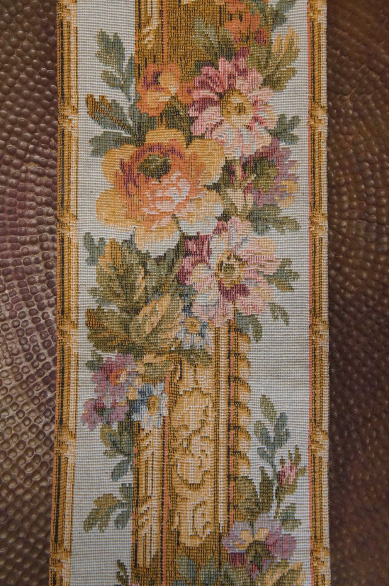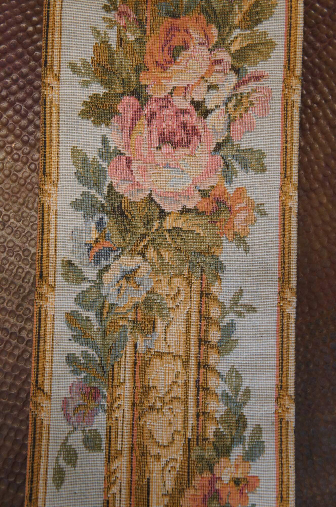 Late 20th century Corona Decor Co tapestry bell pull / wall hanging. Art. No. 609920. Machine embroidered, French Aubusson style floral tapestry featuring a vine of roses spiraling around a golden column, capped at the top and bottom with ornate brass loops / handles. Brown cotton back.