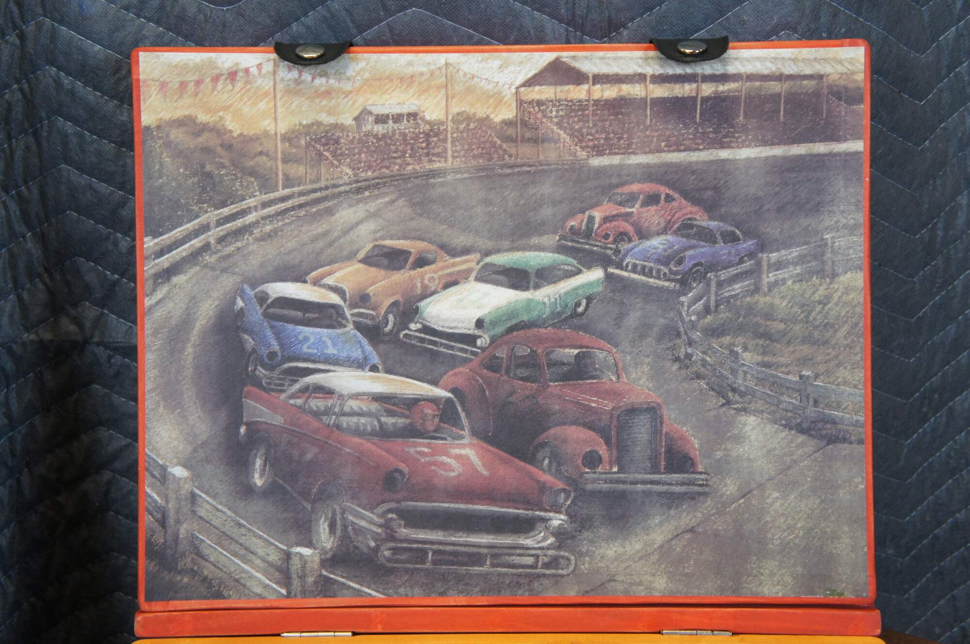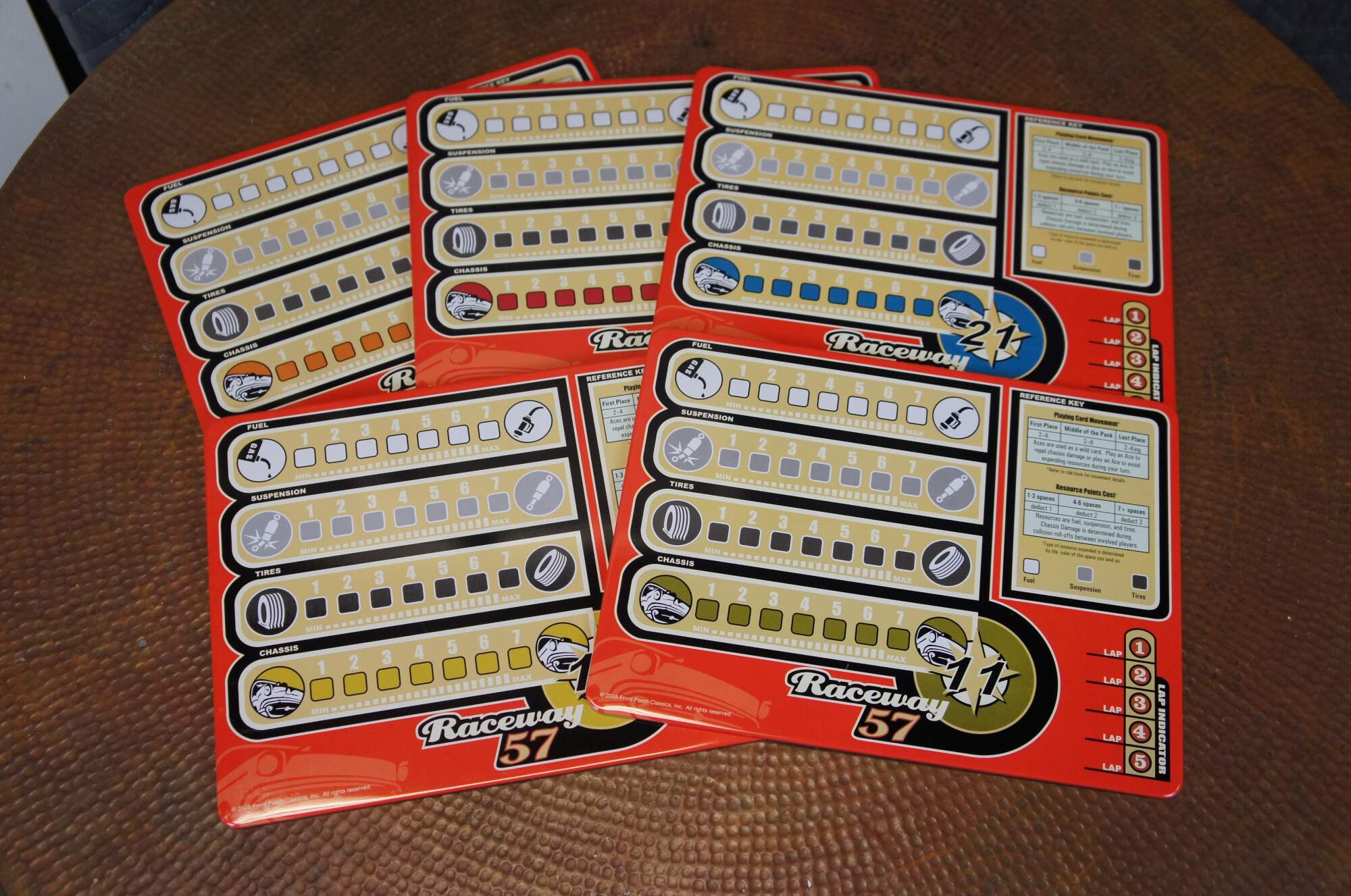 Late 20th century Front Porch Classics - Raceway 57 board game. A vintage styled car racing game for ages 8 to adult. Includes original packaging, instruction book/quick start guide, wooden storage case with fold out game board, pad of score sheets, deck of standard playing cards, two dice, 5 metal playing pieces, metal trophy piece, 5 metal player sheets, 5 wooden player tokens, and 30 magetic score markers. Numbered 4324.
