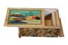 Mid 20th century souvenir type wooden puzzle gift box. Features a geometric checkerboard pattern on the sides and inlaid design of a brightly colored Japanese landscape on the lid - featuring a cottage, bridge and Mount Fuji - and flower on the base. Five step puzzle opens to a single secret compartment.