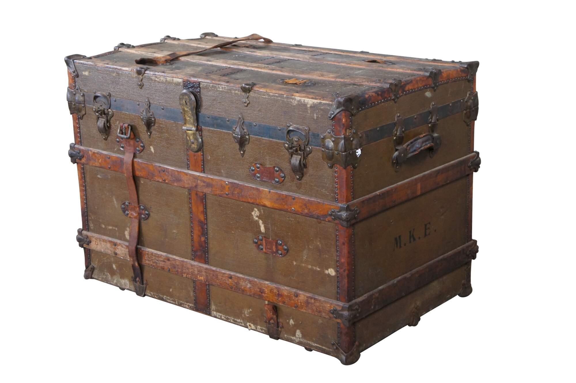 Steamer trunks, also known as cabin trunks or traveling trunks, were originally used as luggage for extended trips by steamship, train, or stagecoach or for taking to boarding school. Many were quite elaborate inside and out. Steamer trunks have a distinguishing curved or barrel top and can weigh as much as 100 pounds. Today, they are used as furniture or storage.