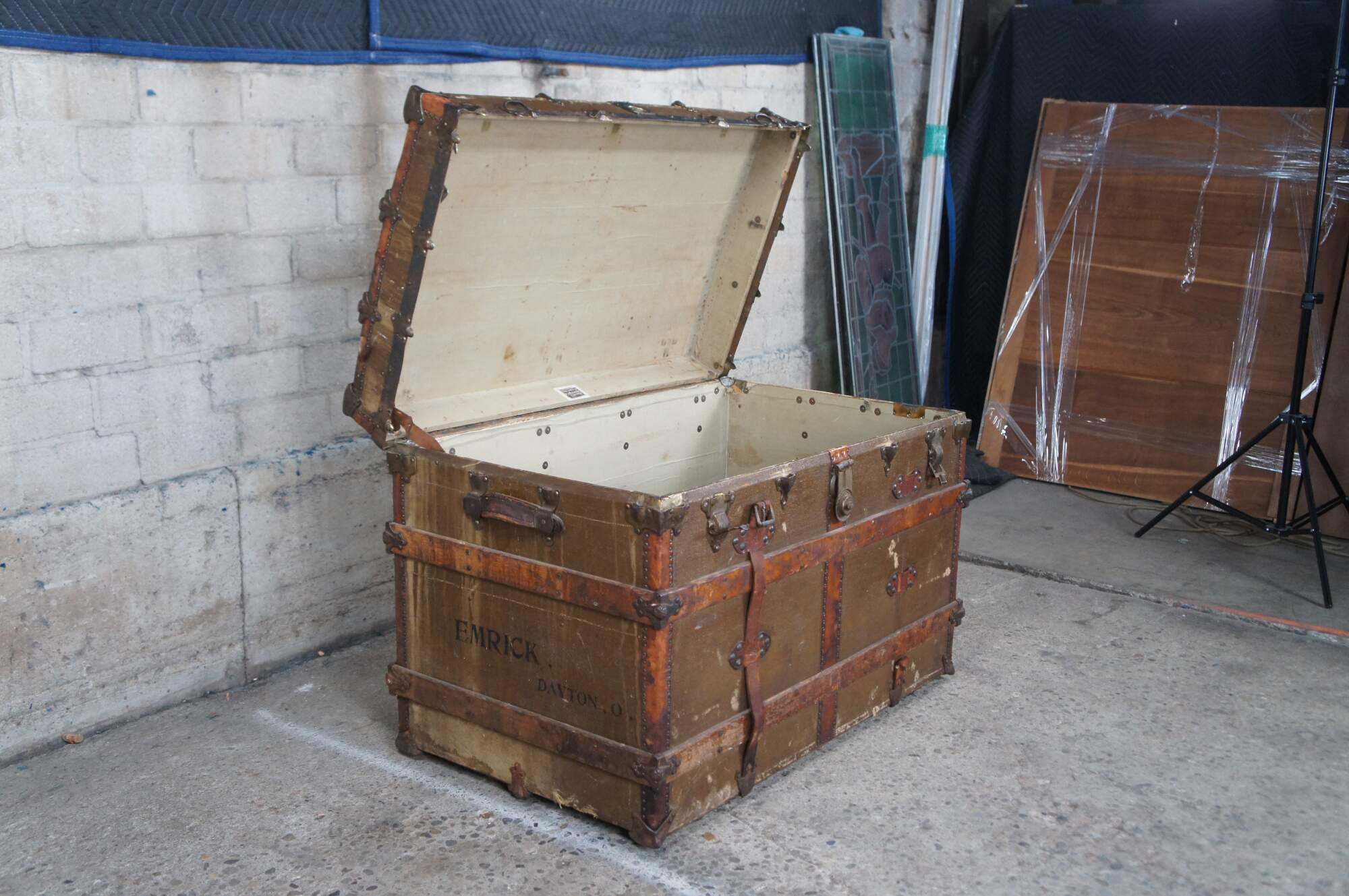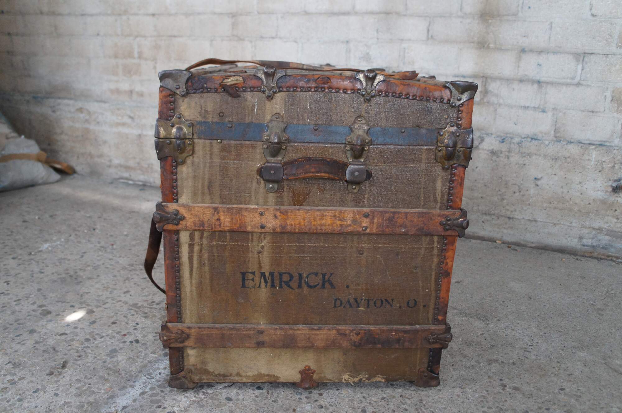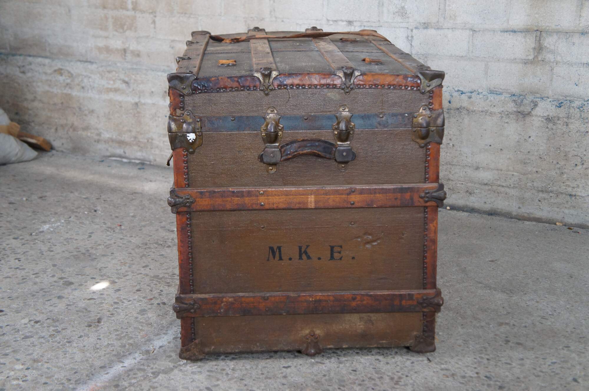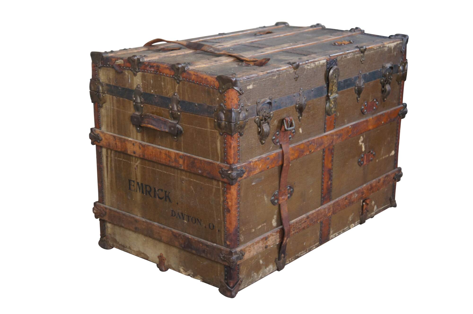 Victorian Era Flat Top Steamer Trunk or Chest by R&H Modern Trunks. Made from wood with a canvas wrap, leather accents and brass hardware. The side of the trunk is Monogrammed M.K.E. The other side reads Emrick Dayton, Ohio. Great for storage or use as a coffee table.
