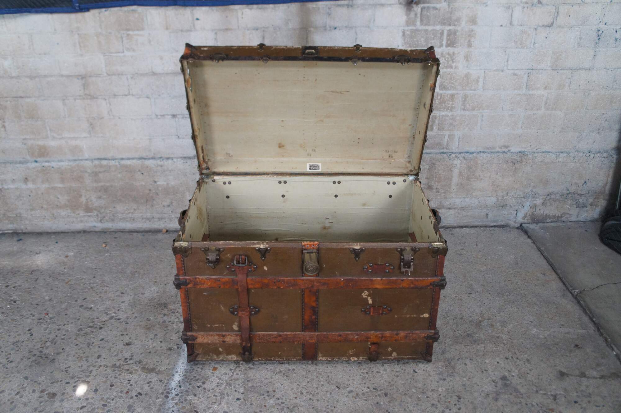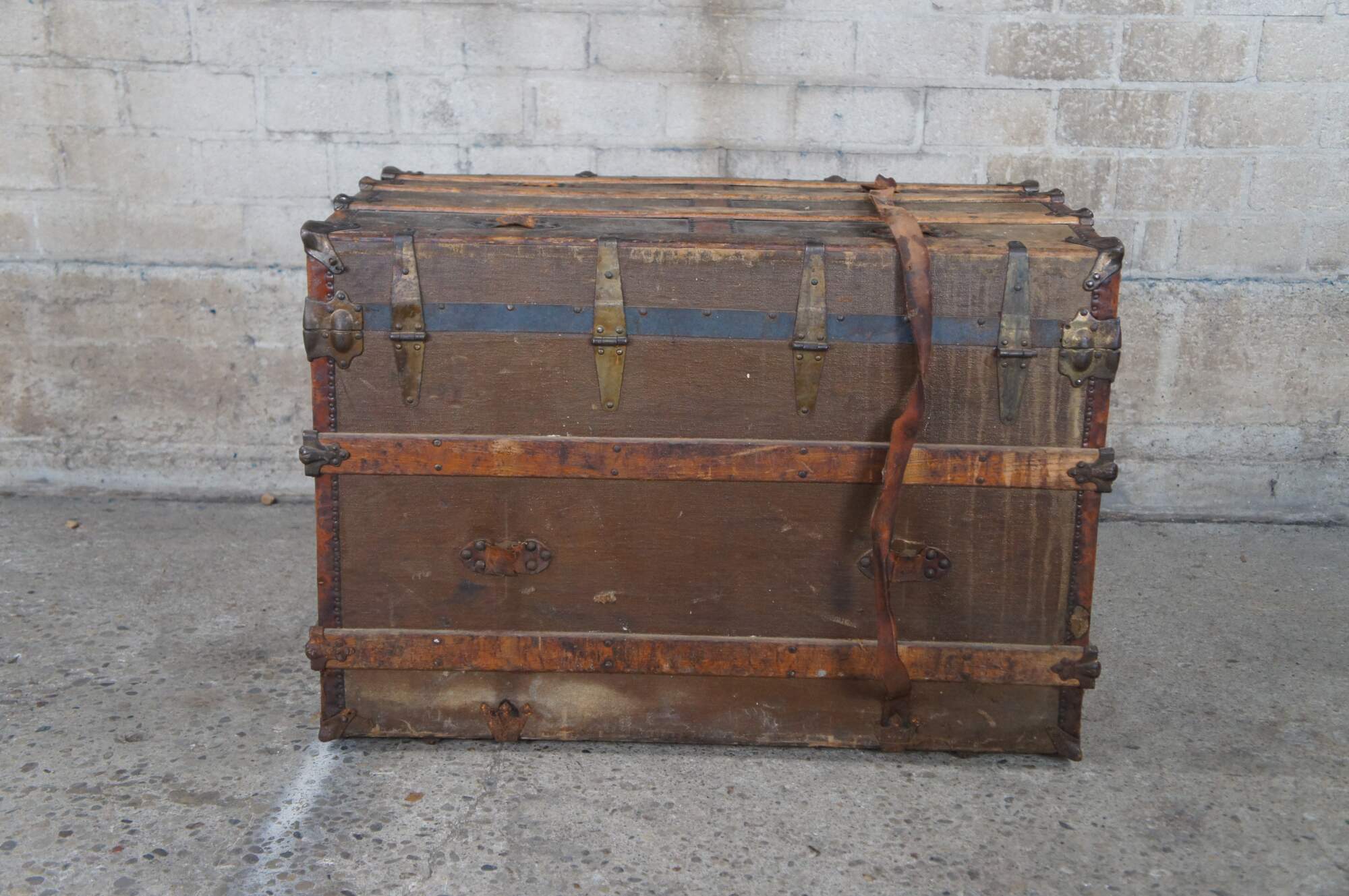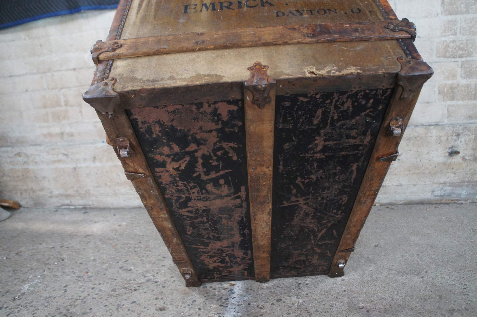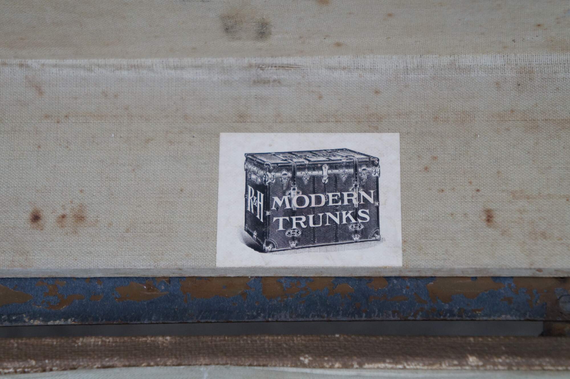 Victorian Era Flat Top Steamer Trunk or Chest by R&H Modern Trunks. Made from wood with a canvas wrap, leather accents and brass hardware. The side of the trunk is Monogrammed M.K.E. The other side reads Emrick Dayton, Ohio. Great for storage or use as a coffee table.