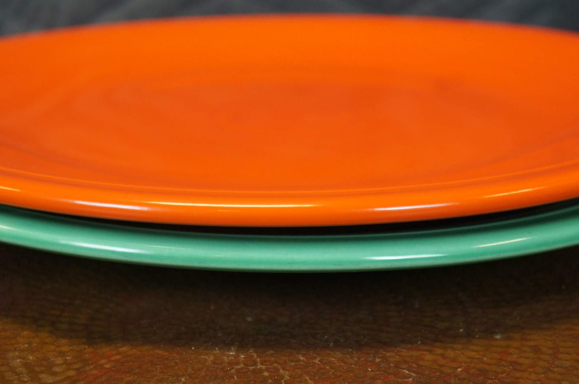 Pair of antique (1936-1942) Fiesta Ware chop plates / round serving platters in Radioactive red / burnt orange and light to medium green.