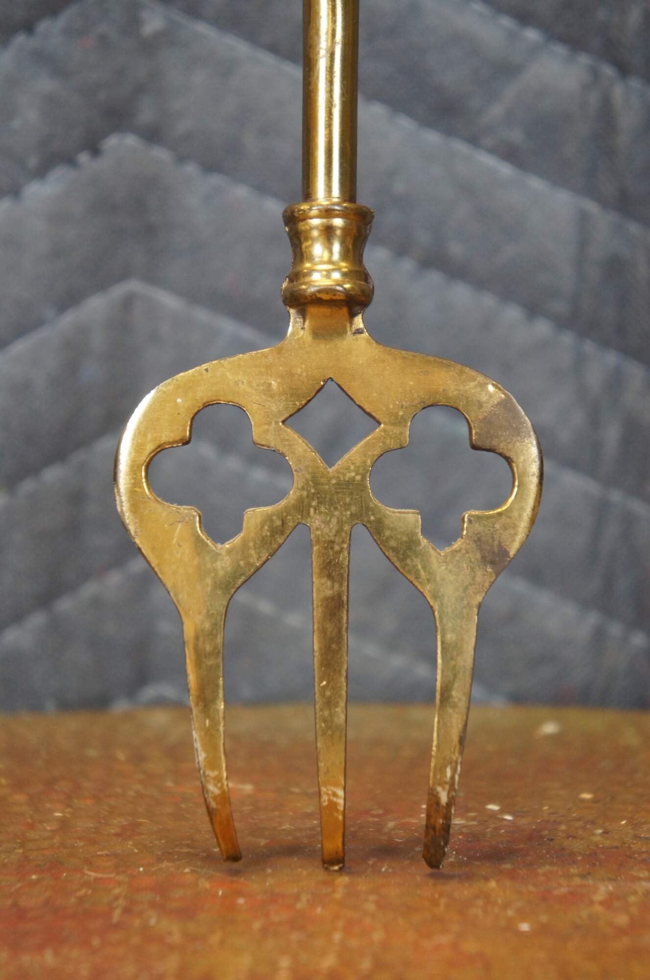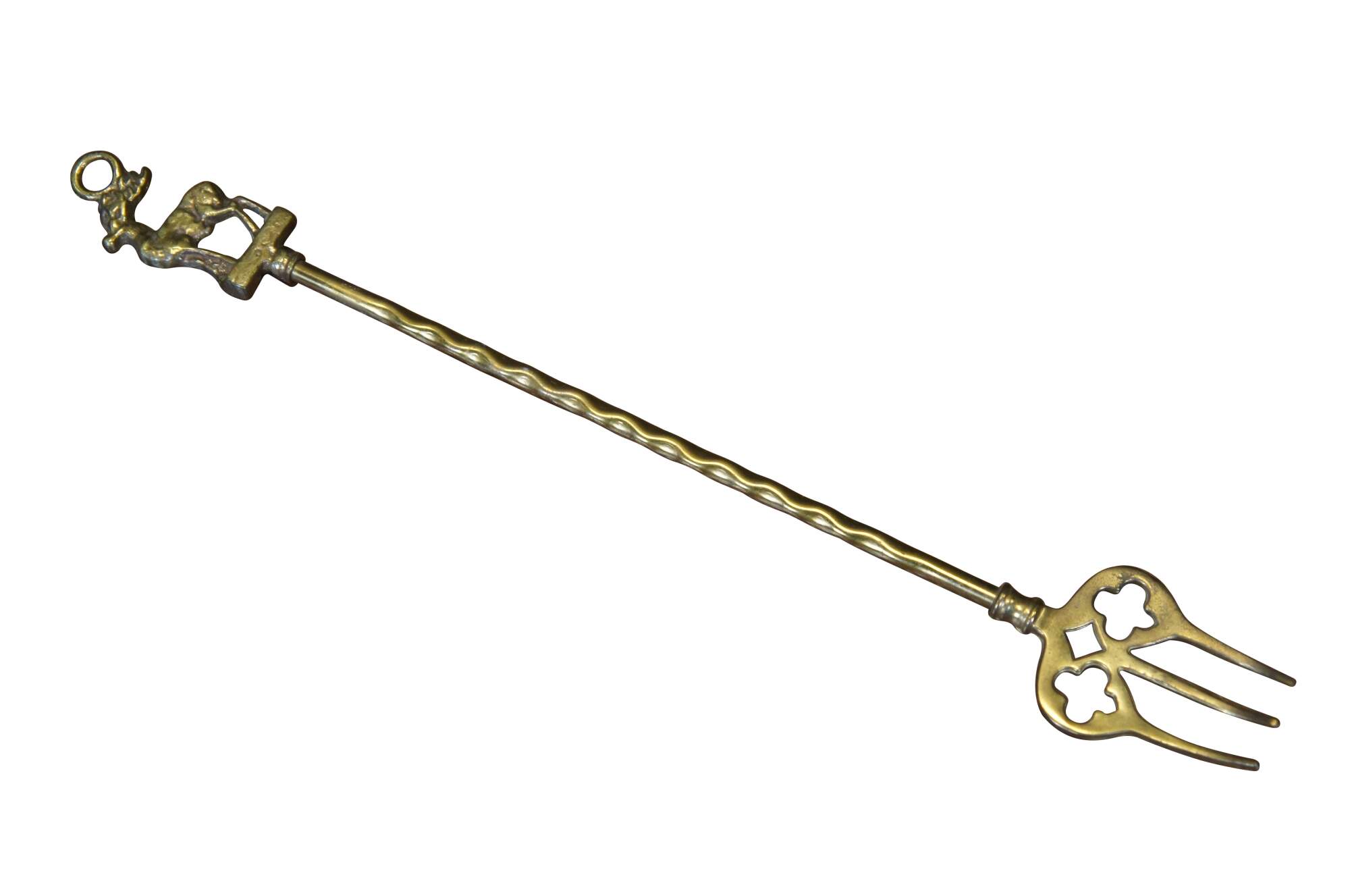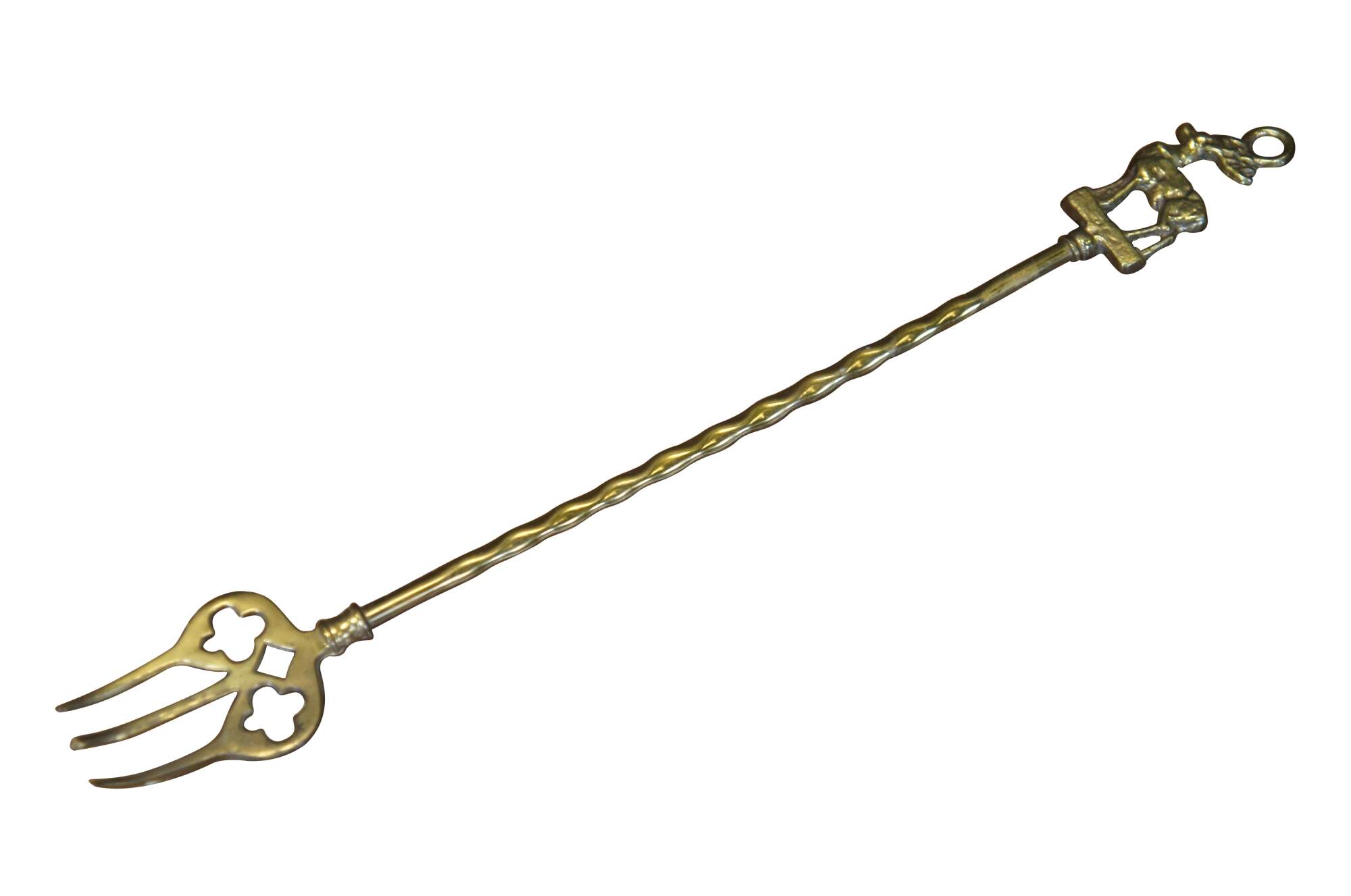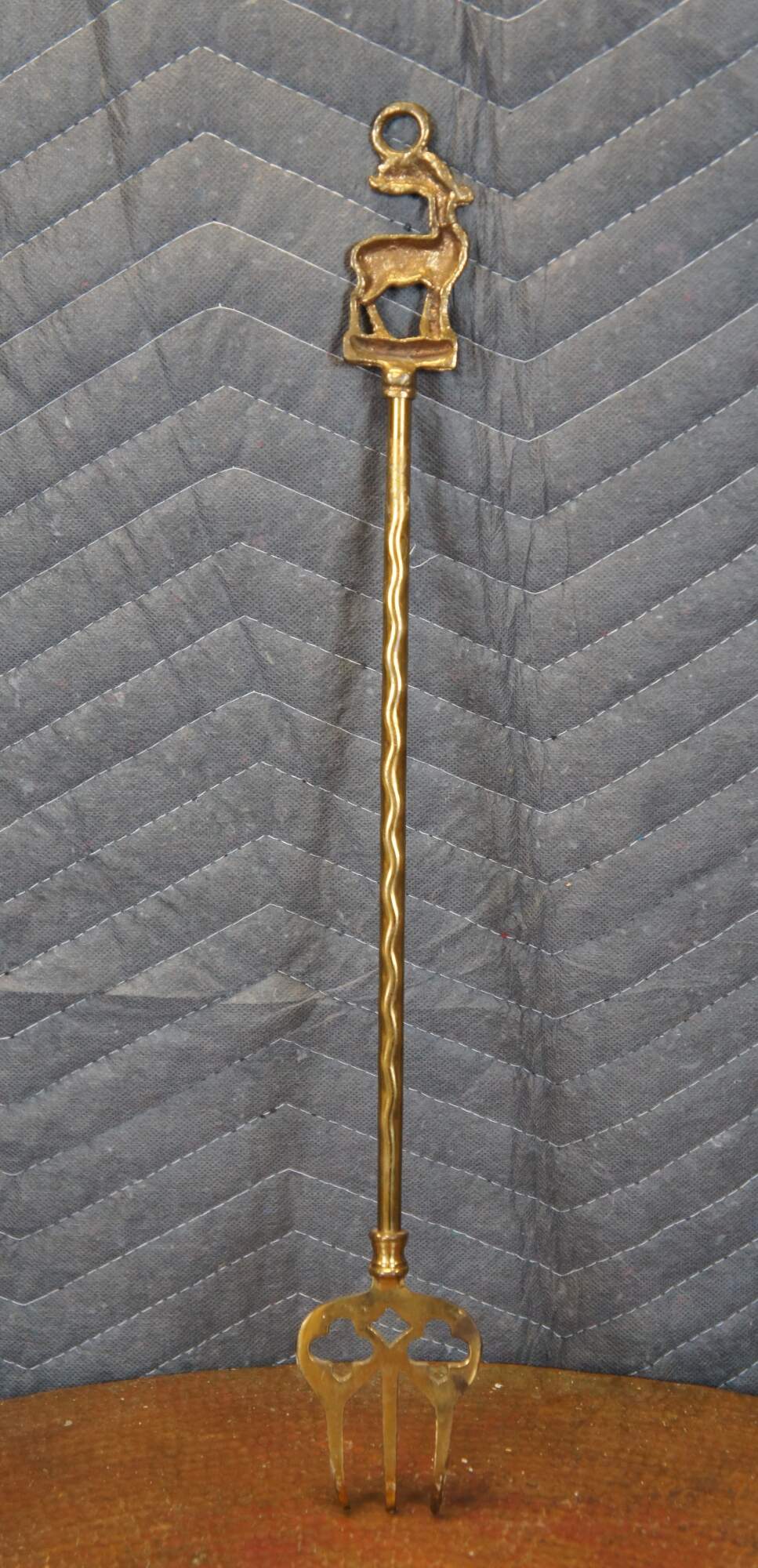 Mid to late 20th century English brass bread / fireplace toasting fork with three prongs, pierced with diamond and quatrefoil cut outs, twisted handle and deer / buck topper. Newtonmore Scrawl.