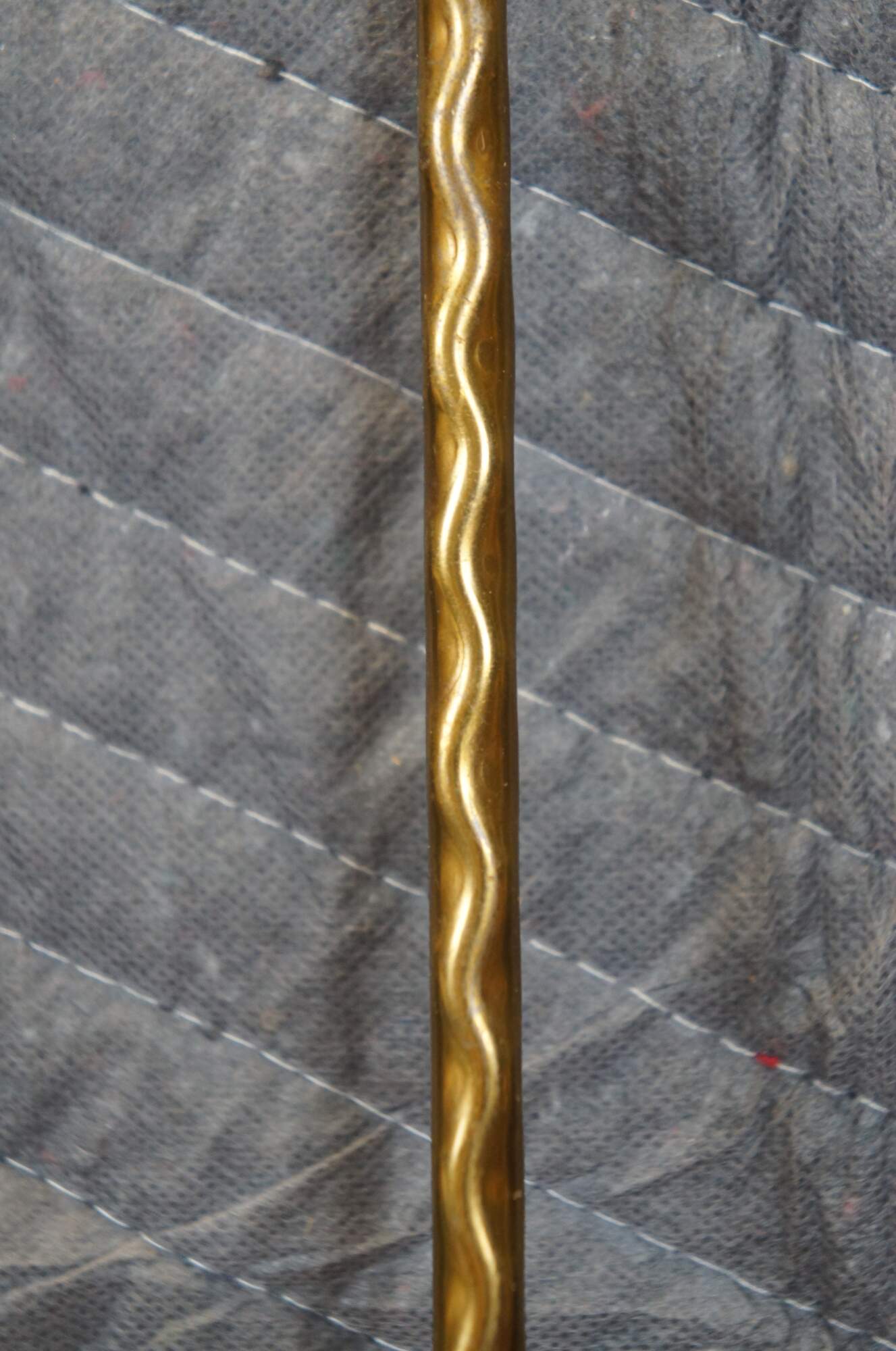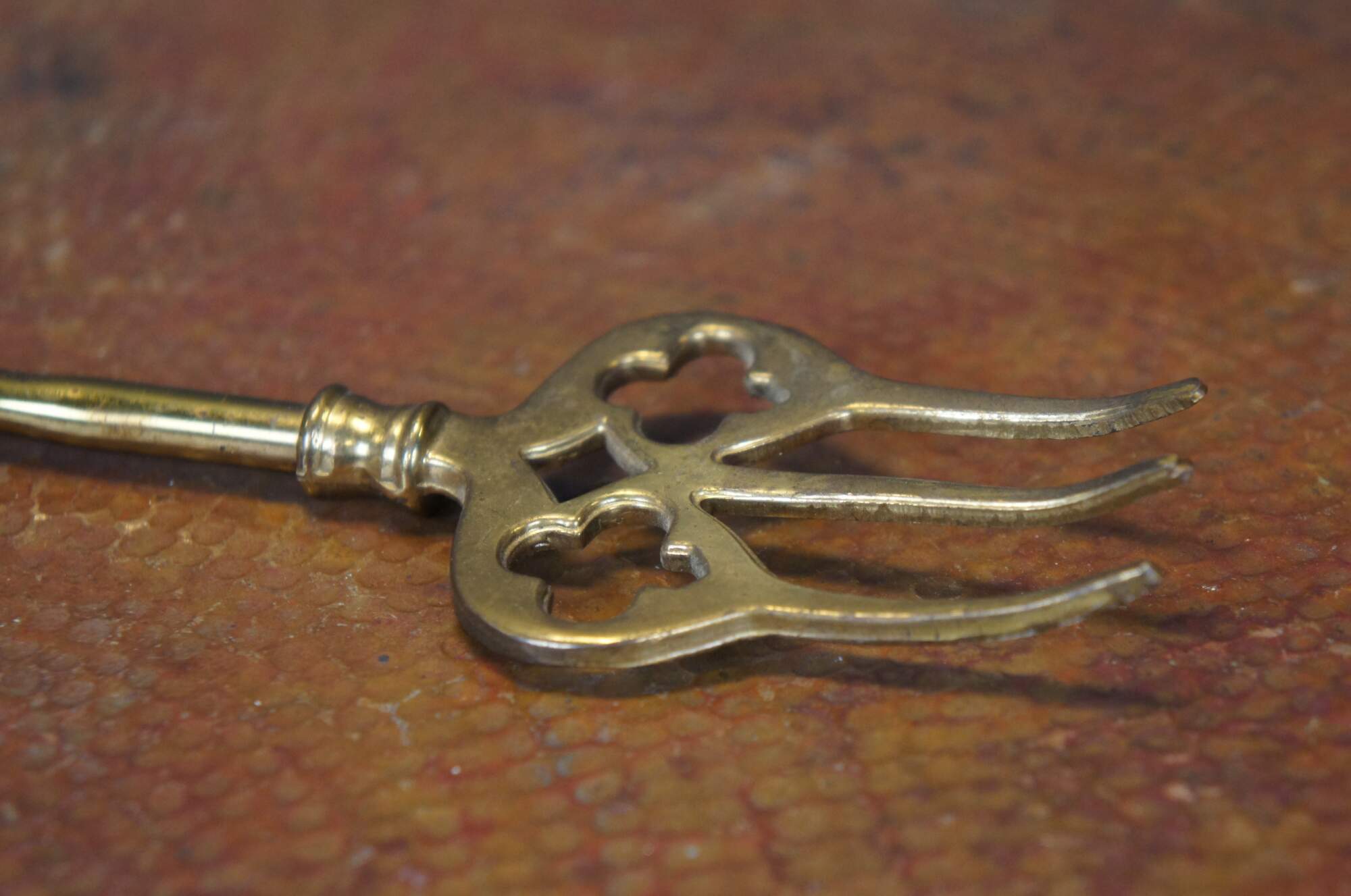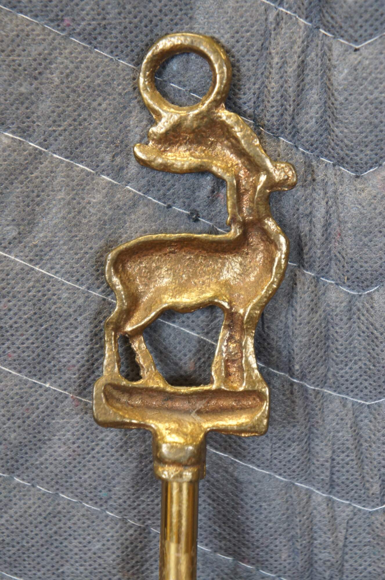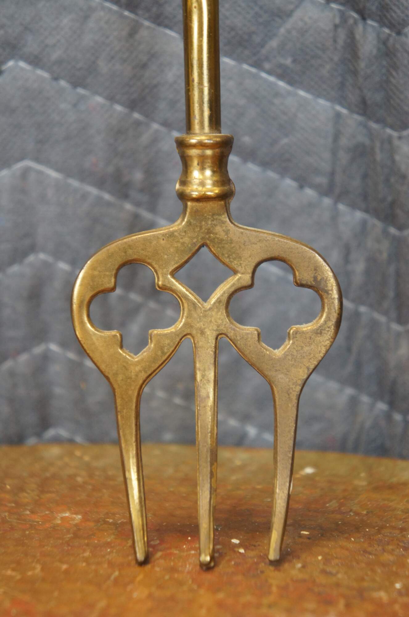Mid to late 20th century English brass bread / fireplace toasting fork with three prongs, pierced with diamond and quatrefoil cut outs, twisted handle and deer / buck topper. Newtonmore Scrawl.