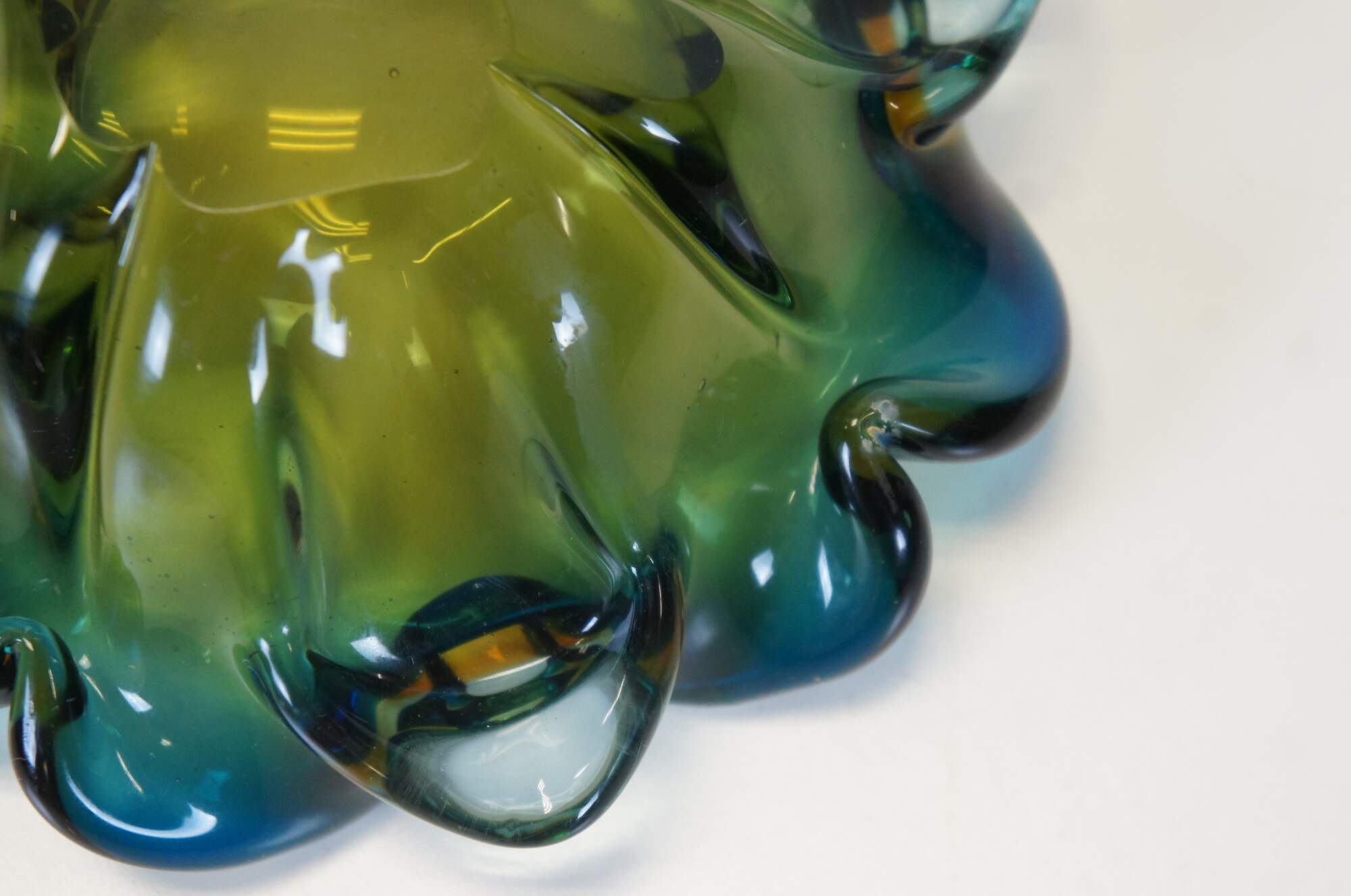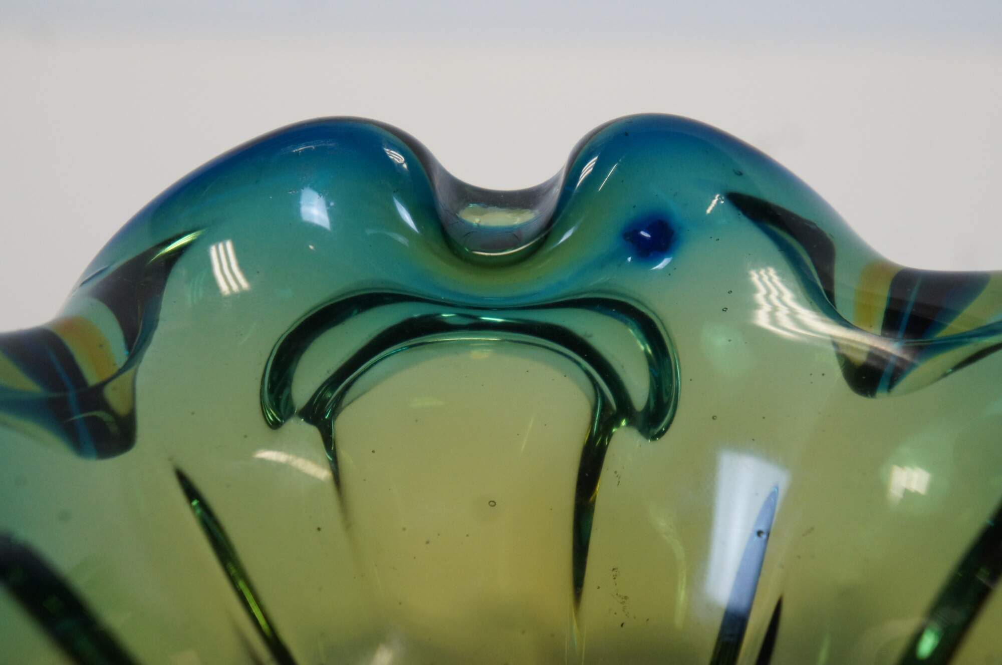 Circa mid 20th century Barovier Toso Murano / Italian hand blown art glass bowl / candy dish / ashtray featuring a freeform flower petal shape and blended navy blue and mustard yellow coloring. Thick / heavy. Flattened, polished base.