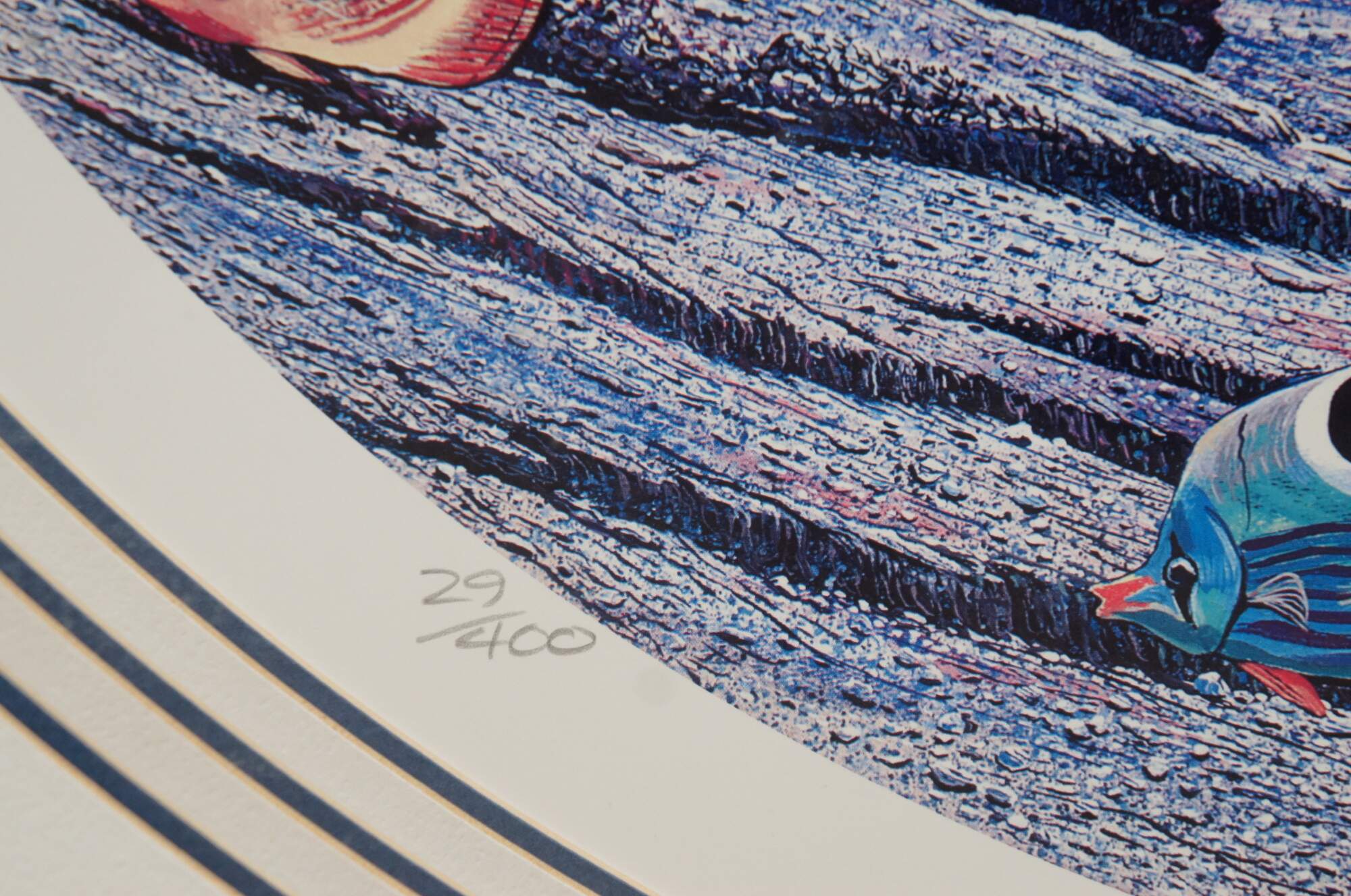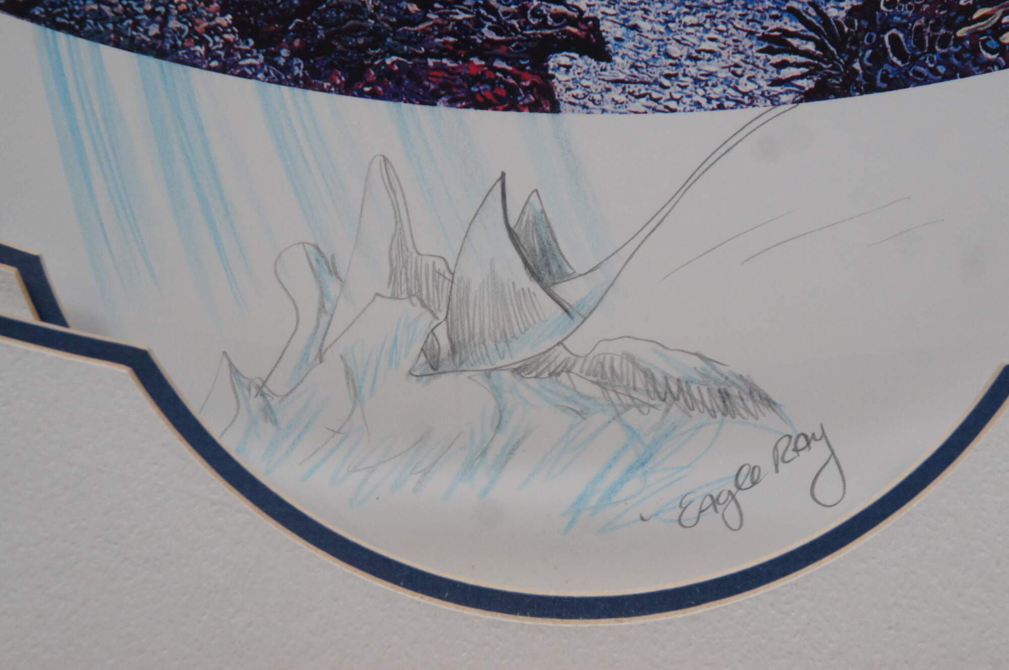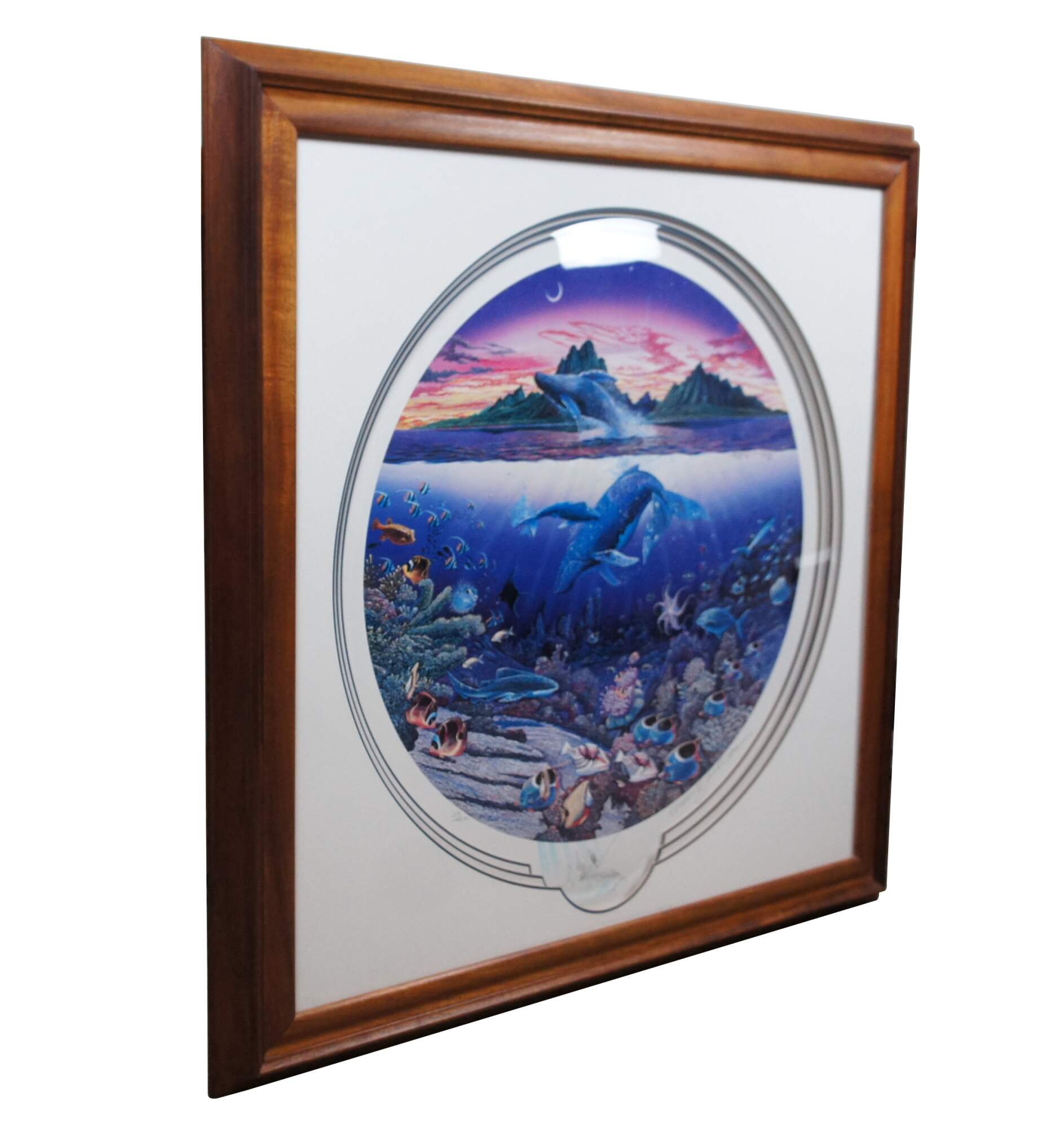 Vintage 1989 off set seascape lithograph print titled "New Moon Over Windward Oahu" by Robert Lyn Nelson. Pencil signed and numbered 29/400, and remarqued with an Eagle Ray sketch at lower edge. Depicts a nautical / maritime / ocean theme of a blue whale breeching the waves in front of the island mountains of Oahu Hawaii under a pink and purple sunset, while beneath the surface two more whales and amyriad of other sea life / fish / octopus / coral fills the ocean floor. White and blue multi-layered mat; shadow box bubble glass front; wood frame with raised bevel.
