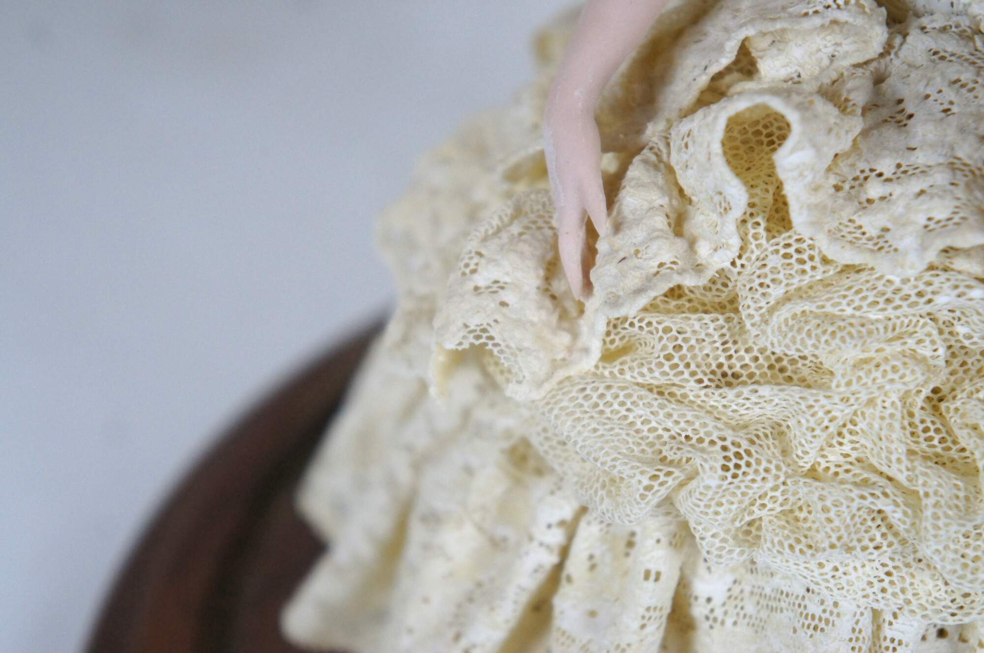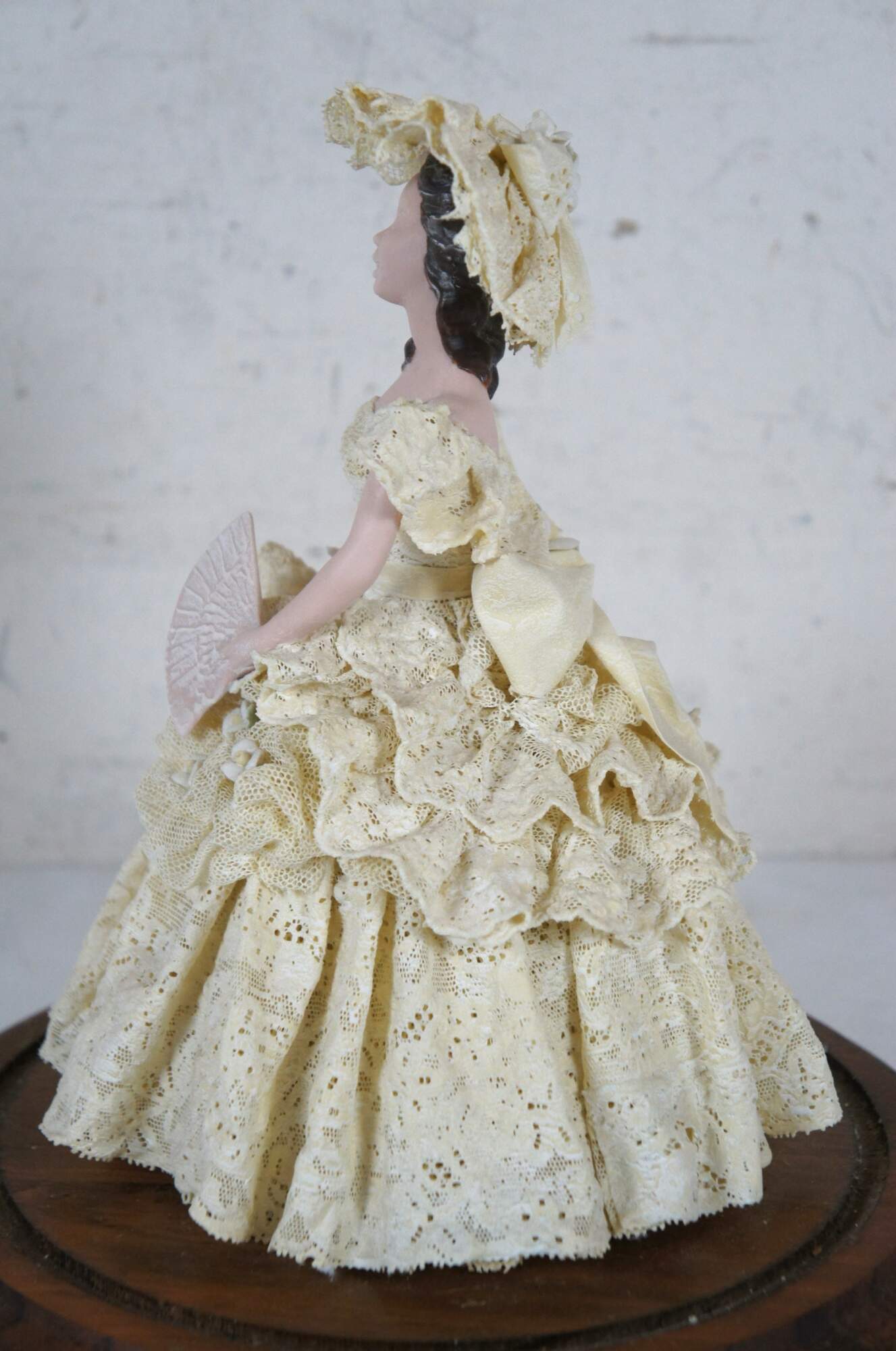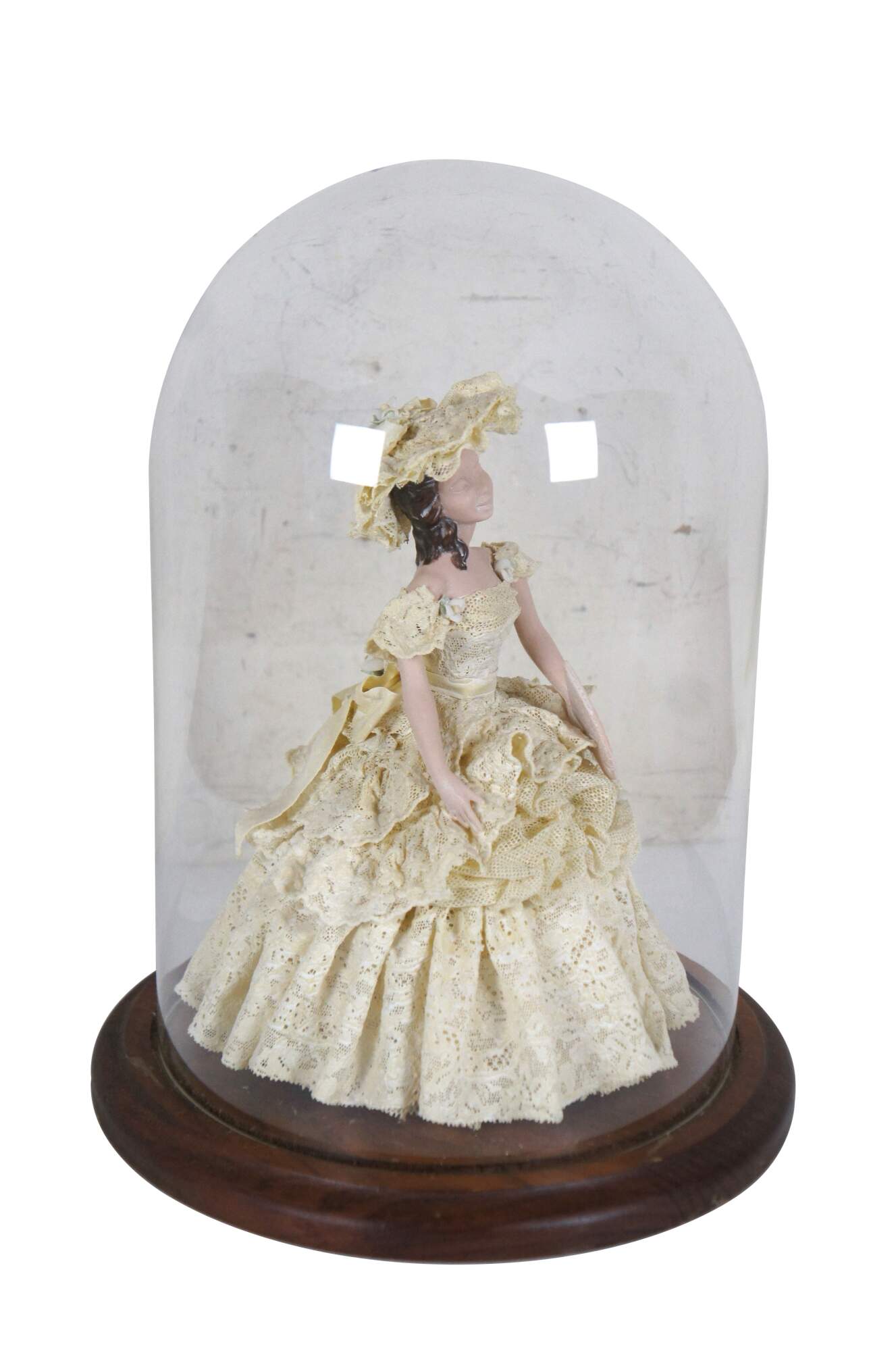 Circa mid 20th century unglazed figurine of a woman with brown hair and a fan in one hand, dressed in a circa 1860s ball gown and bonnet of off white porcelain lace and small roses. Mounted to round wooden base with apothecary bell jar.