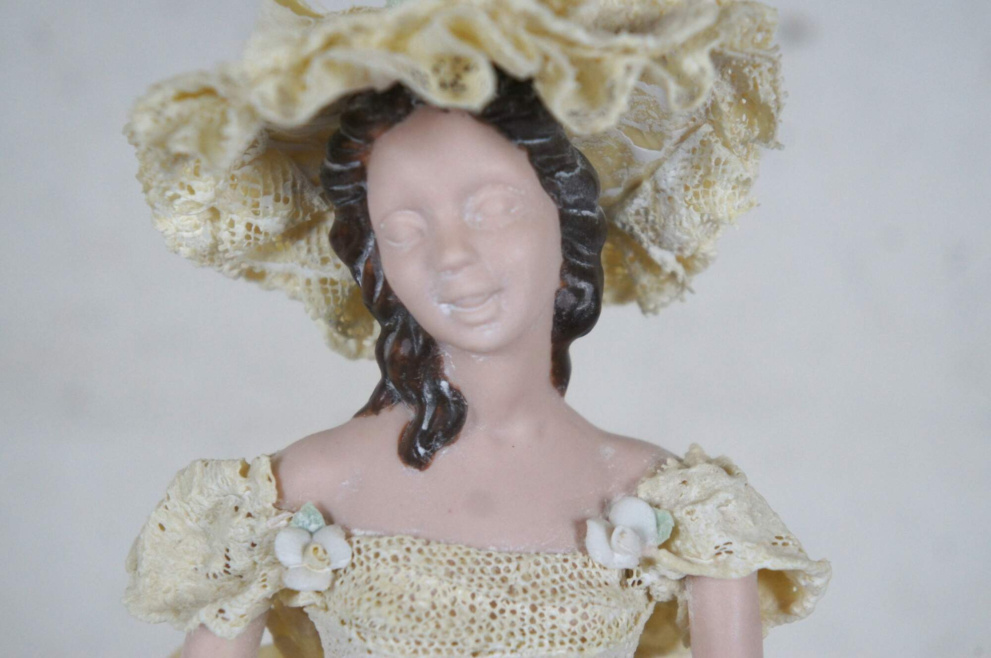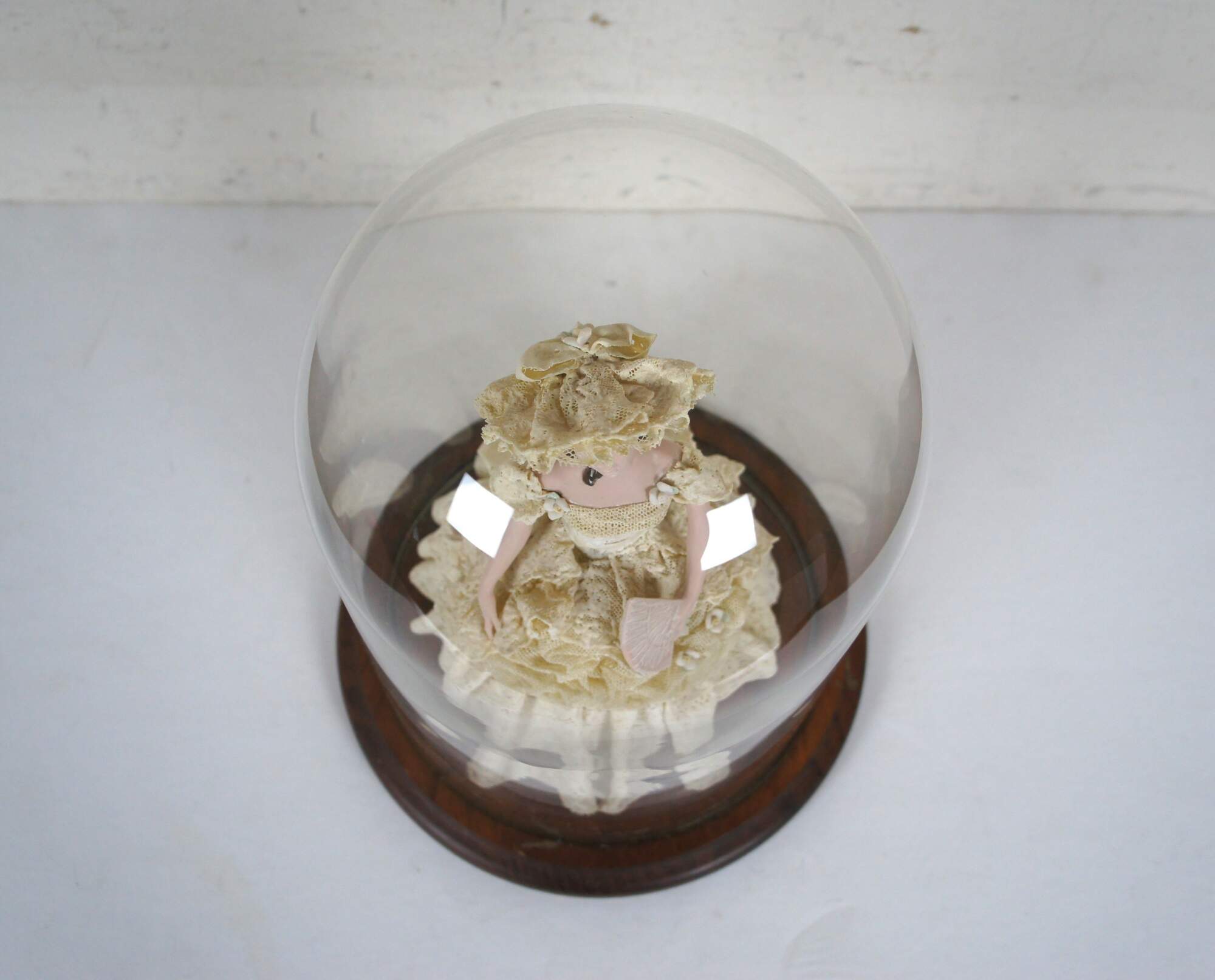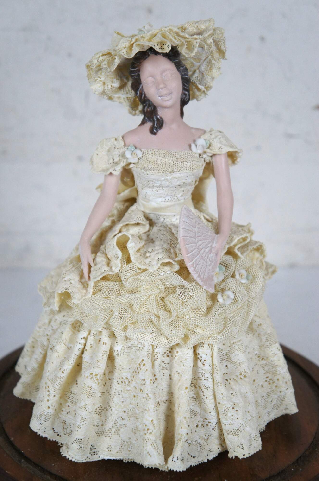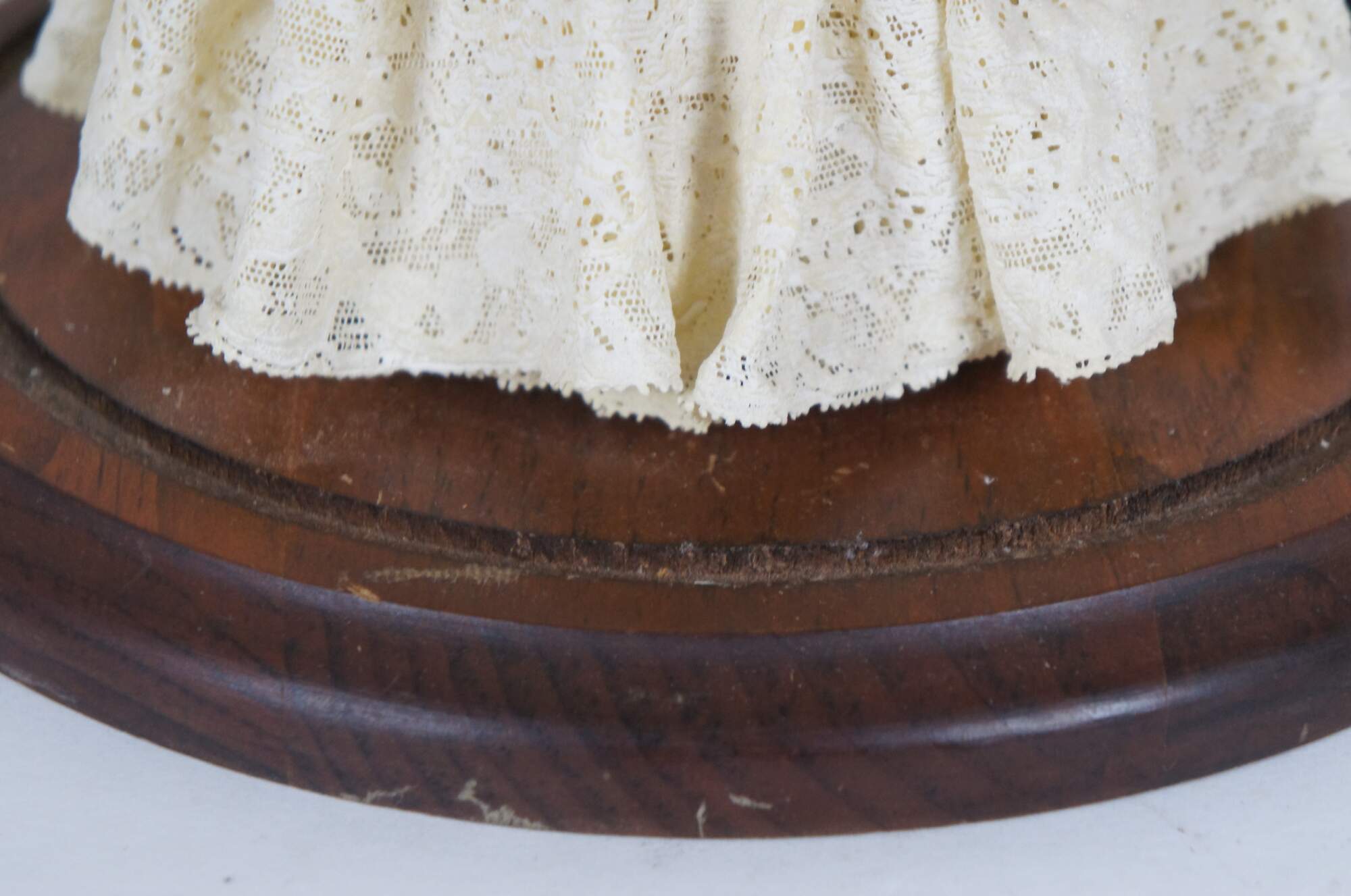 Circa mid 20th century unglazed figurine of a woman with brown hair and a fan in one hand, dressed in a circa 1860s ball gown and bonnet of off white porcelain lace and small roses. Mounted to round wooden base with apothecary bell jar.