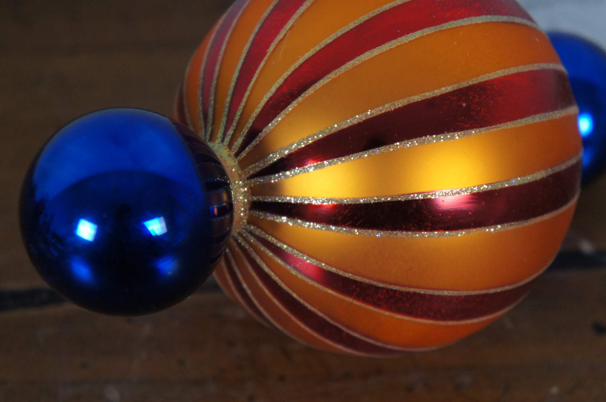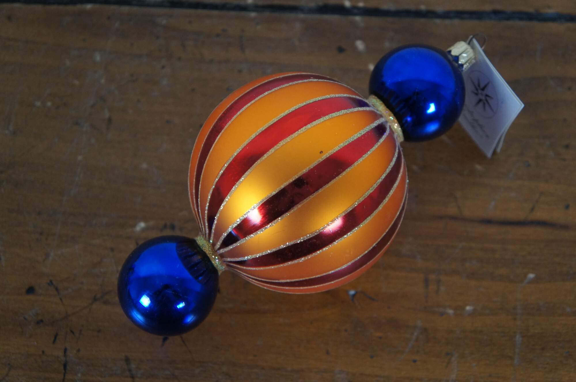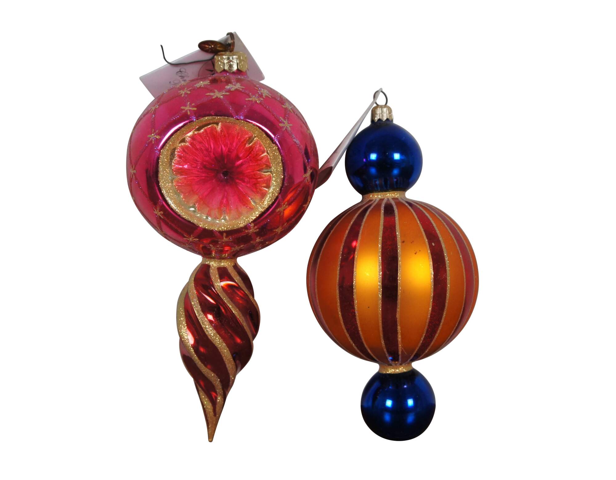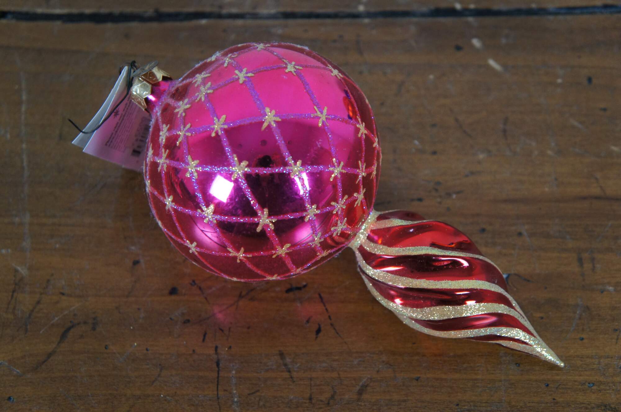 Vintage late 20th century Christopher Radko and Waterford hand painted, blown glass Christmas / holiday ornaments. Christopher Radkos feature - red, orange and blue Bright Circus Stripes (99-346-0) and pink and gold Star Reflection (00-343-0). Includes original tags. Made in Poland. Waterford feature a boxed pair of Waterford blown glass, gold and white swirl Golden Icicle (100-318-00-00). Handmade in Czech Republic.