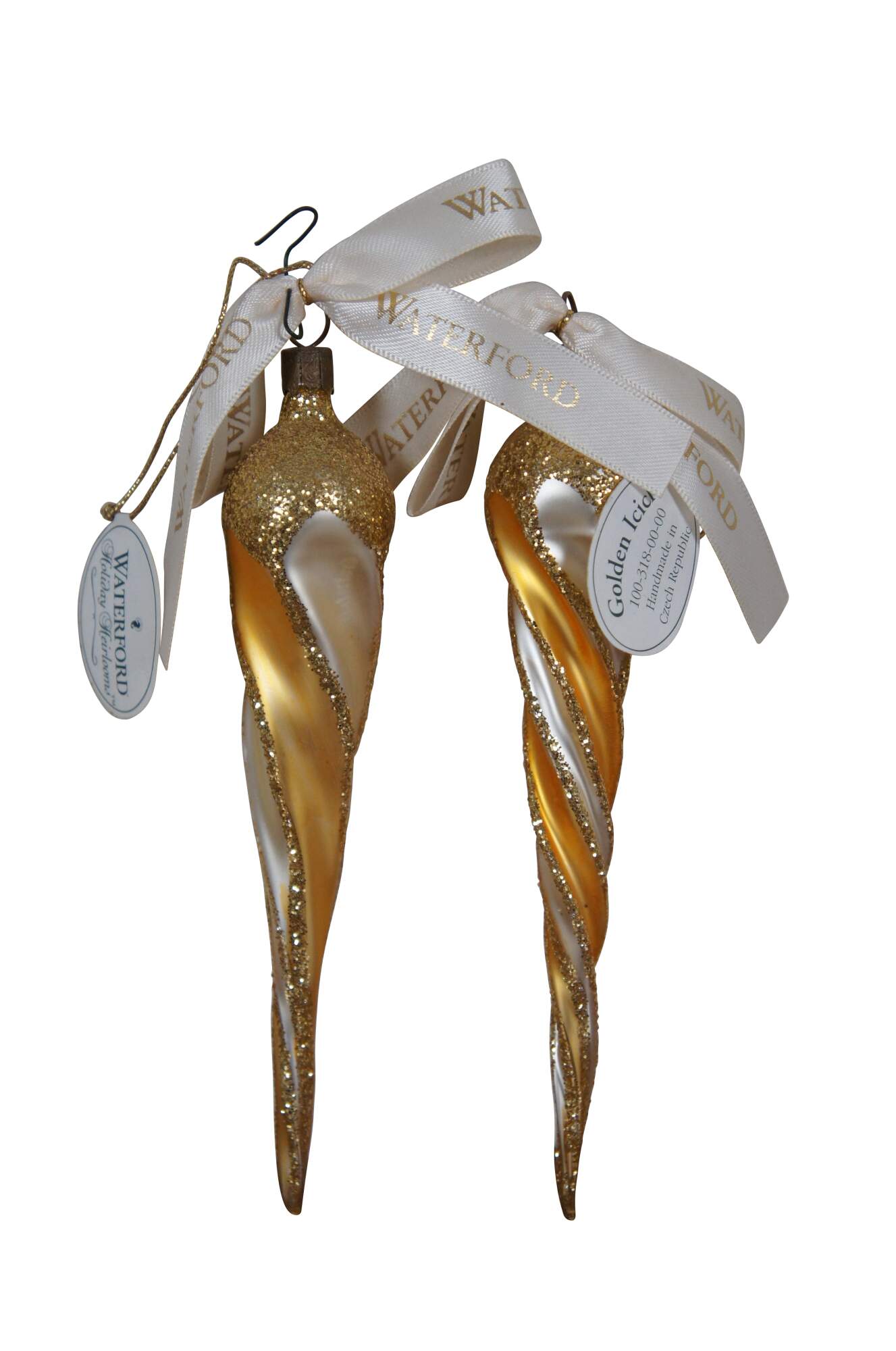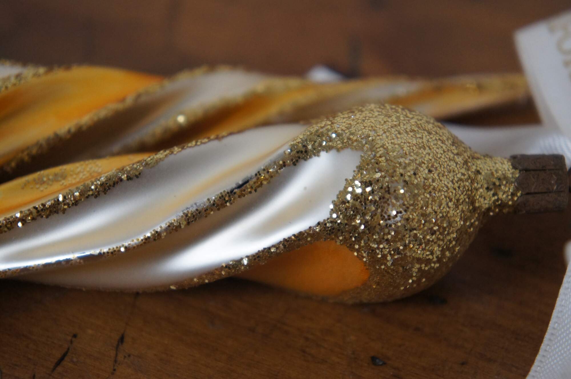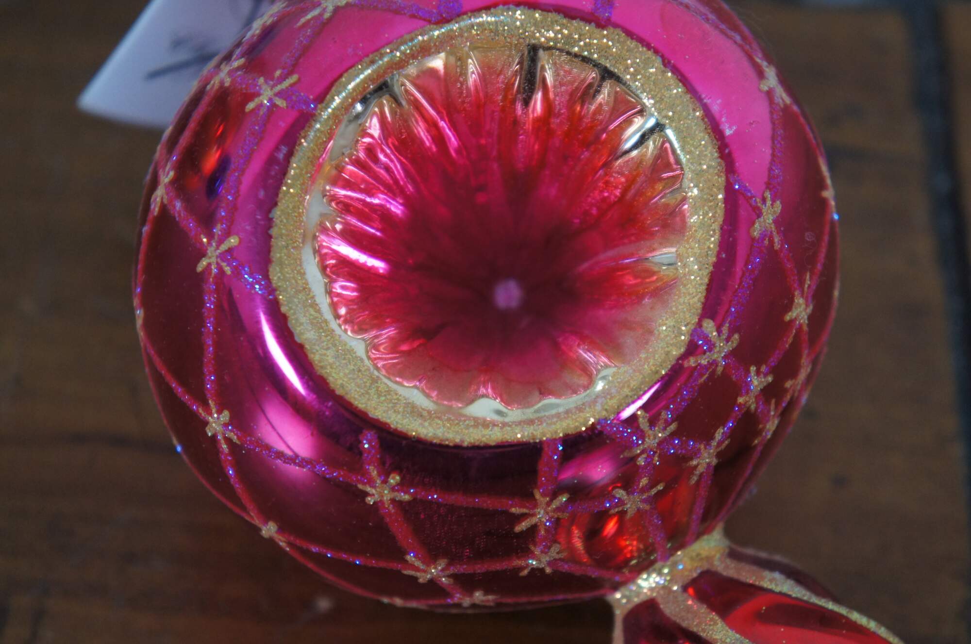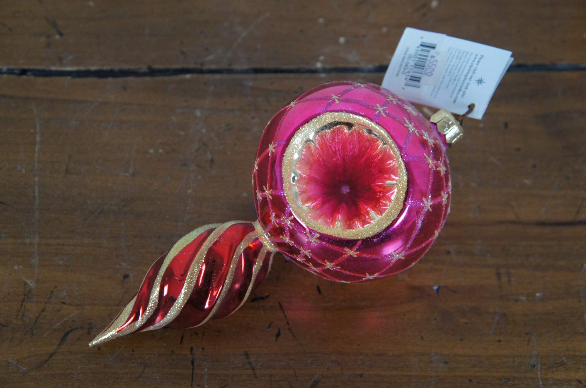 Vintage late 20th century Christopher Radko and Waterford hand painted, blown glass Christmas / holiday ornaments. Christopher Radkos feature - red, orange and blue Bright Circus Stripes (99-346-0) and pink and gold Star Reflection (00-343-0). Includes original tags. Made in Poland. Waterford feature a boxed pair of Waterford blown glass, gold and white swirl Golden Icicle (100-318-00-00). Handmade in Czech Republic.