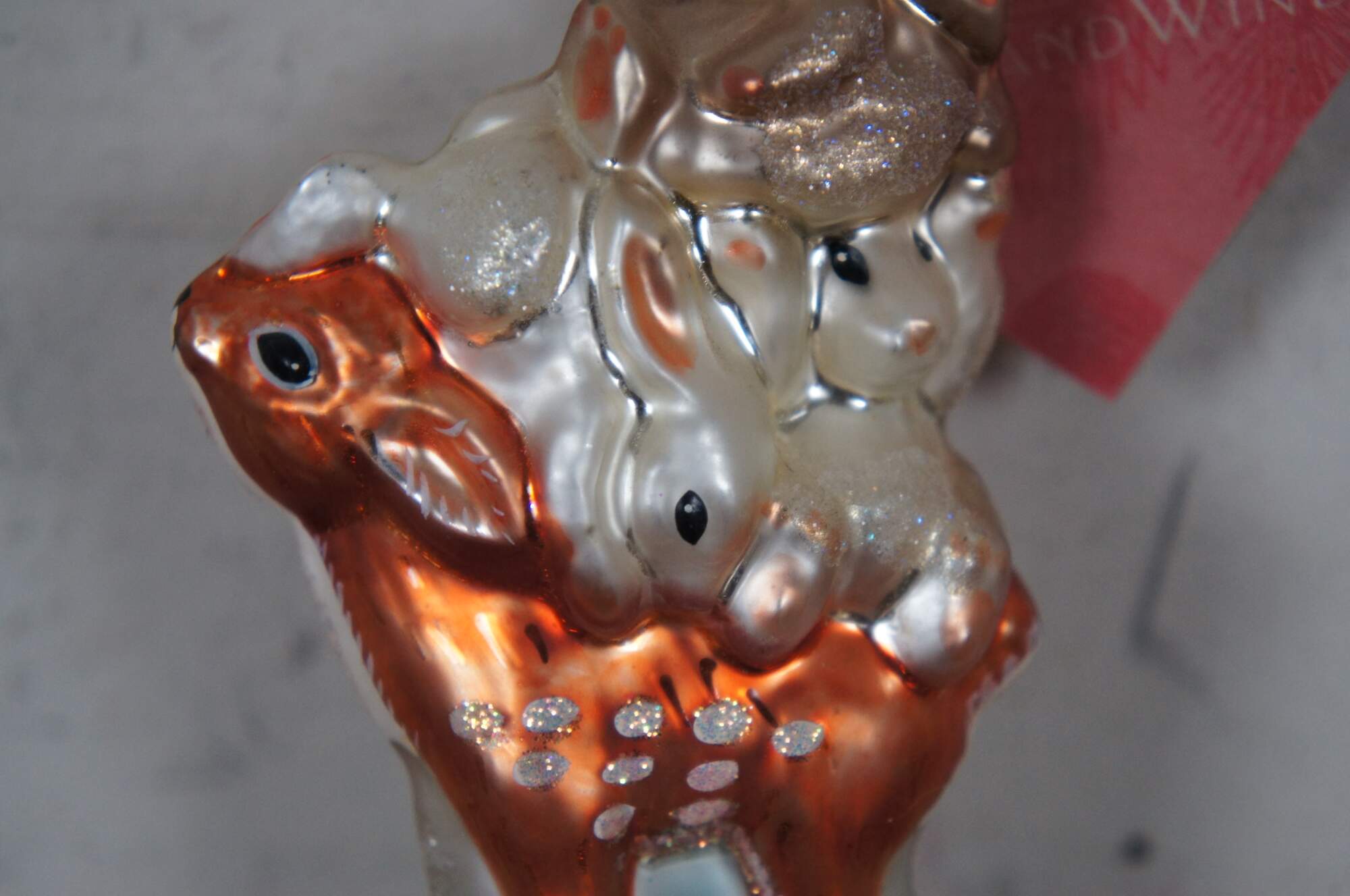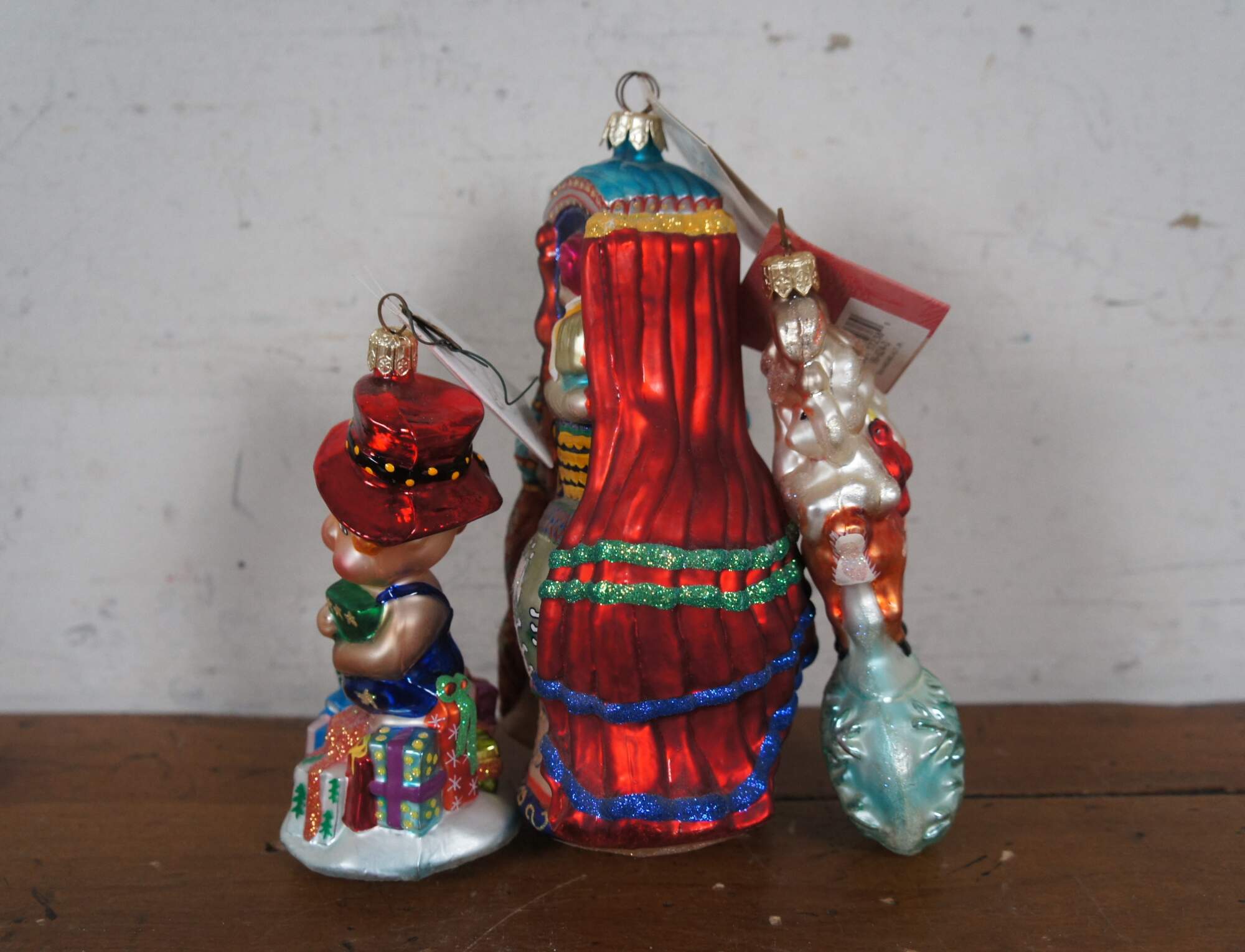 Lot of three late 20th century Christopher Radko for Starad, Inc blown glass, hand painted Christmas / holiday ornaments - Woodland Winds Balancing Act Jr (99-924-0), Sultan's Pride (99-105-0), and 2000 Pediatric Cancer Charities Gift of Health (00-SP-73). Includes original tags. Made in Poland.