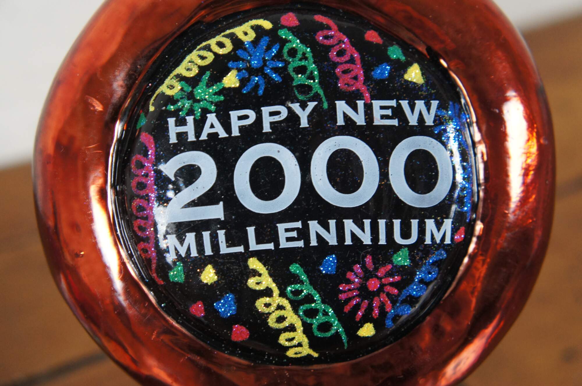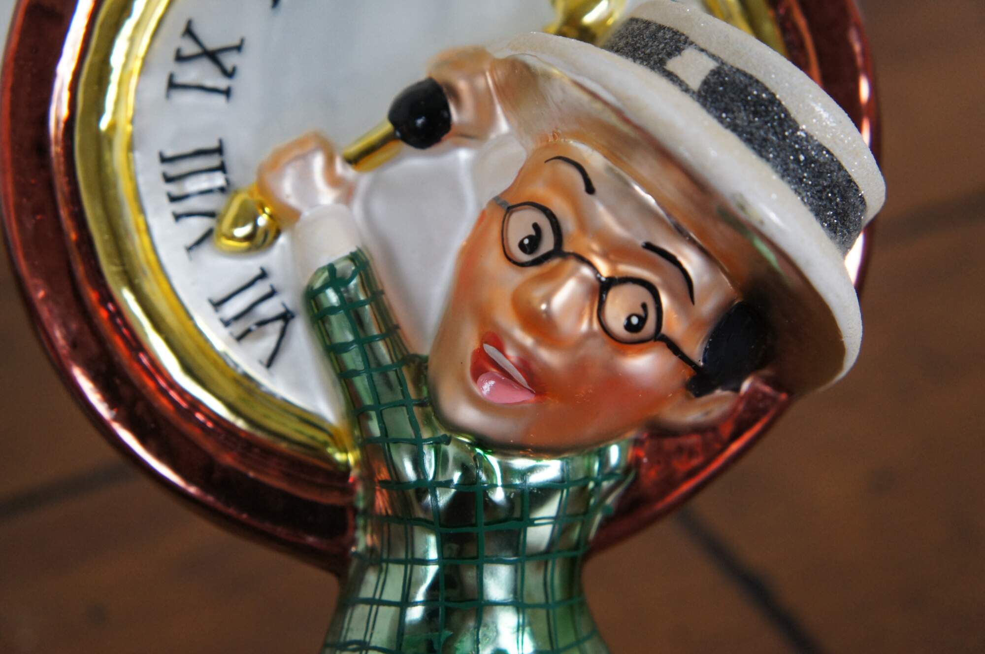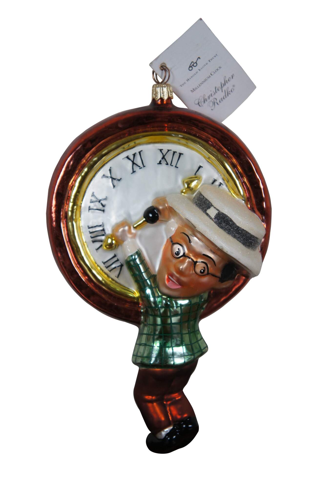 Lot of three late 20th century Christopher Radko for Starad, Inc blown glass, hand painted Christmas / holiday ornaments - Sultan's Pride (99-105-0), Harold Lloyd Trust Millenium Clock (99-LYD-01), and 2000 Pediatric Cancer Charities Gift of Health (00-SP-73). Includes original tags. Made in Poland.
