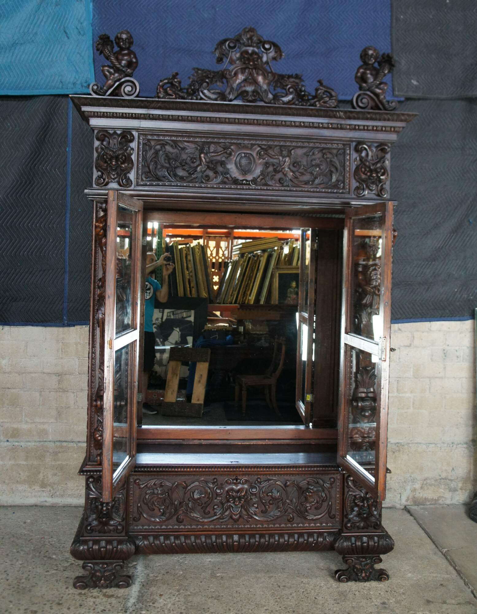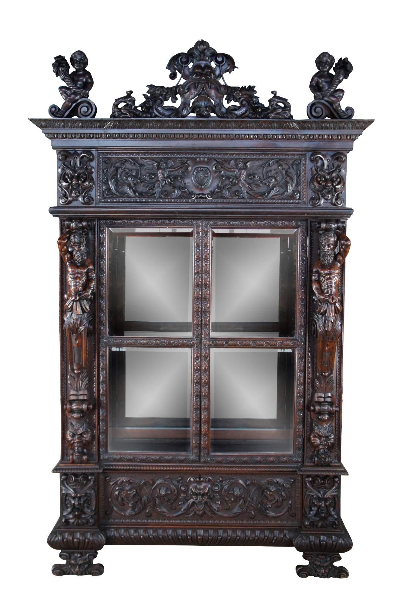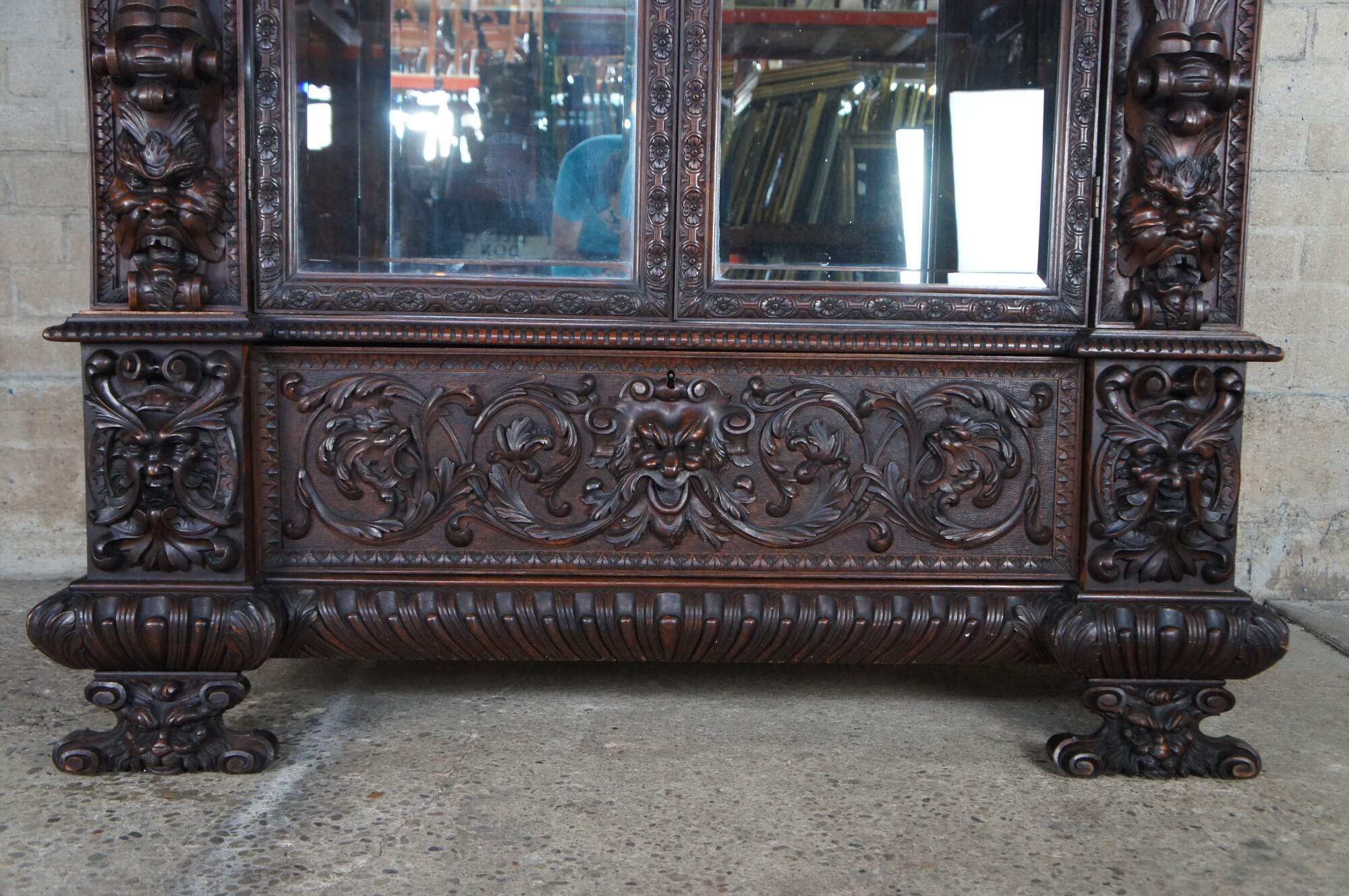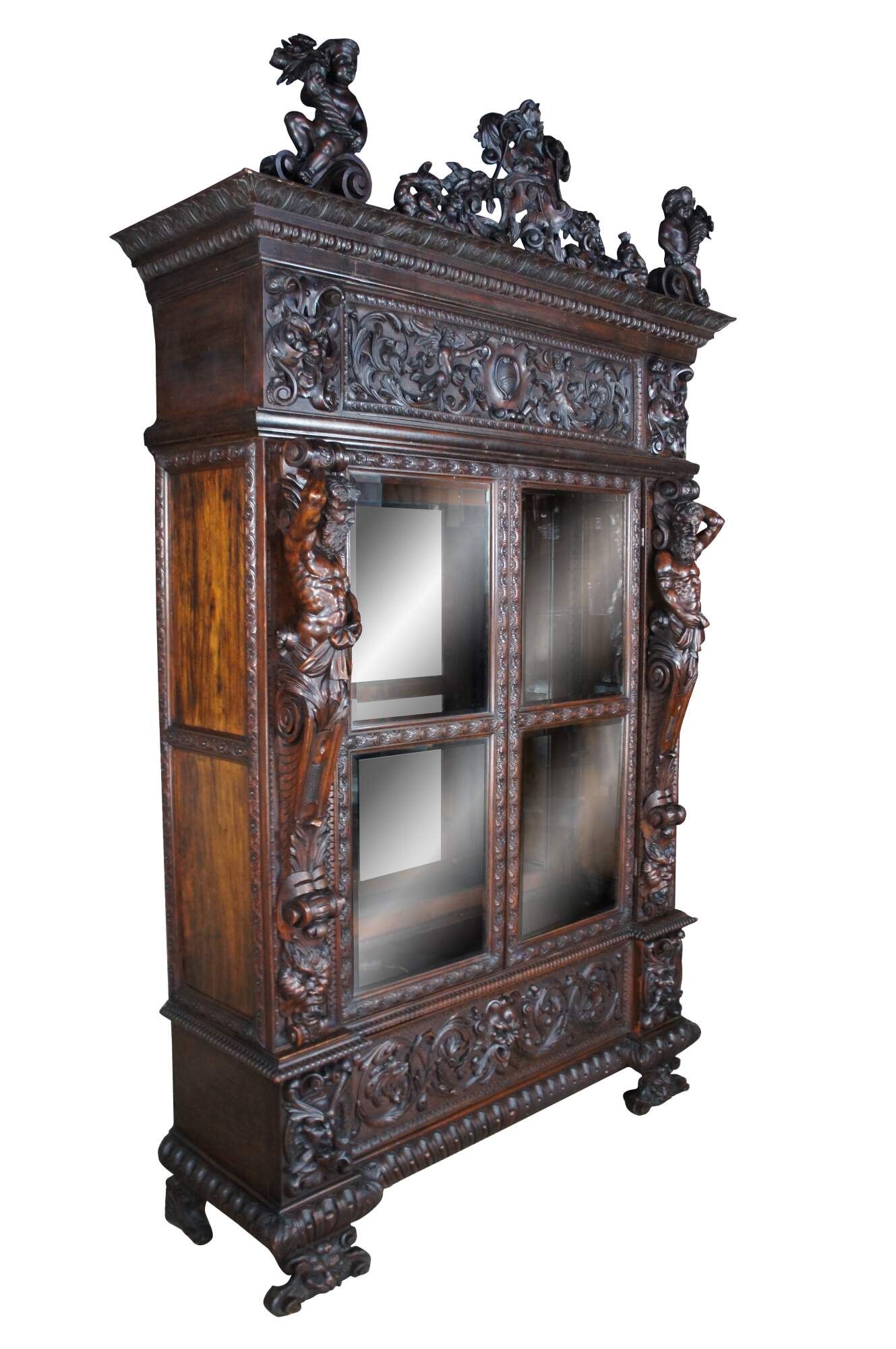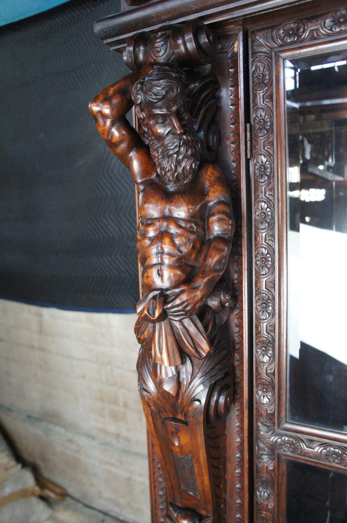 A monumental, rare and exceptional pair of R.J. Horner bookcases / china display cabinets from the Gilded Age, circa 1880s. Drawing inspiration from Italian Baroque, Renaissance and Gothic Architecture. The case is hand carved from mahogany featuring two glass display doors with carved floret medallions flanked by 2 large bearded figural Atlas side pilasters, holding a garment at their waist and scrolled corbel overhead, above gnarled masks. Each cabinets frieze showcases a baroque shield flanked by winged messenger's, scrolling acanthus foliate and grotesque Green Man figures. The crowns are beaded and acanthus carved beneath a large Northwind face, scrolled and scalloped with ornate foliate and flanked by two dragon figures. The corners are topped by cherubs poised on S scrolls with outward facing cornucopias in hand. The lower side of the cabinet houses a large hand dovetailed drawer centered by a Northwind face with scrolling acanthus foliate and inward facing mythical figures. The drawer is flanked by large Green man faces above a robust lower apron, gadrooned over scrolled lion feet. The cabinet opens to a mirrored backing with sawtooth supports allowing for the addition of several shelves.