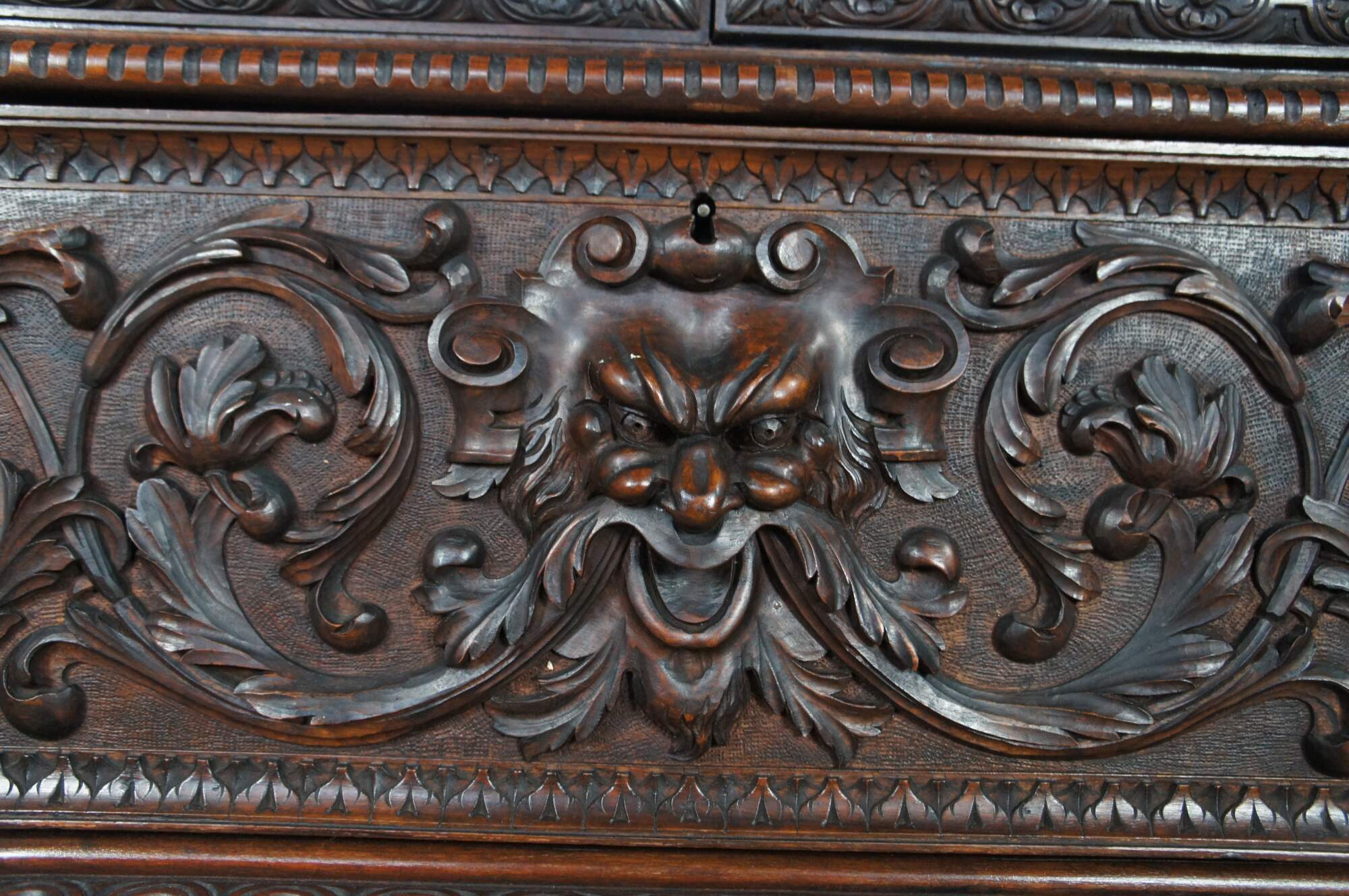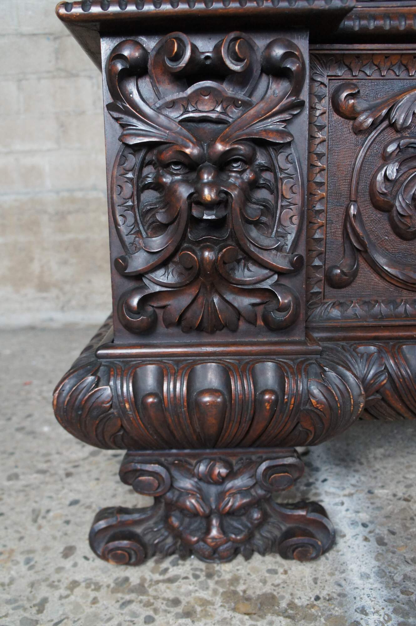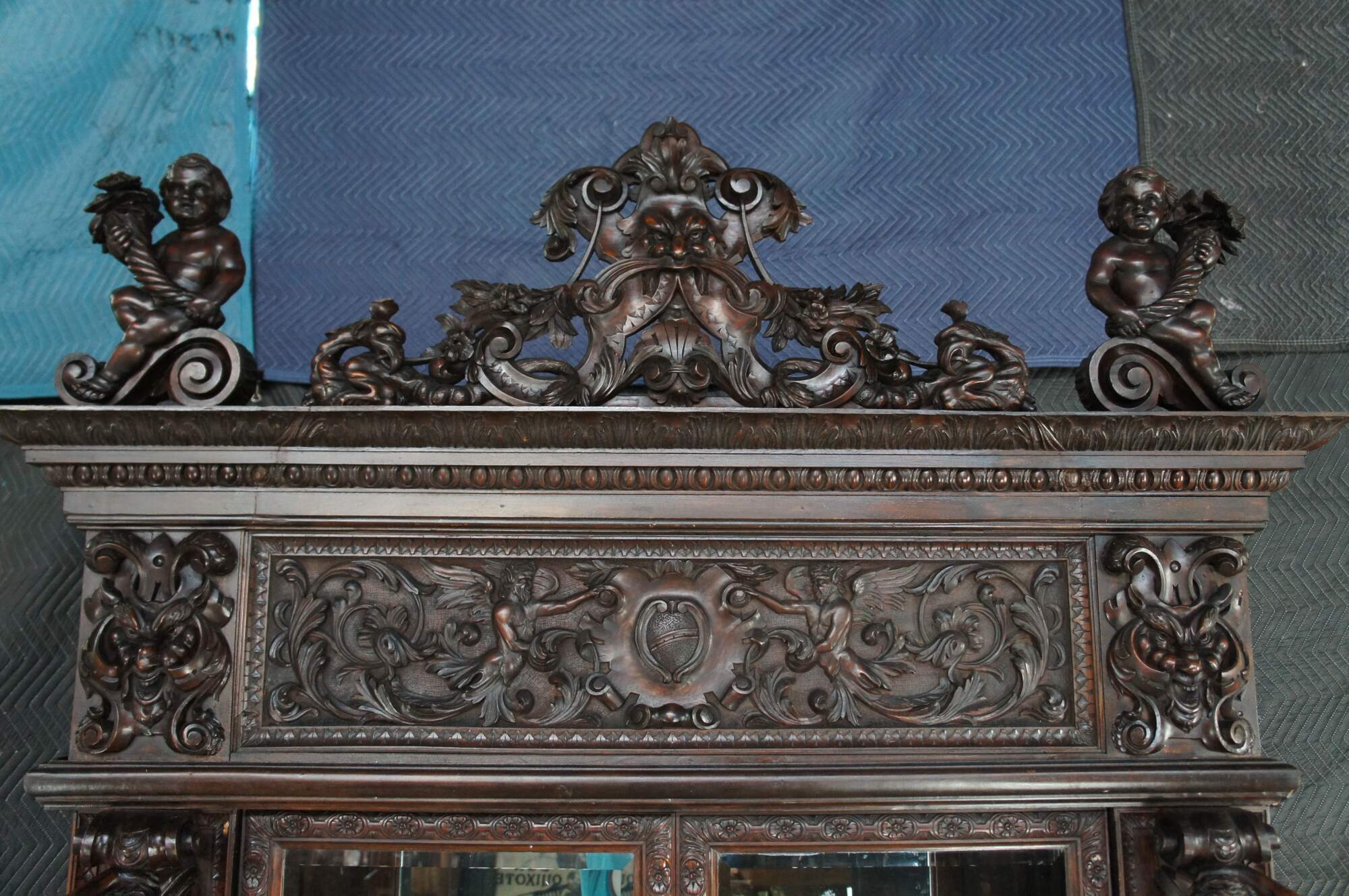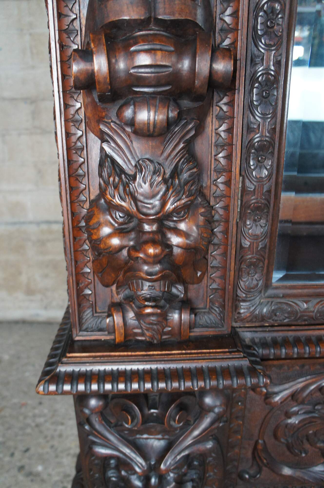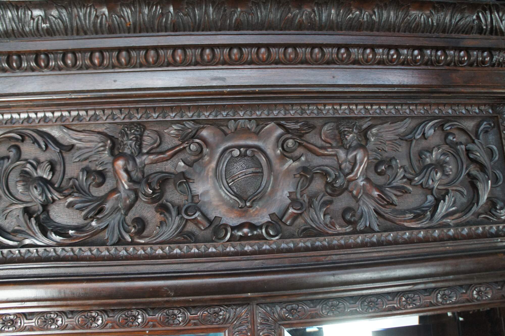 A monumental, rare and exceptional pair of R.J. Horner bookcases / china display cabinets from the Gilded Age, circa 1880s. Drawing inspiration from Italian Baroque, Renaissance and Gothic Architecture. The case is hand carved from mahogany featuring two glass display doors with carved floret medallions flanked by 2 large bearded figural Atlas side pilasters, holding a garment at their waist and scrolled corbel overhead, above gnarled masks. Each cabinets frieze showcases a baroque shield flanked by winged messenger's, scrolling acanthus foliate and grotesque Green Man figures. The crowns are beaded and acanthus carved beneath a large Northwind face, scrolled and scalloped with ornate foliate and flanked by two dragon figures. The corners are topped by cherubs poised on S scrolls with outward facing cornucopias in hand. The lower side of the cabinet houses a large hand dovetailed drawer centered by a Northwind face with scrolling acanthus foliate and inward facing mythical figures. The drawer is flanked by large Green man faces above a robust lower apron, gadrooned over scrolled lion feet. The cabinet opens to a mirrored backing with sawtooth supports allowing for the addition of several shelves.
