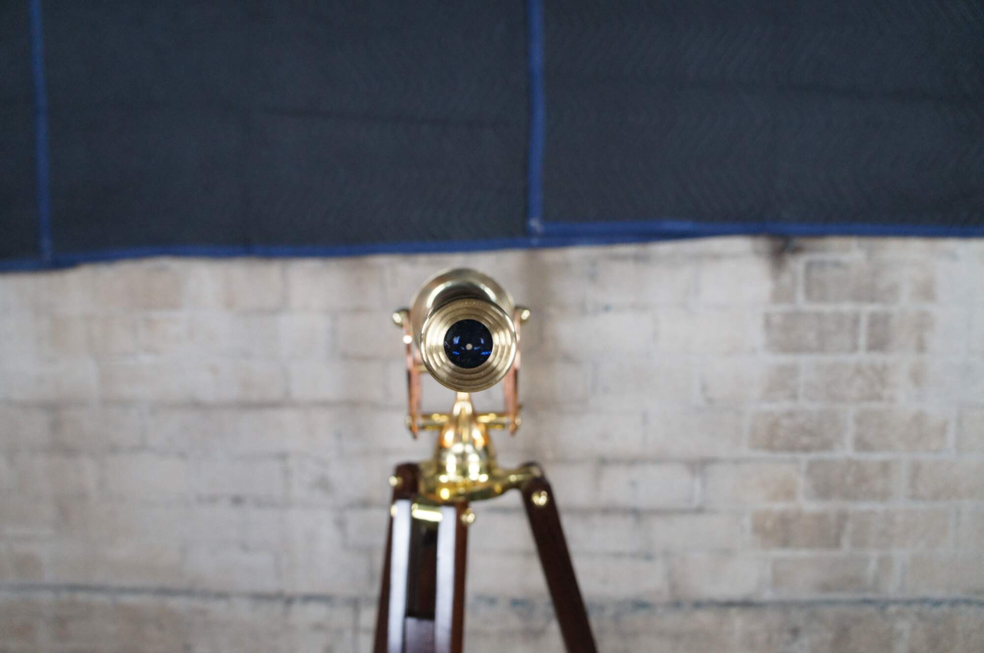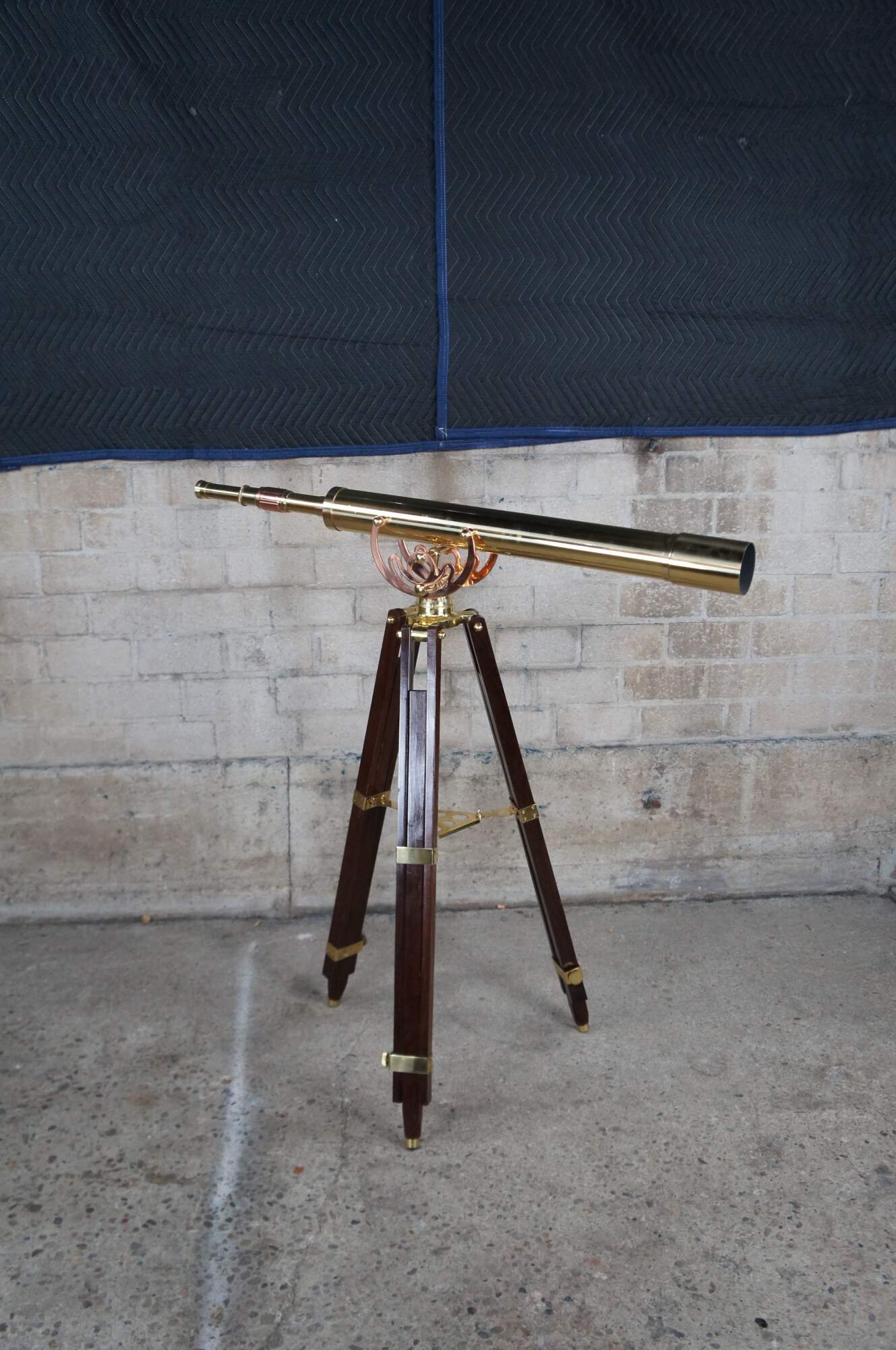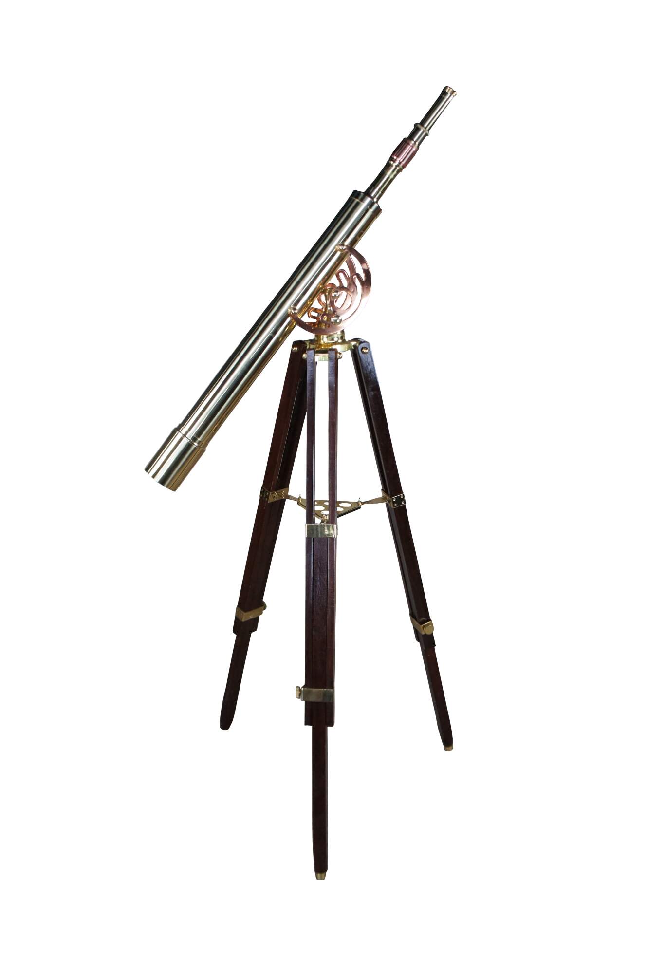 An exquisite brass spyglass telescope by Zhumell. Features a large scope mounted to a copper swing over a mahogany brass accented articulating base. Circa last quarter 20th Century.