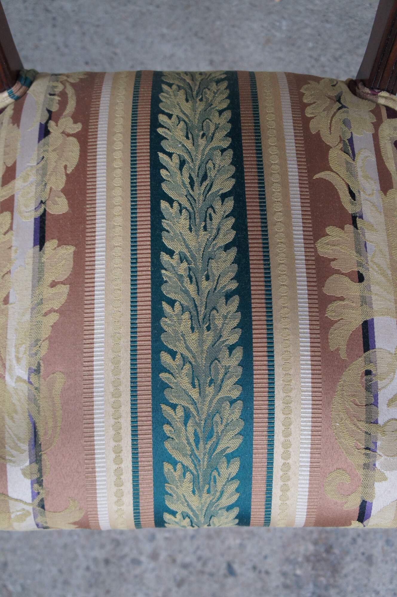 8 Antique English Regency Dining Chairs, C. 1820s. Features a mahogany frame with rope twisted back and stately acanthus leaf floral striped seat. Front legs are turned tapered and ribbed. Rear legs are squared with a saber shape. Includes two arm chairs showcasing fluted downswept arms.