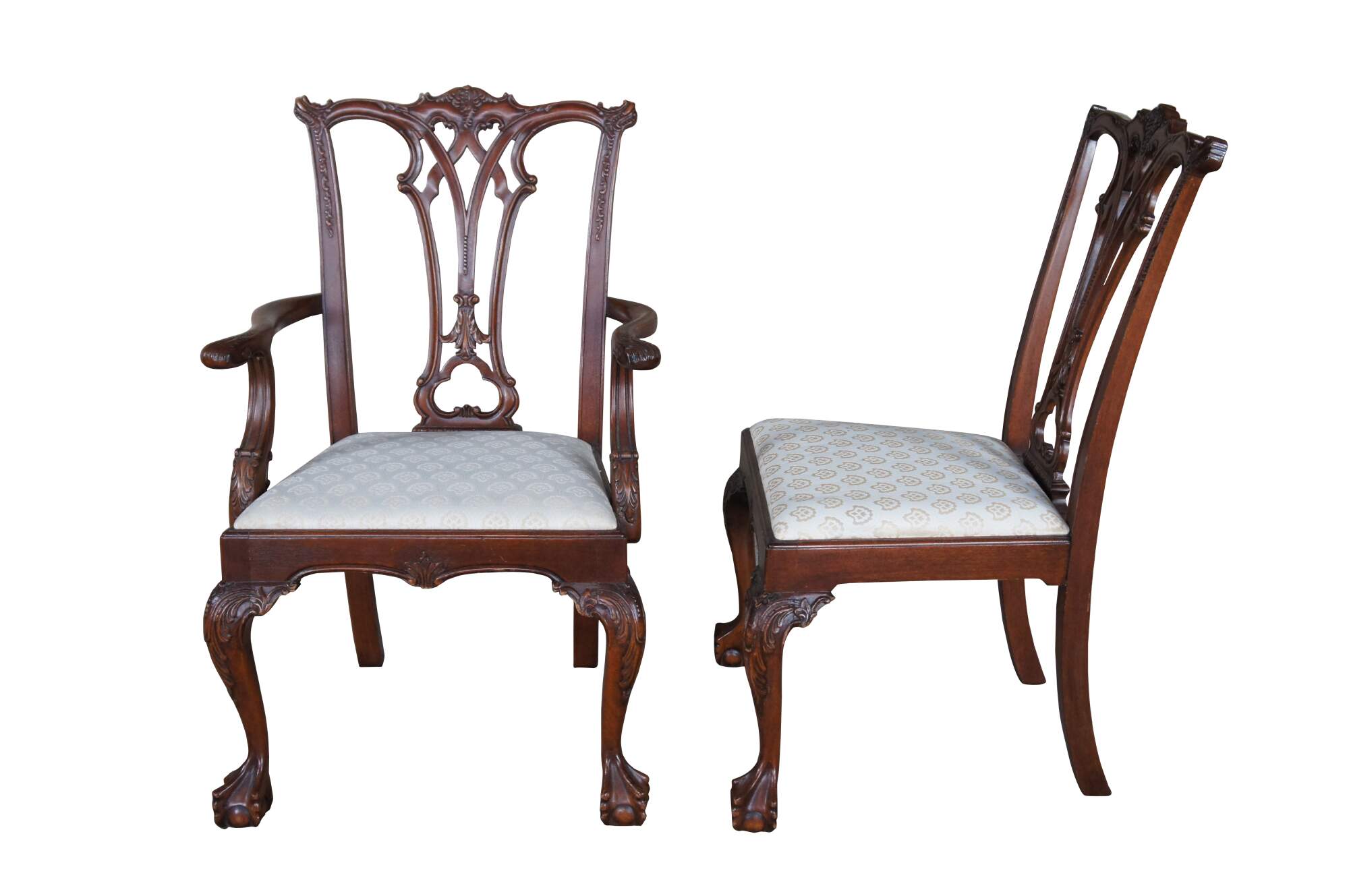 Set of 12 Vintage Chippendale style dining chairs, circa 1970s. Features a mahogany frame with serpentine crest rail carved along the ear over an interlaced back splat leading to a scalloped fabric seat. The chair is supported by cabriole legs with acanthus-carved knees leading to ball and claw feet. Seat cushions are removable allowing for ease of re-upholstery.