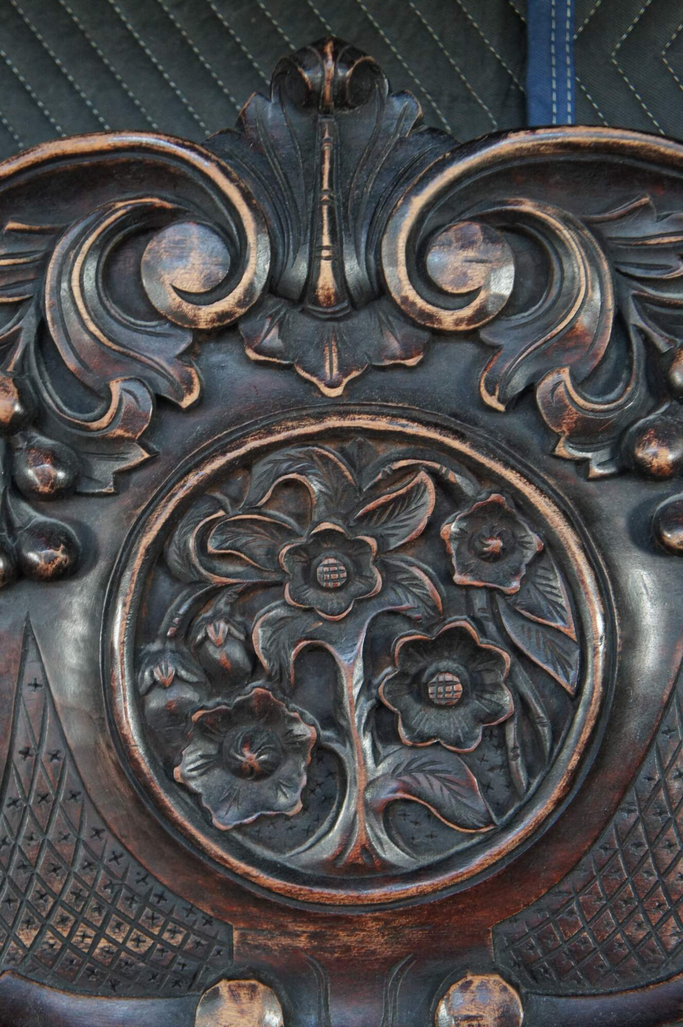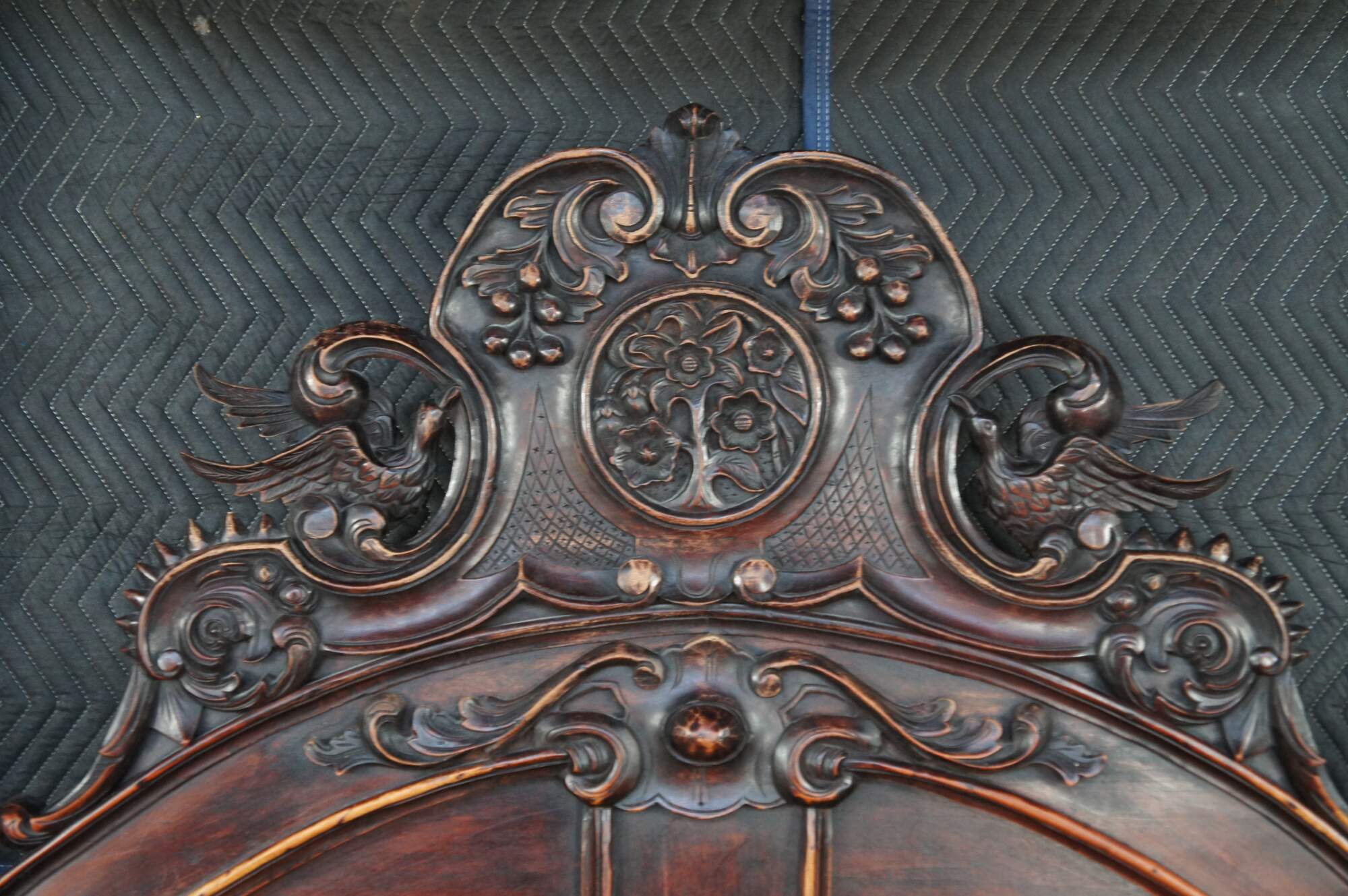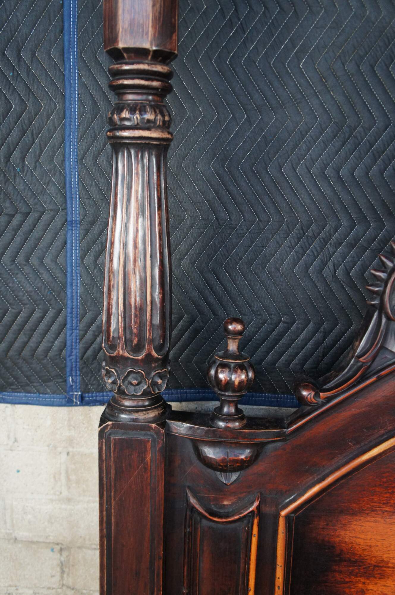 Good Condition; some finish wear and edge wear from use and age, rubbing to the finish on the two back panesl of the headboard. Small split on the left side of the back board (doesn't affect structure)