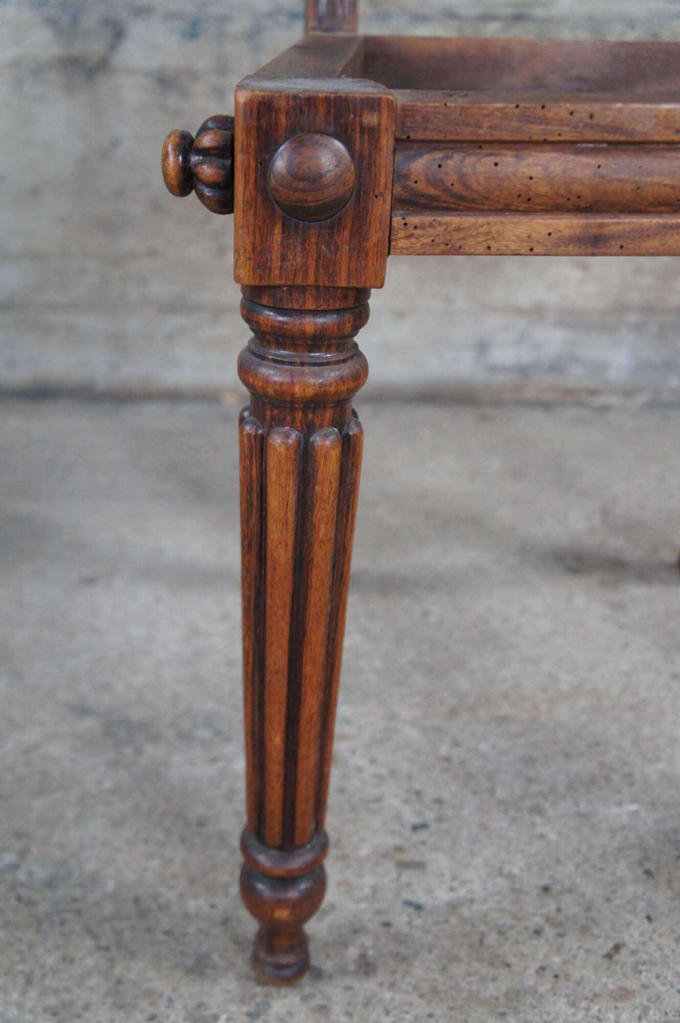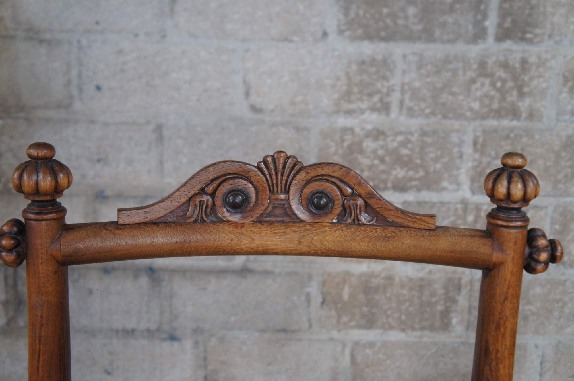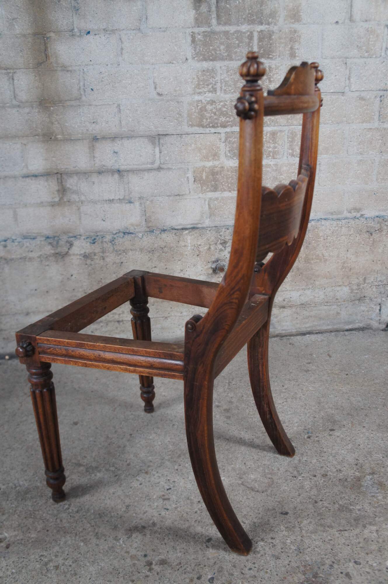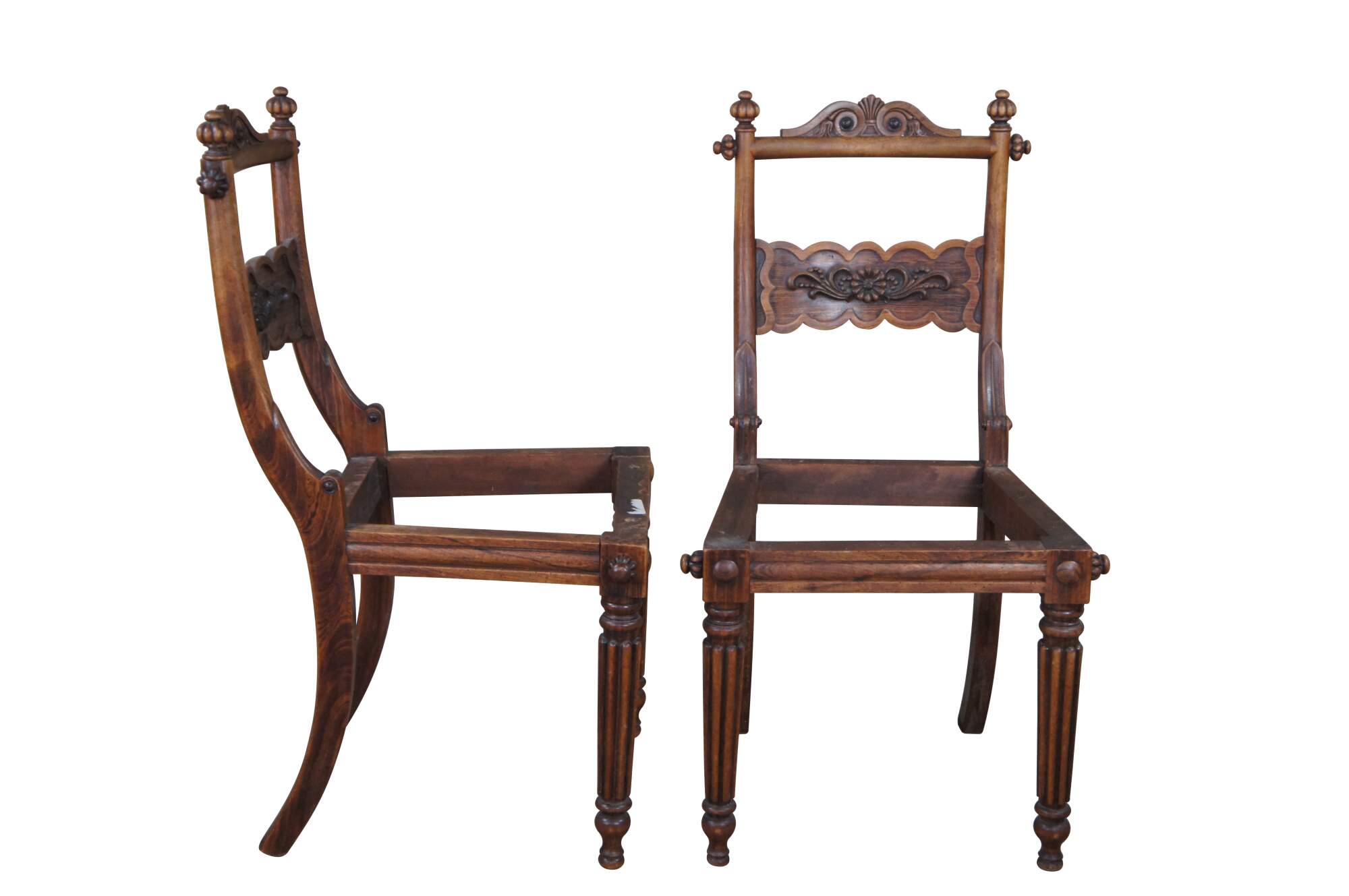 Impressive pair of English Regency side chairs, circa 1820. Constructed from rosewood with intricately carved crest rails and backs. The chairs are supported by reeded legs leading to an arrow foot along the front and saber legs the rear.