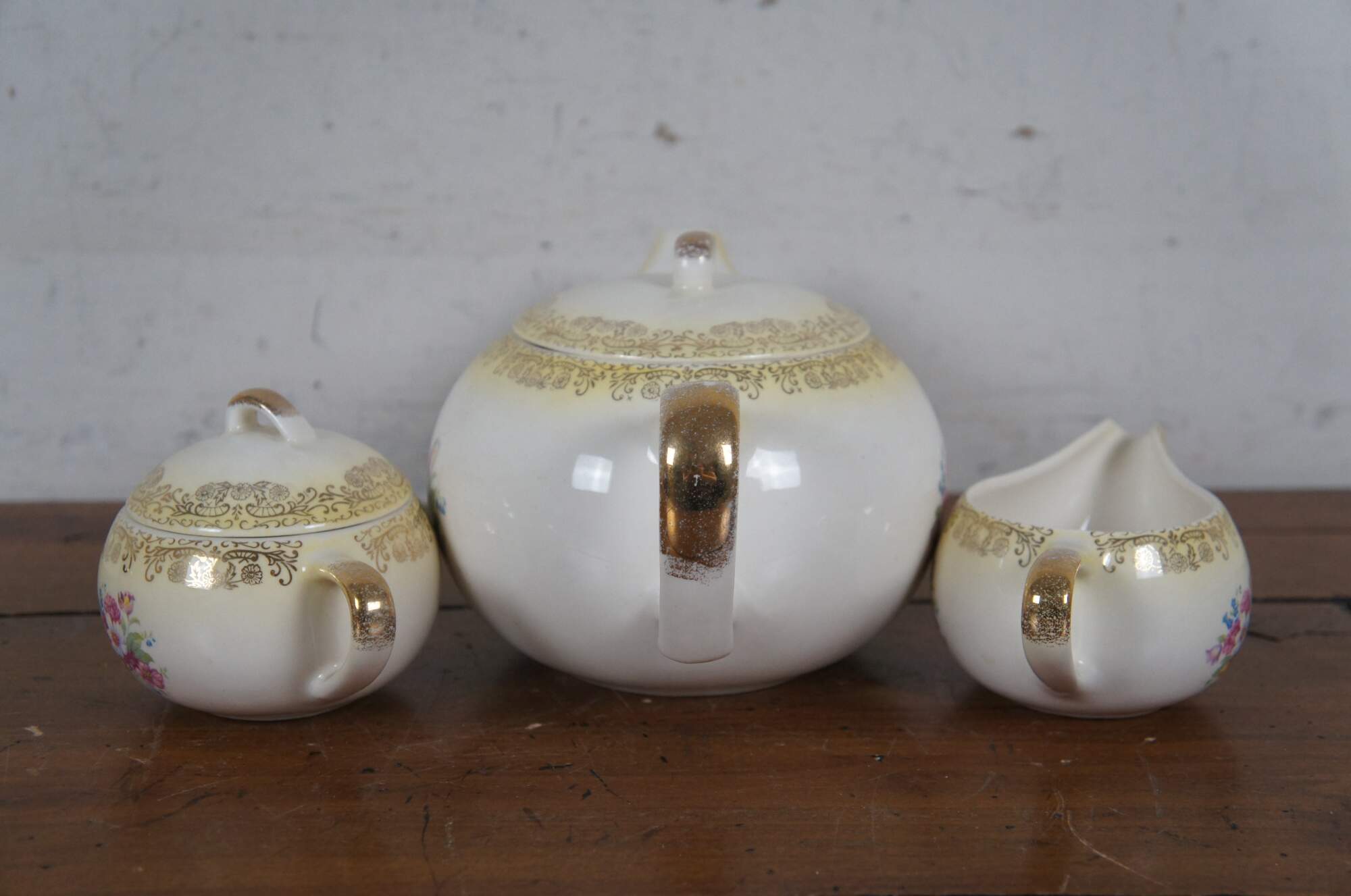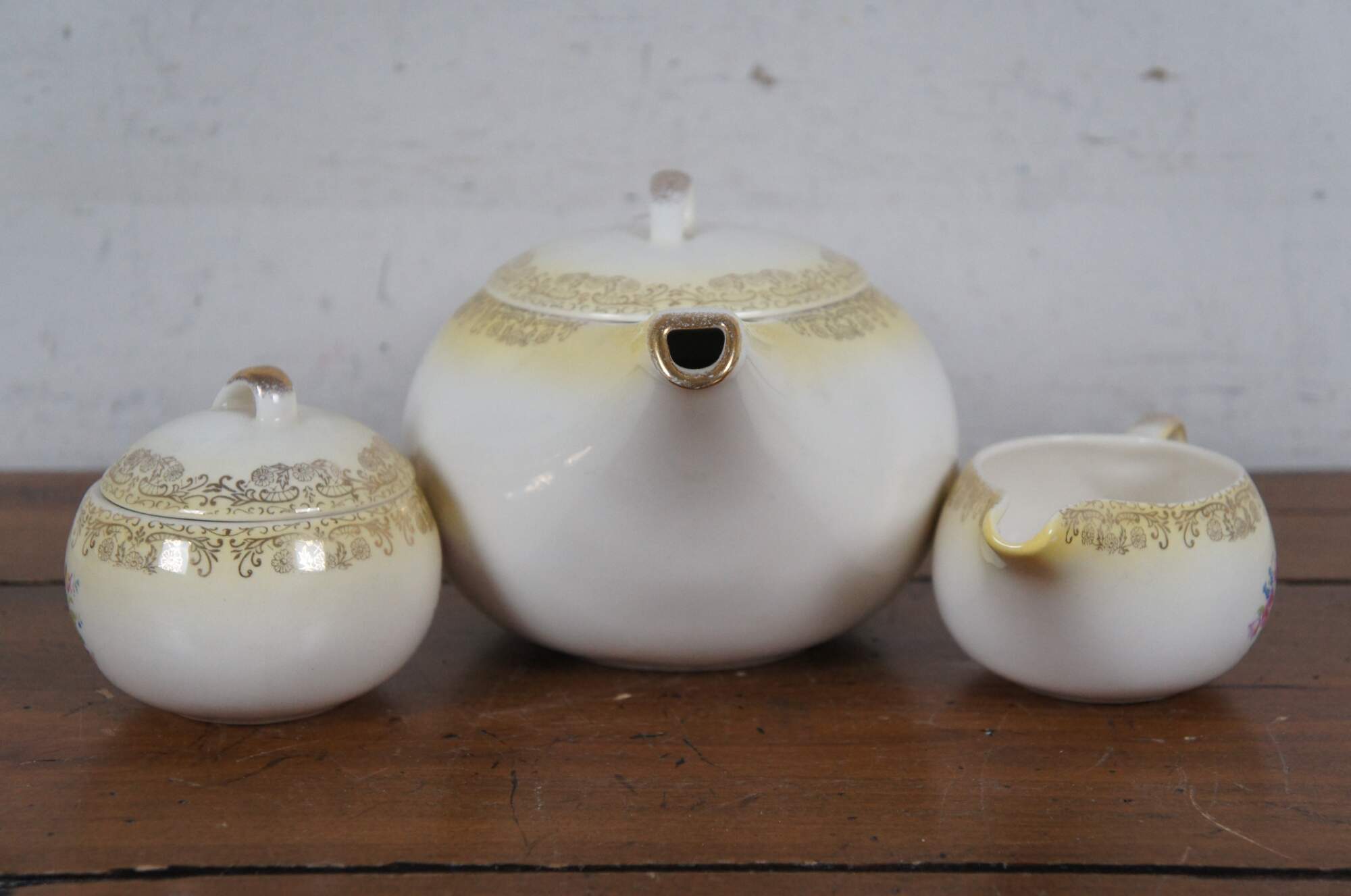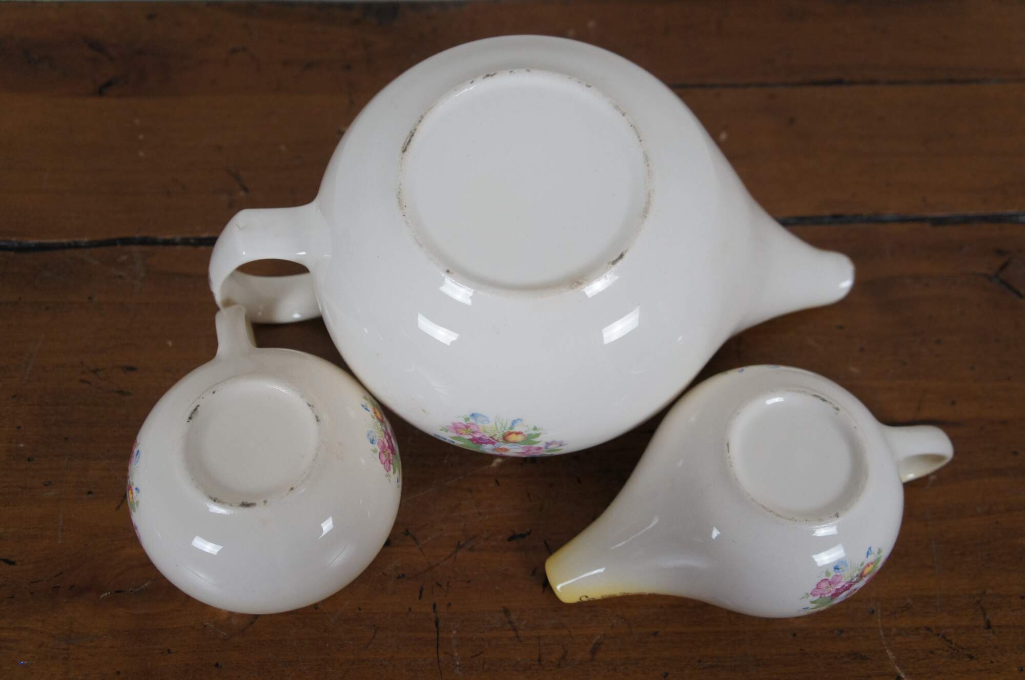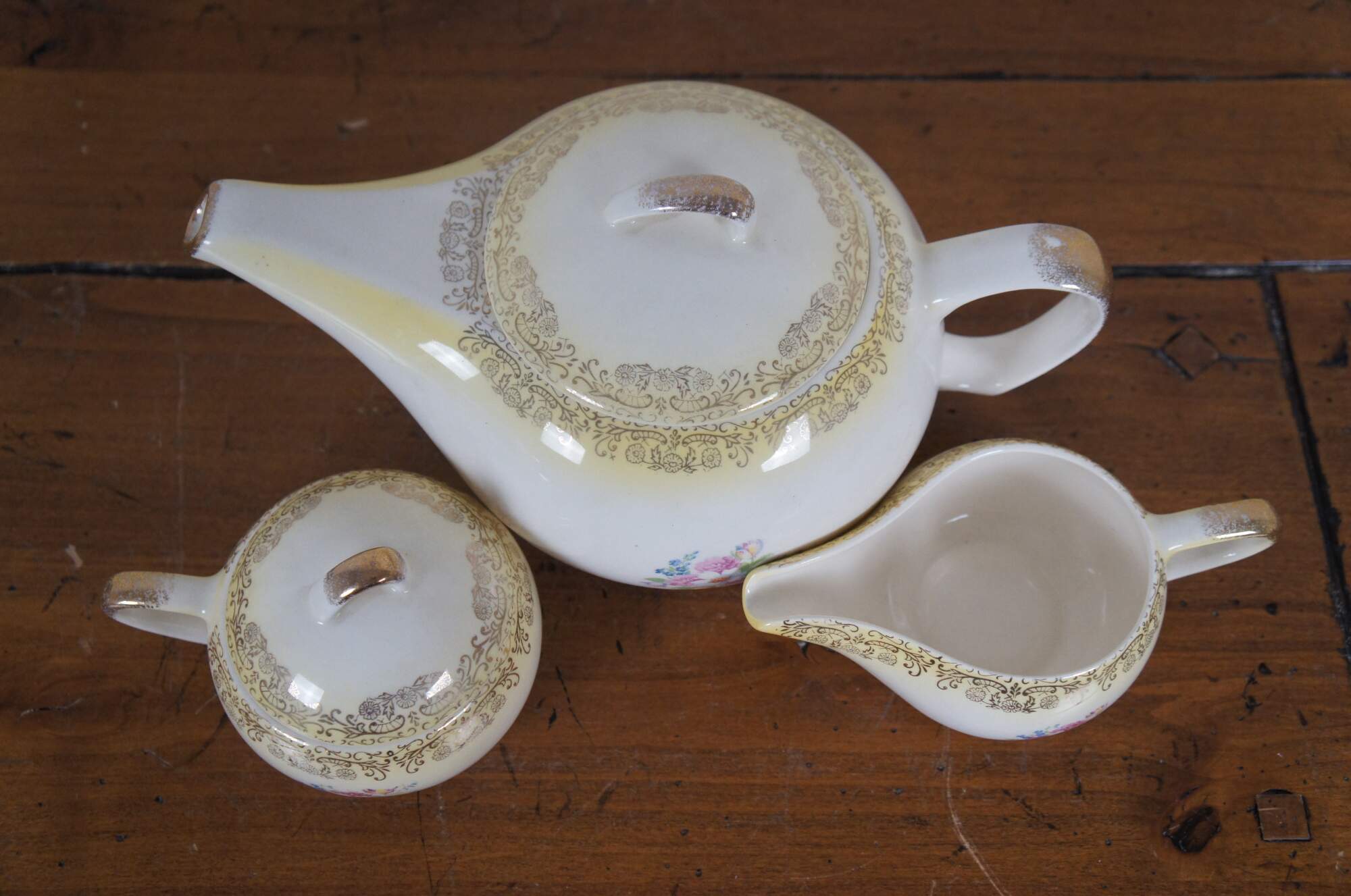 Circa 1940's ceramic demitasse tea or coffee set attributed to Canonsburg Pottery - The Hallmark of Quality. Includes lidded teapot, lidded sugar bowl, and creamer. Pattern featured a yellow flush at the top edges, gilded floral trim, and applied bouquets of multi-color flowers. Design attributed to Paden City Pottery.