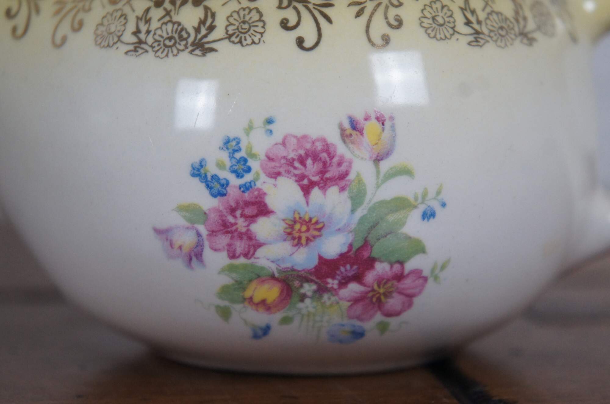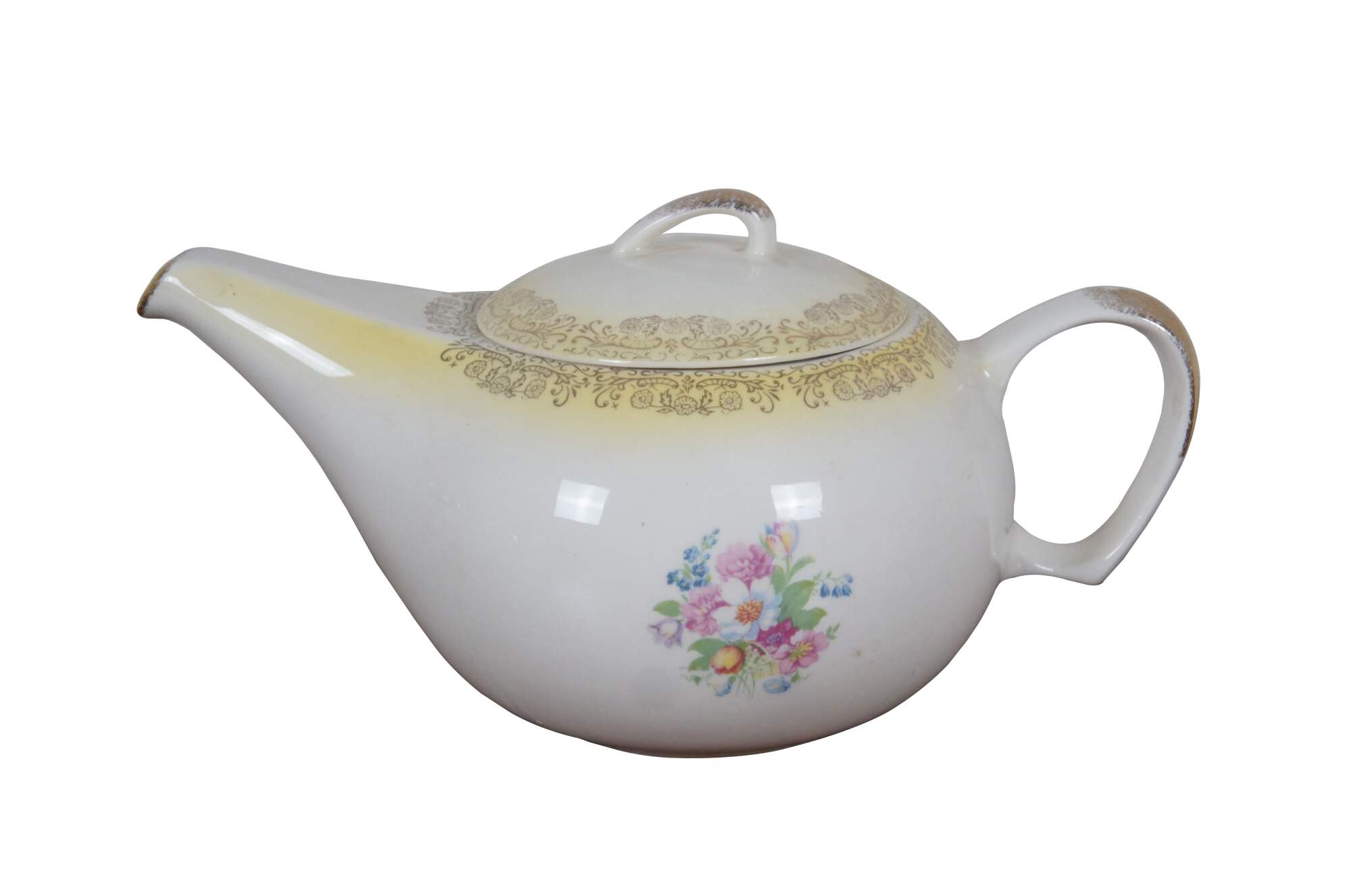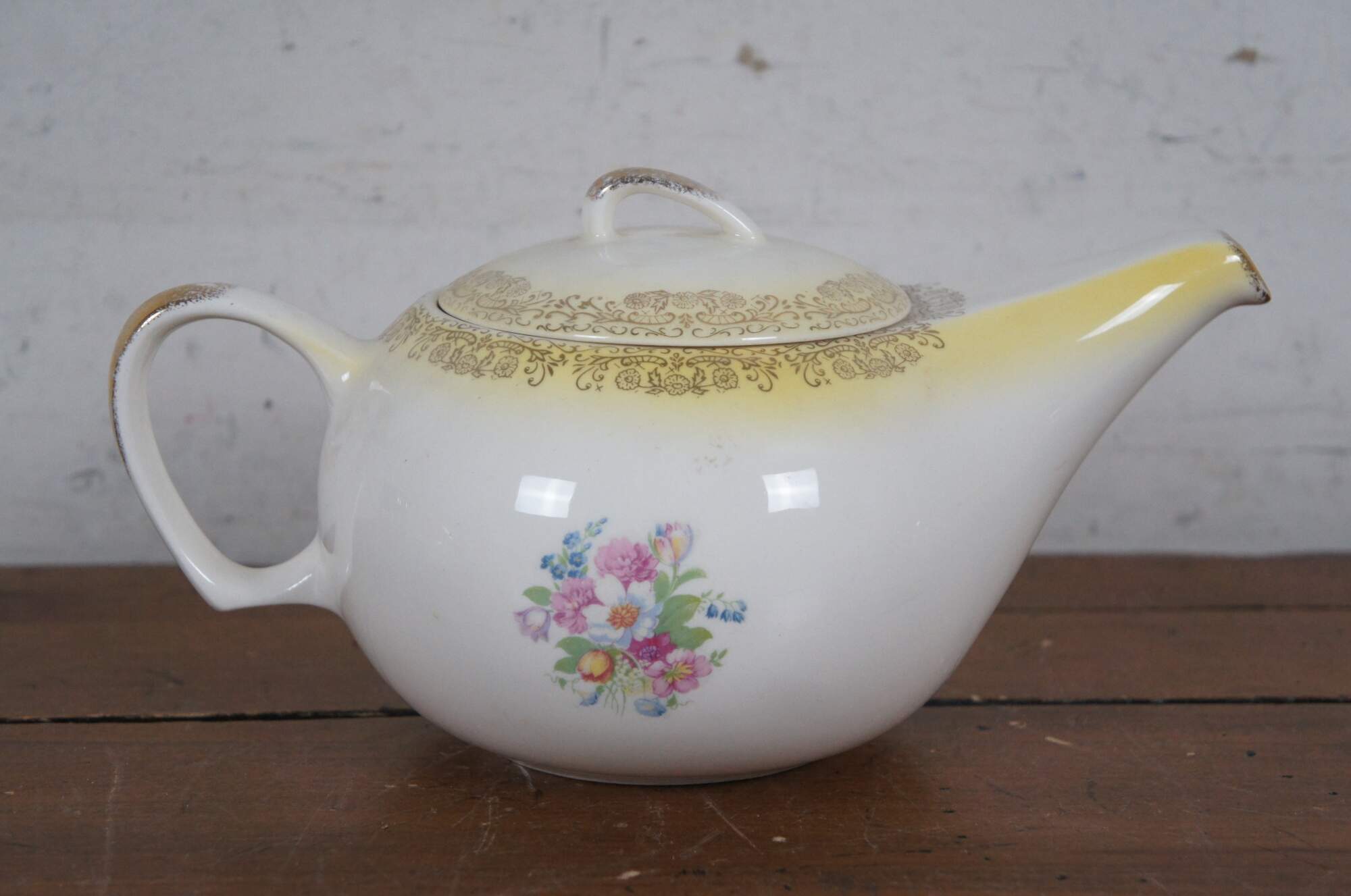 Circa 1940's ceramic demitasse tea or coffee set attributed to Canonsburg Pottery - The Hallmark of Quality. Includes lidded teapot, lidded sugar bowl, and creamer. Pattern featured a yellow flush at the top edges, gilded floral trim, and applied bouquets of multi-color flowers. Design attributed to Paden City Pottery.