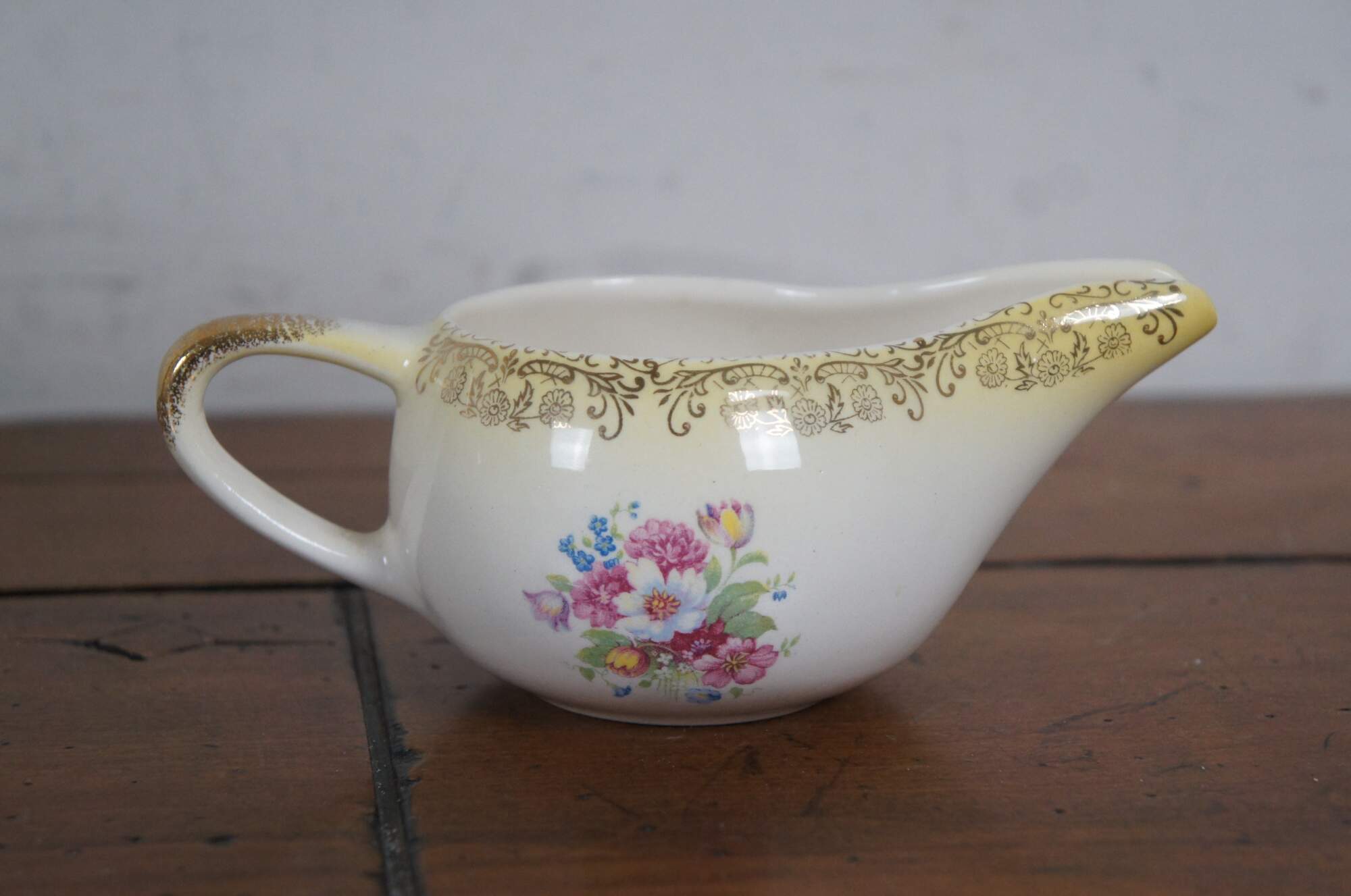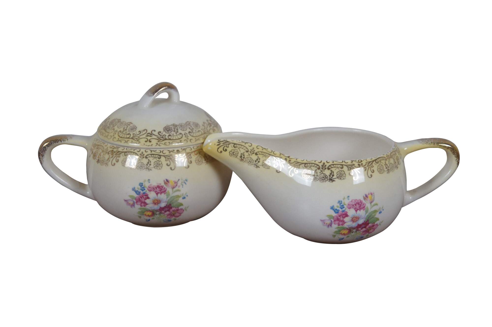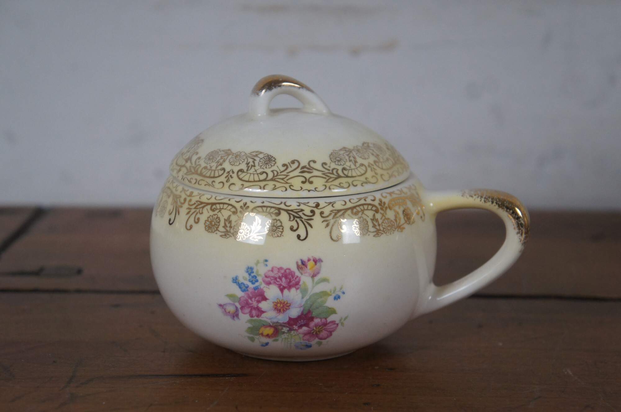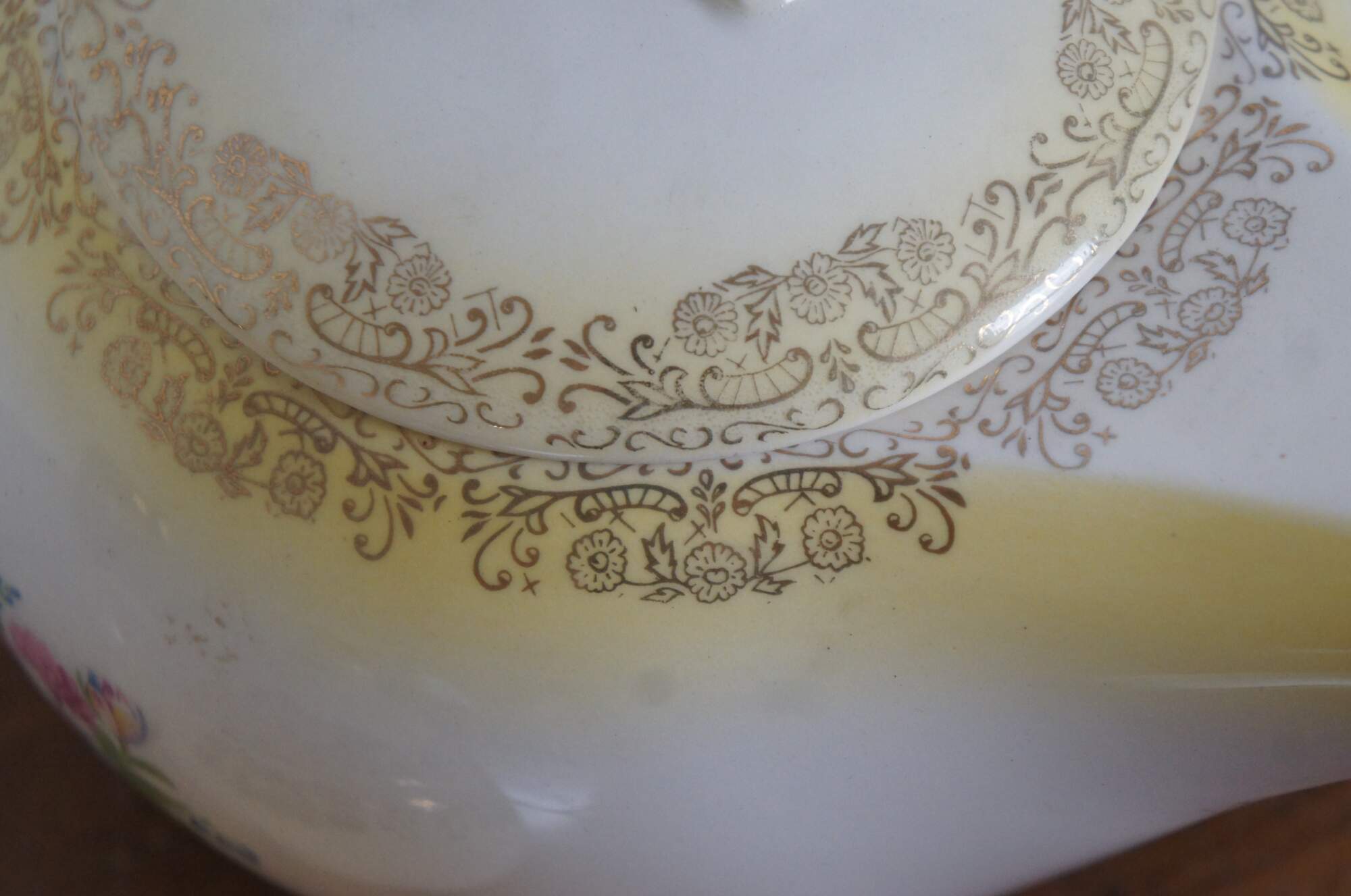 Circa 1940's ceramic demitasse tea or coffee set attributed to Canonsburg Pottery - The Hallmark of Quality. Includes lidded teapot, lidded sugar bowl, and creamer. Pattern featured a yellow flush at the top edges, gilded floral trim, and applied bouquets of multi-color flowers. Design attributed to Paden City Pottery.