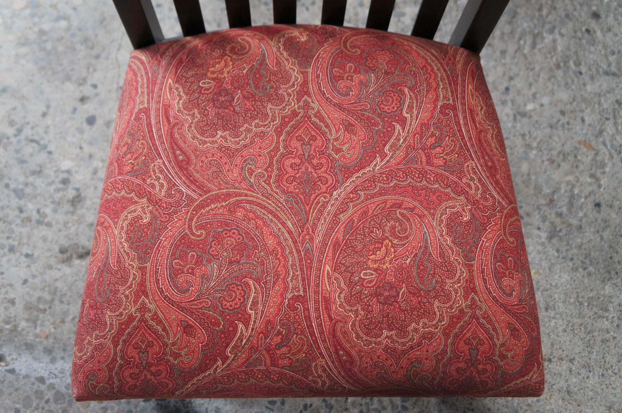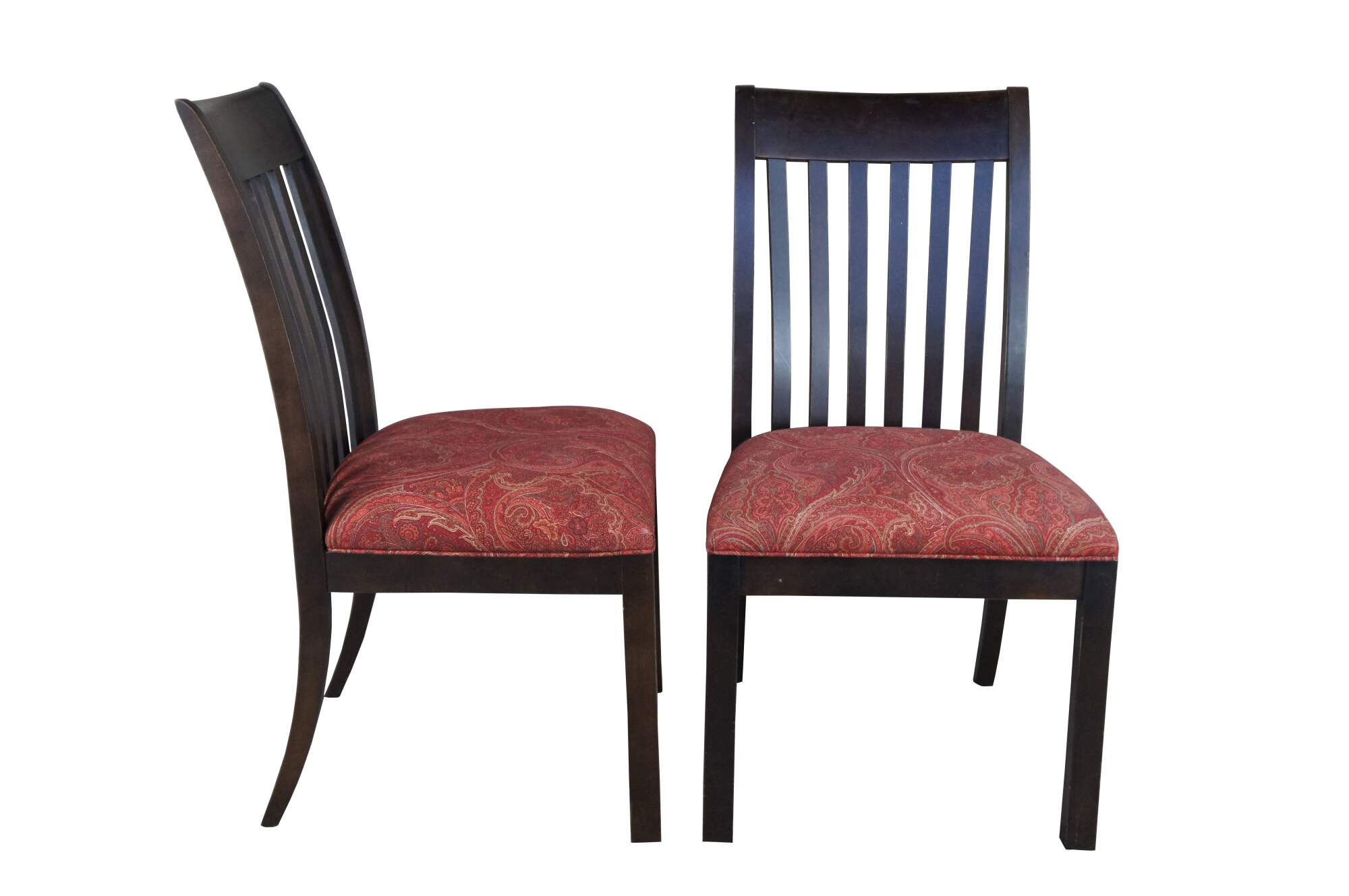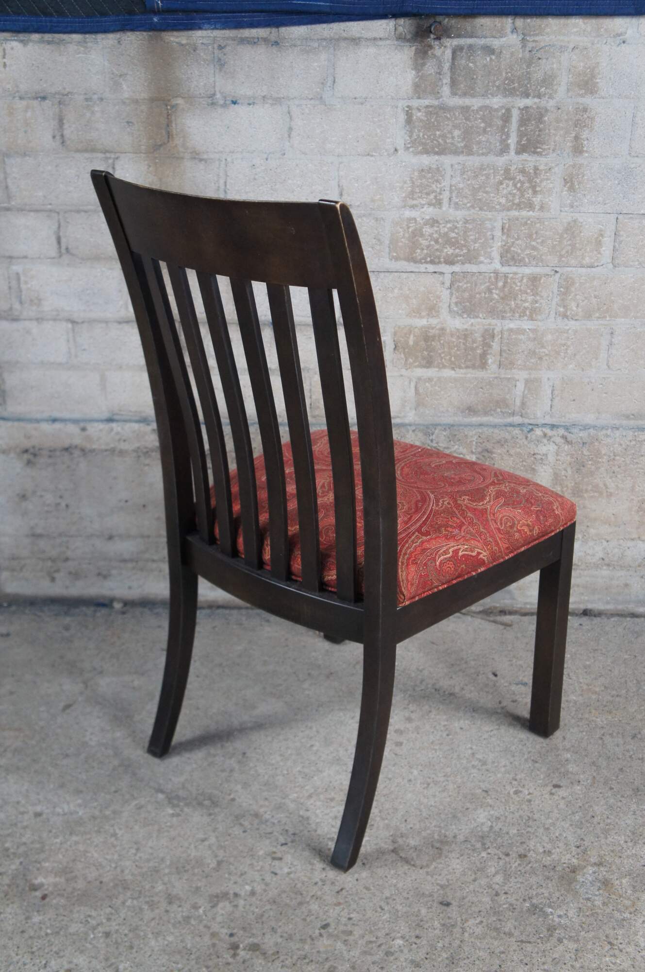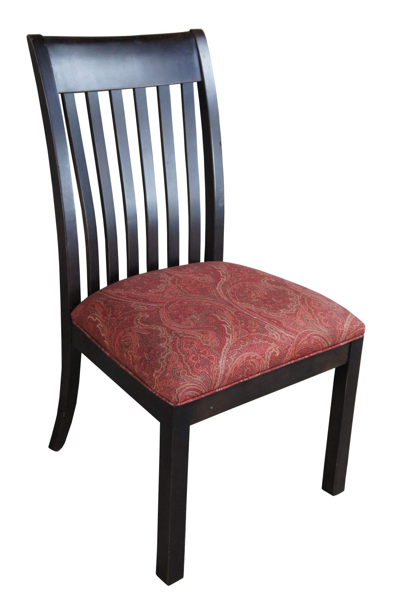 4 Ethan Allen American Artisan Dining Chairs #22-6002. Features a dark maple finish with slat back and red paisley upholstered seats.