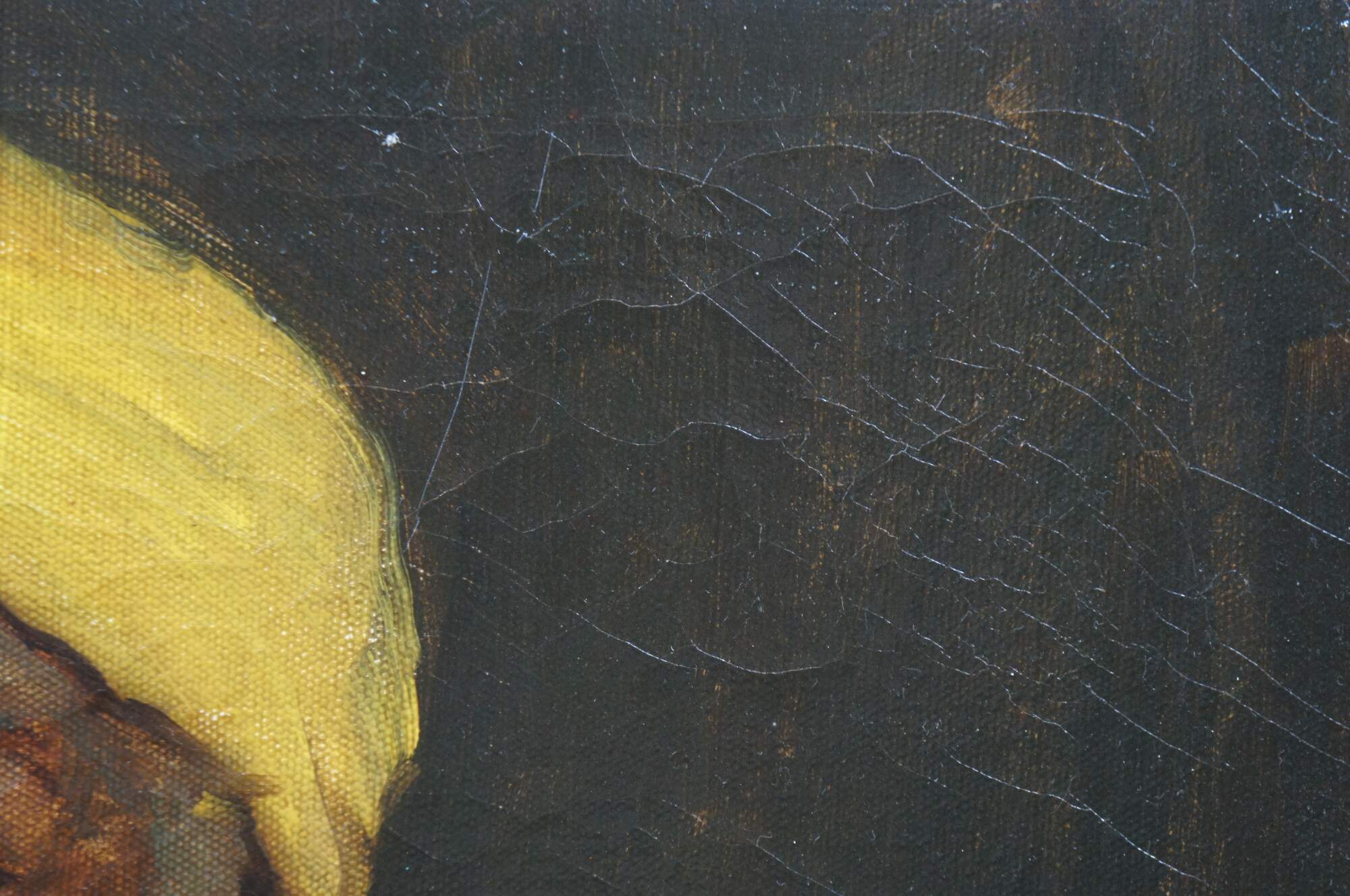 Mid 20th century oil on canvas portrait painting by John Ellsworth Weis, depicting a man of Turk / Turkish / .African descent dressed in a red robe and yellow cap / turban. Signed in lower right corner. Wooden frame with beveled, golden inner and outer edges. Brass plaque with artist's name at lower edge of frame.