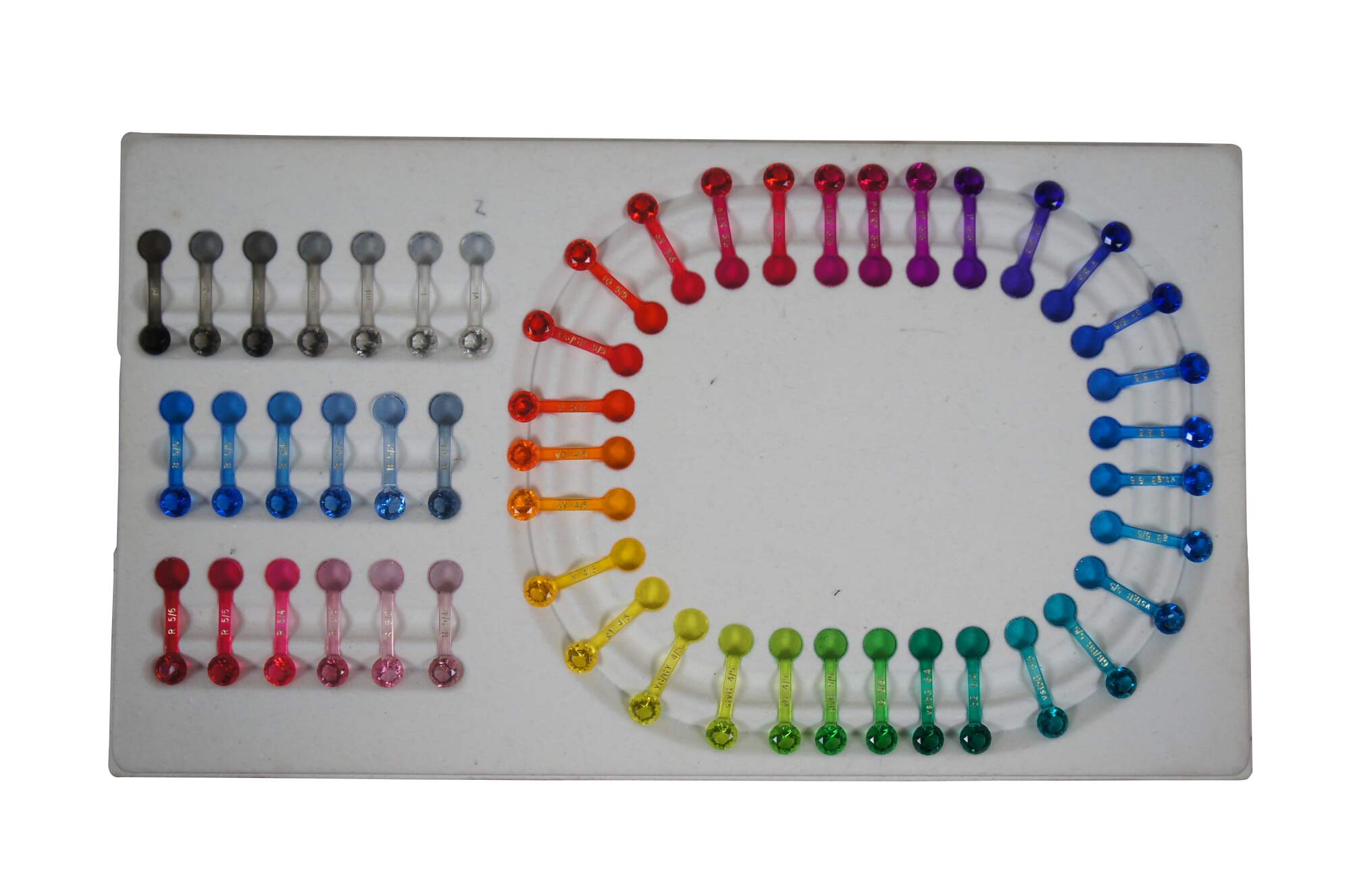 Rare discontinued, late 20th century, Pantone / GIA Hue Wheel GemSet. Set of 50 gem shaped paddles for use in color grading of natural gemstones by jewelers and gemologists. White fabric covered plastic base with black hard plastic cover.