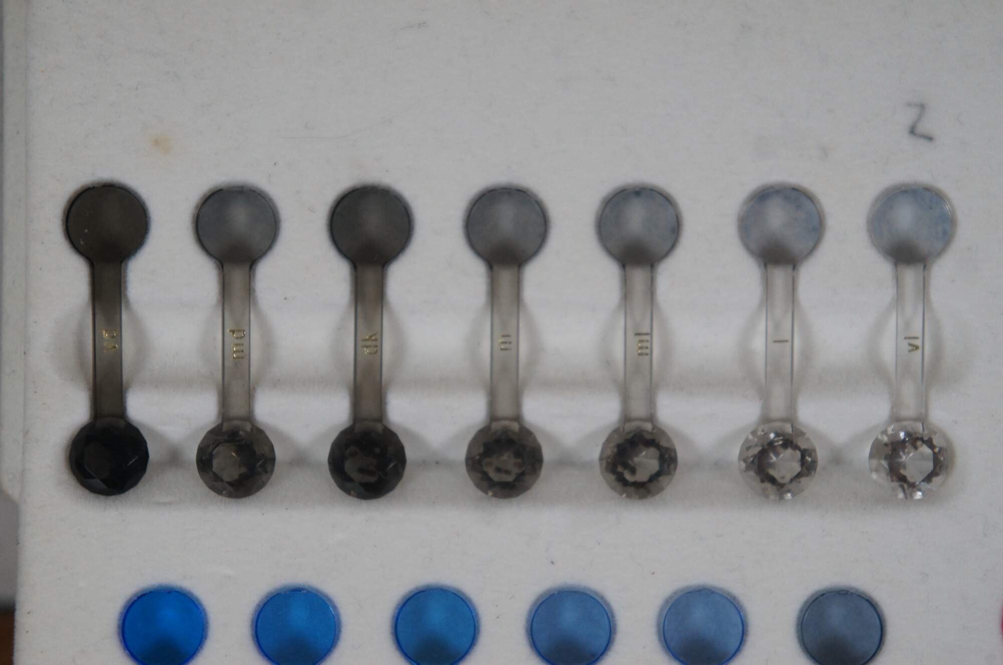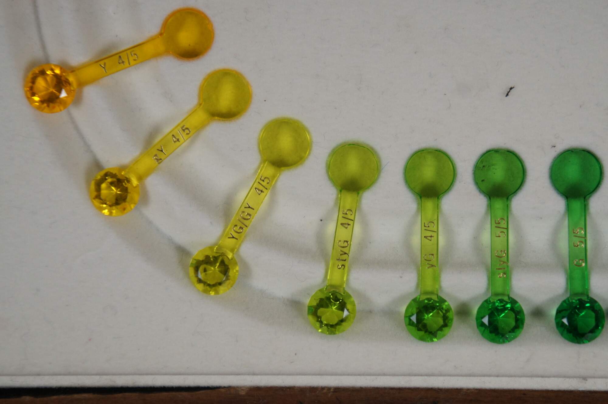 "The Gemological Institute of America (GIA) used to distribute plastic color masters created by Pantone as a color grading reference for the Colored Gems Industry. They argued that the plastic comparison "gems" gave a more realistic representation of color than any flat media could. Used in combination with Normalised Color Wheel, Tone and Saturation Scale this was the perfect instrument combination before the apparition of Computarized System like Gemewizard which is able nowadays to identify "on a click" 1116 Colors Classifying 31 Hue's on 6 Tones and 6 Levels of Saturations. The Complete version included 324 Color Samples on a three trays storage case. The most common version seems to be the "Hue Wheel" GemSet. In 2007, X-Rite acquired Pantone, the company making the color masters. Thus, unfortunately, they are no longer produced." (Source: Internatinal Gem society / Dominican Amber Fossils)