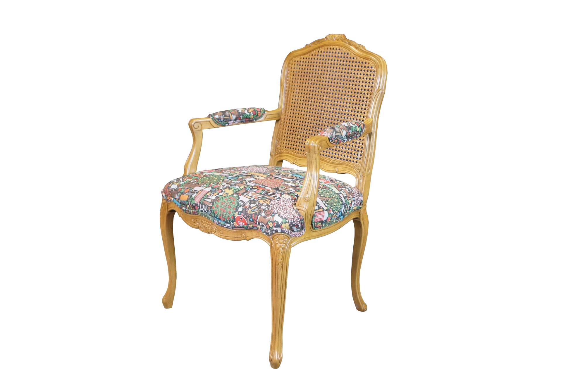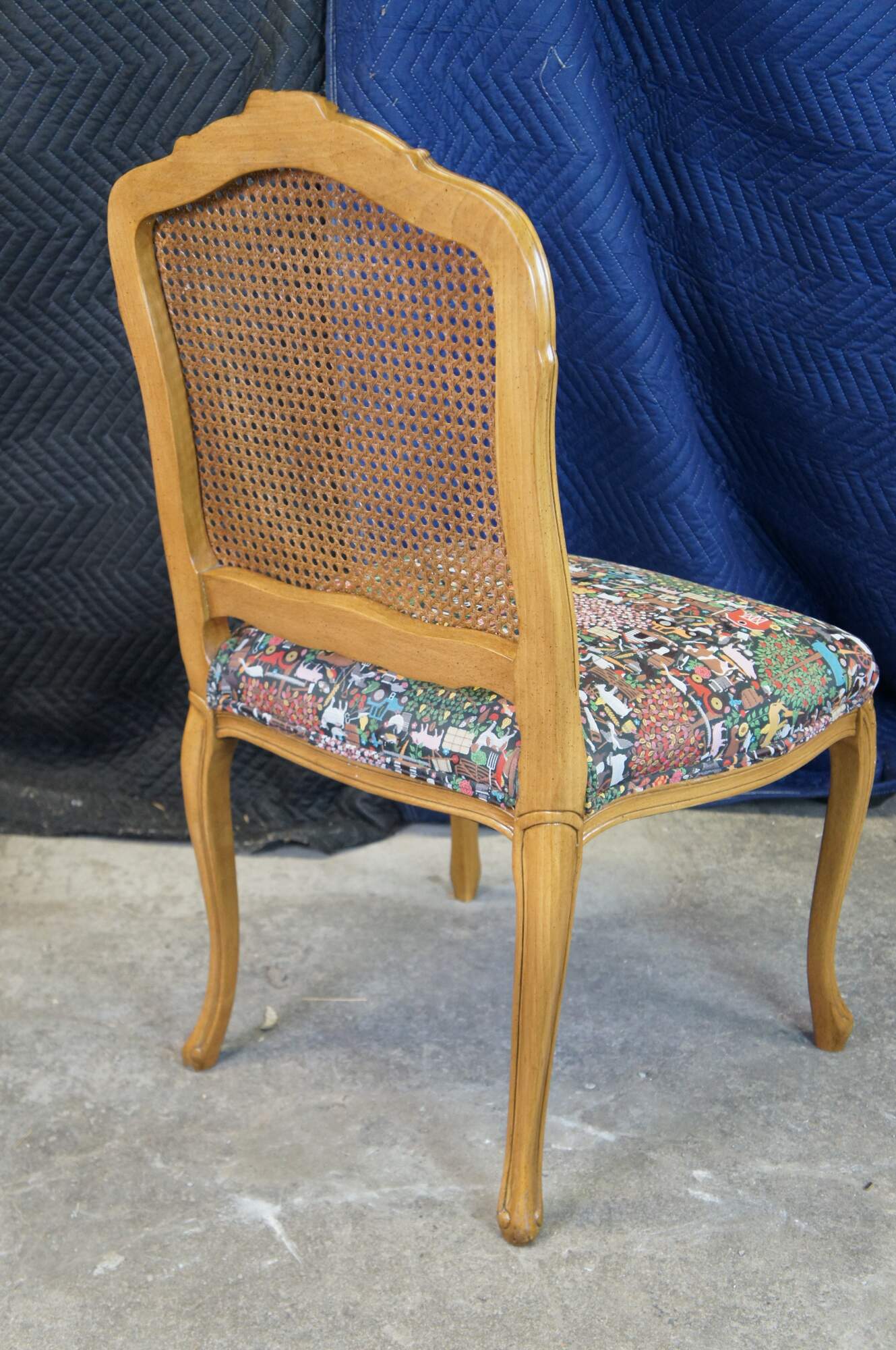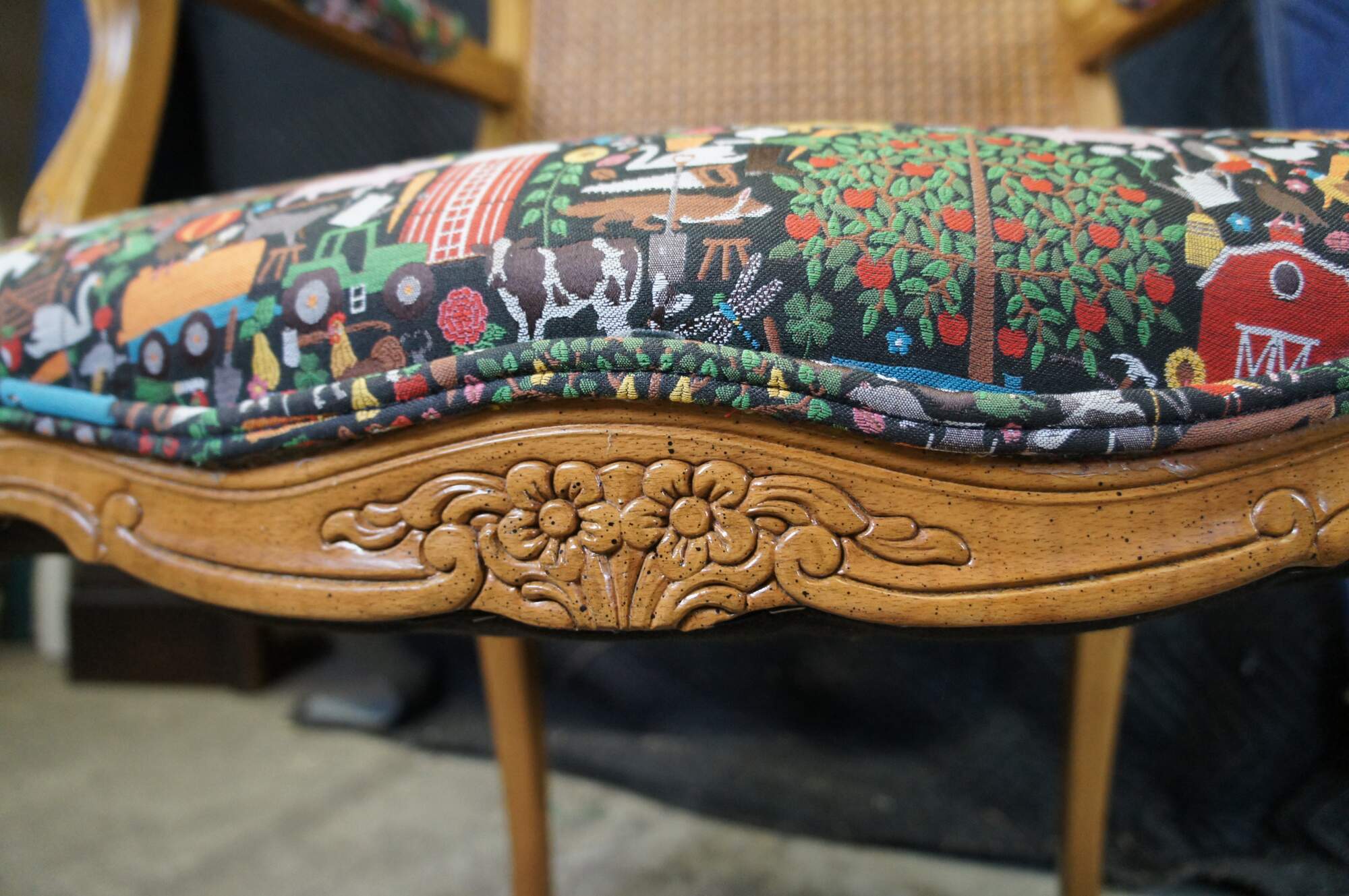 Eight vintage French Louis XV style dining chairs. Made of walnut featuring caned backs with carved floral accents, fauteuil arms and whimsical country farmhouse scenes.
