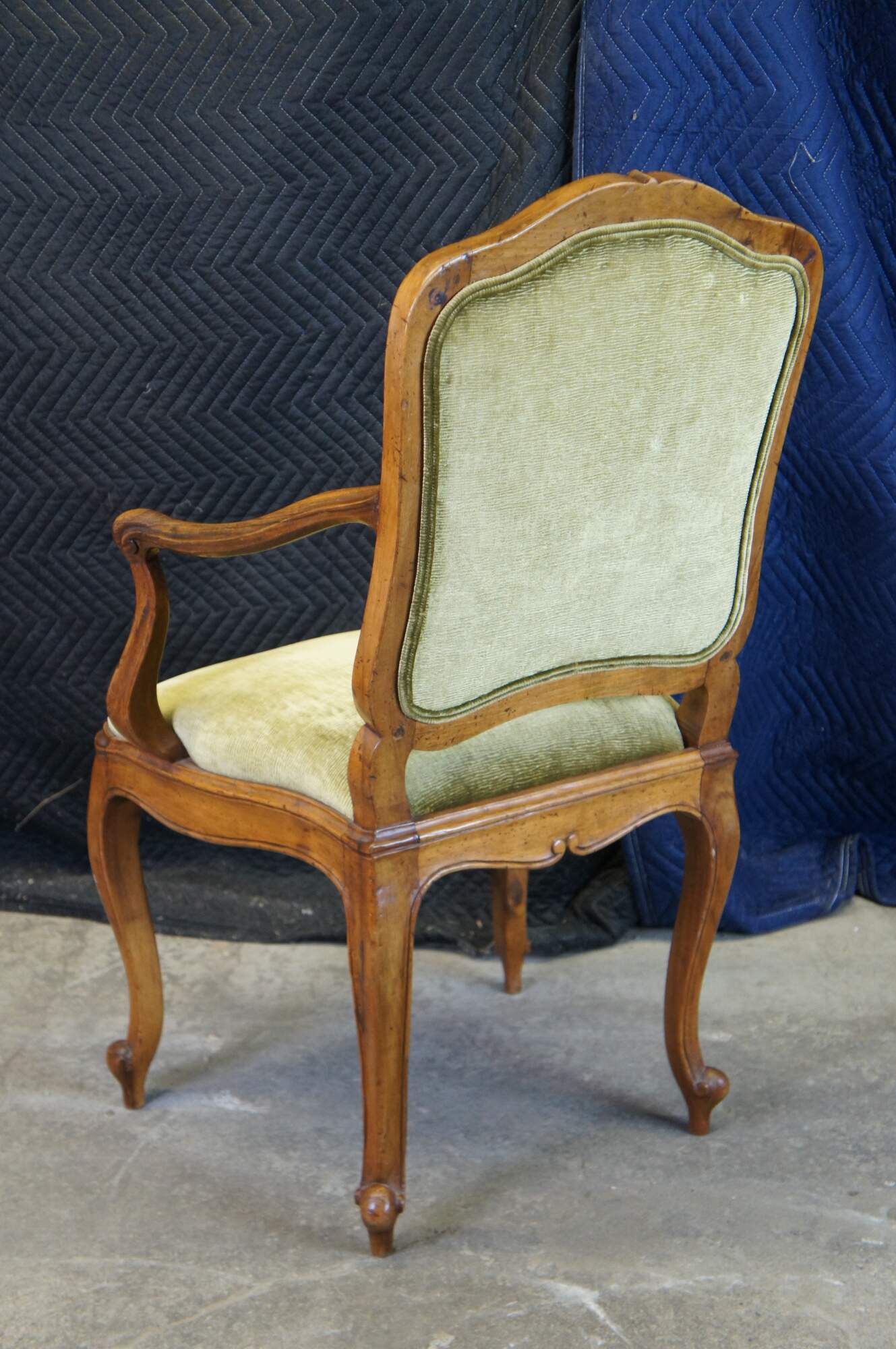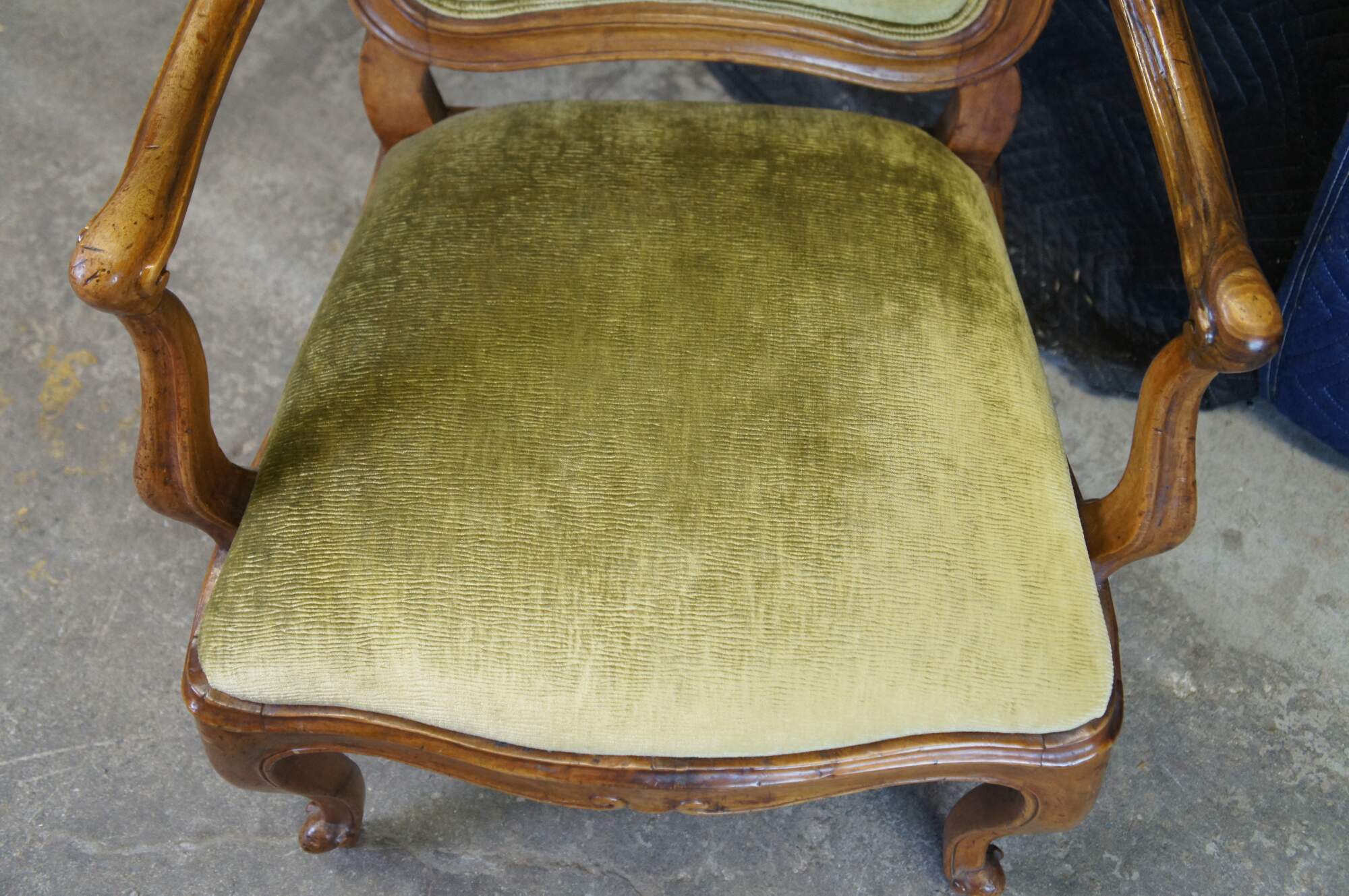 Pair of two vintage Italian dining / library / office arm chairs. Made of walnut feautring Louis XV styling with serpentine form, sloped arms, velvet upholstery and cabriole legs. Made in Italy.