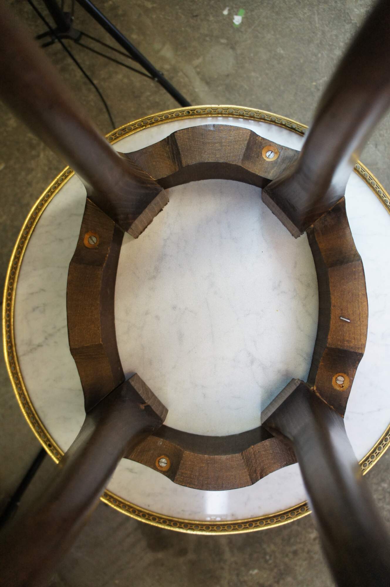 Mid century, circa 1940s, French country side table or plant stand. Made of walnut featuring a white marble top with serpentine accents and cabriole legs.