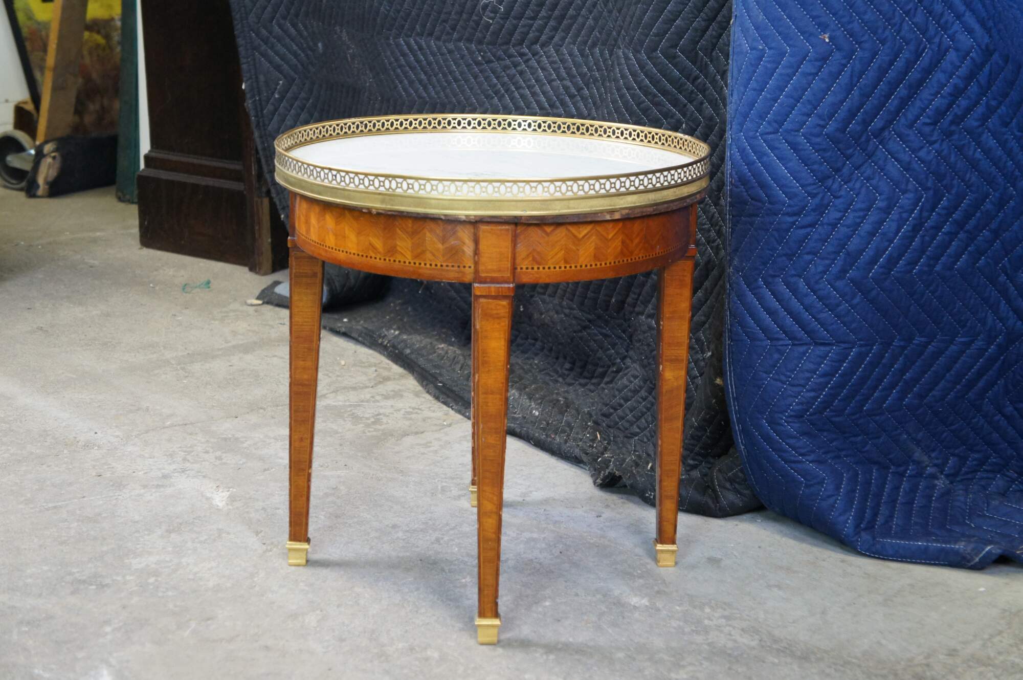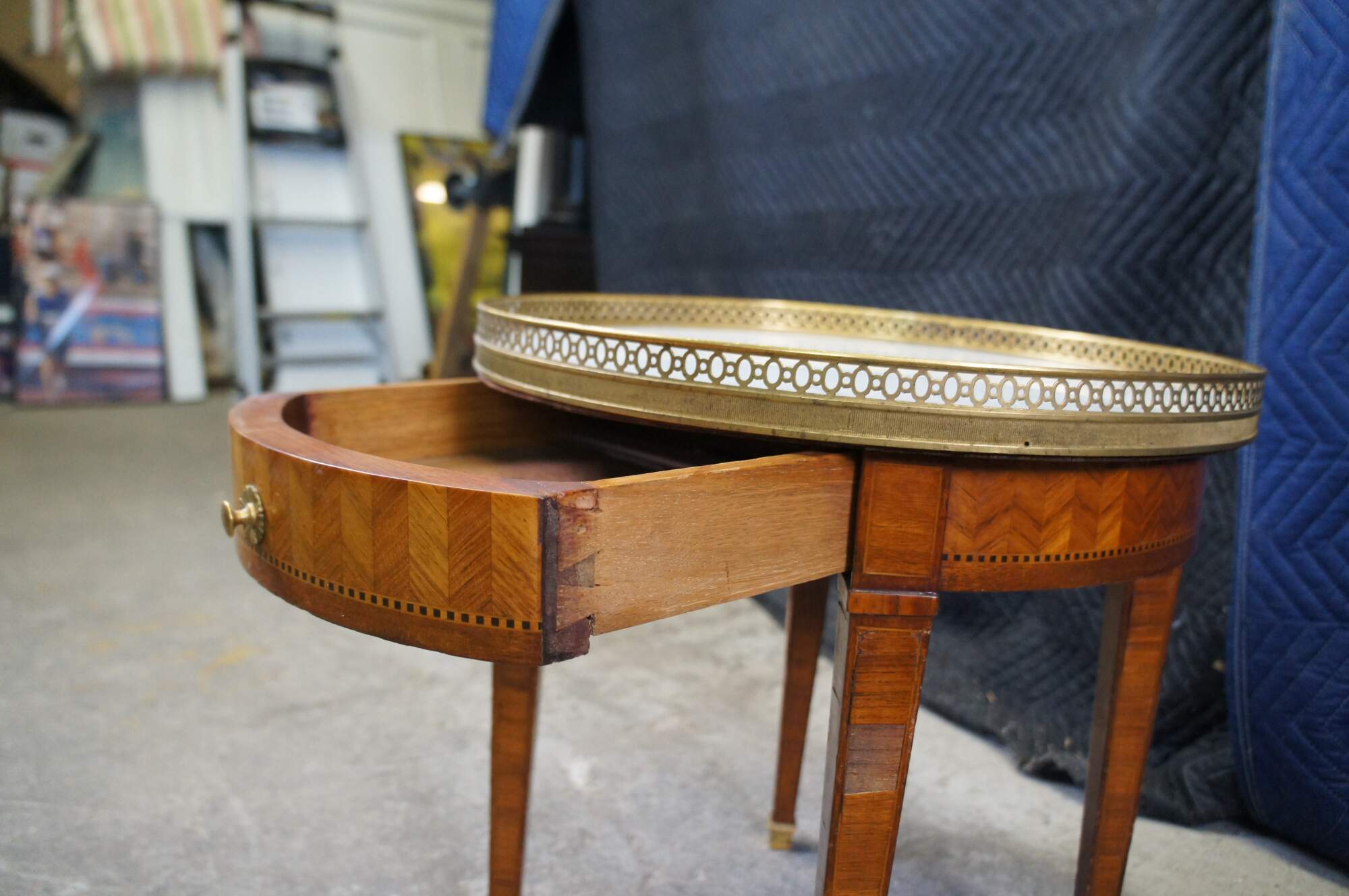 Antique early 20th century French Louis XV style plant stand or side table. Made of inlaid walnut and ebonized geometric banding with a chevron parquetry design featuring round form with marble top encased by pierced / reticulated gallery over one drawer with tapered legs and brass capped feet.