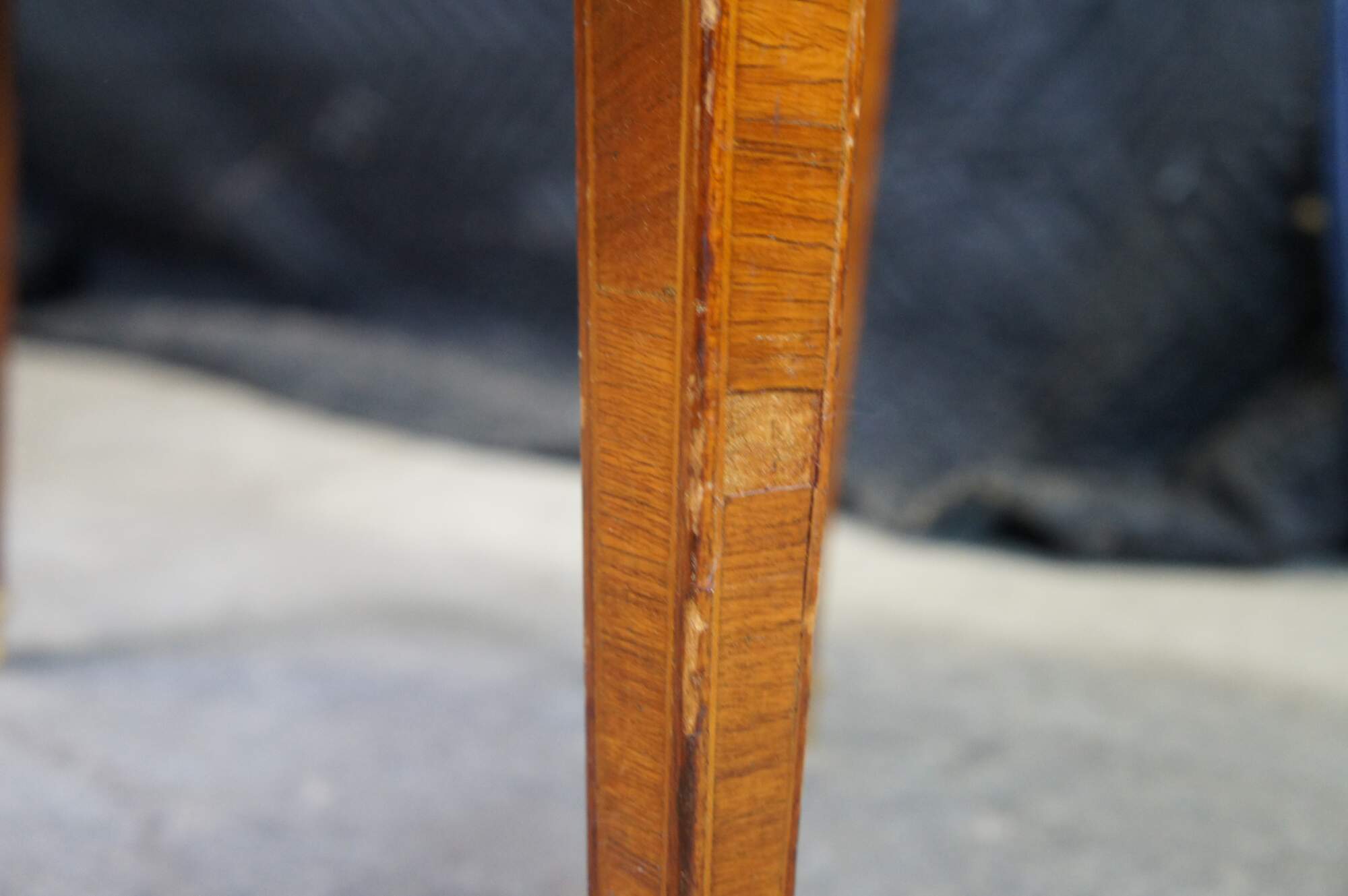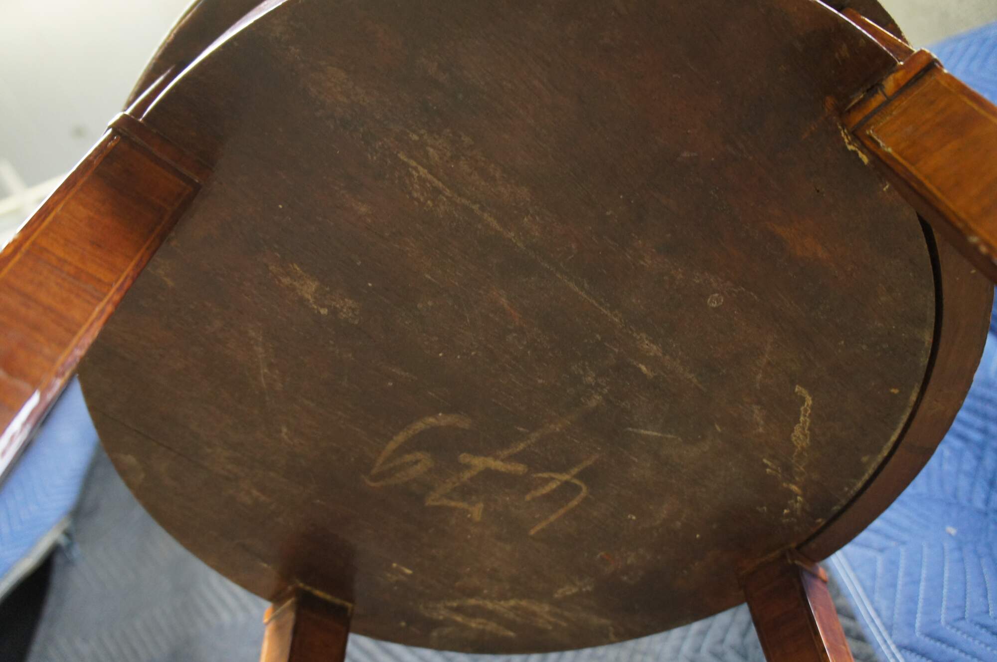 Fair condition, wear and distressing from age and use, warping to gallery, cracked and missing veneer, finish loss, scuffing.
